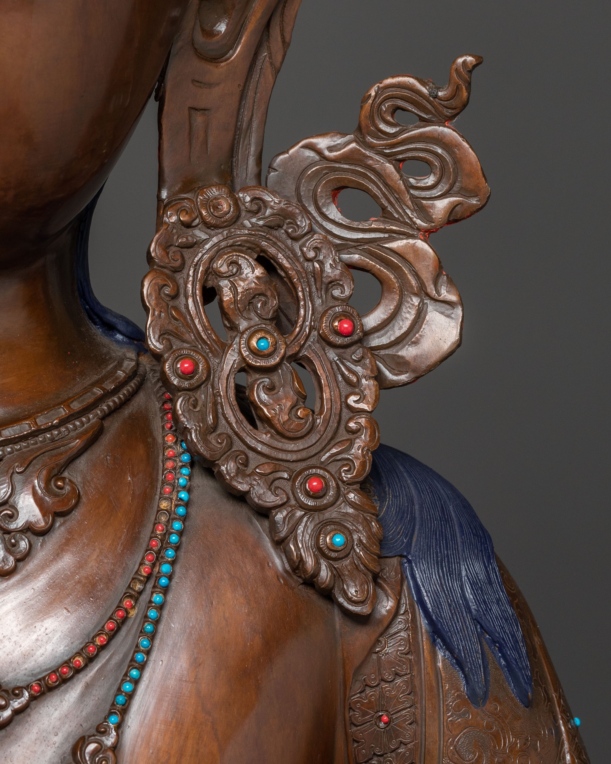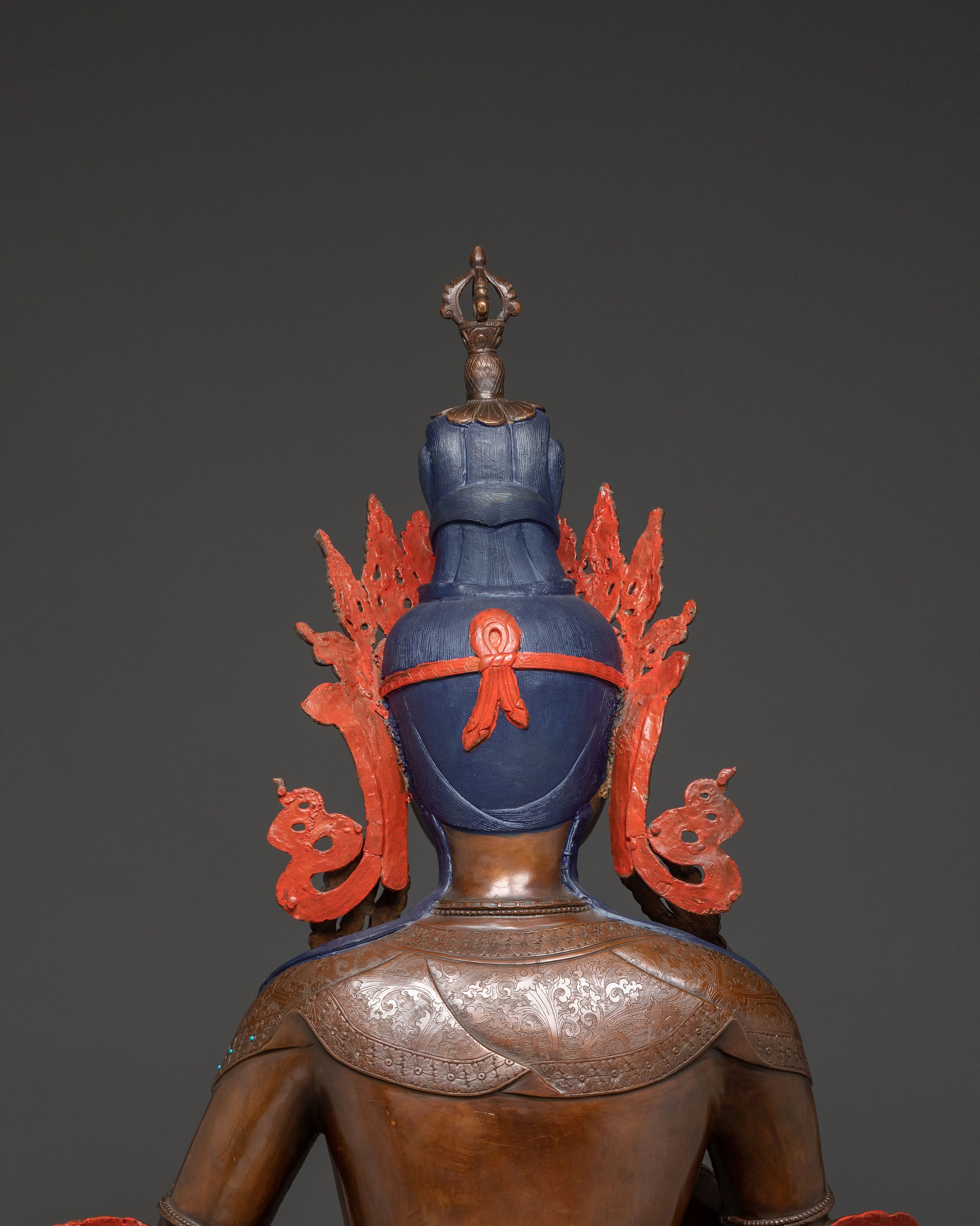 Emerging from the core of Himalayan artistry, this exquisite Vajrasattva statue serves as a striking piece of altar decor. Standing 147.5 cm (58.07”) tall with a base width of 103.5 cm (40.75”), its considerable weight of 103.6 kg highlights its solid quality and detailed craftsmanship. Made from oxidized copper and decorated with intricate acrylic paintings, gemstones, and hand-carved details, the statue is covered with a triple layer of 24K gold gilding and carved with deeply engraved patterns that produce a magnificent 3D-like effect. This combination of artistry and sacred symbolism exudes a calm yet powerful presence, making it a lasting centerpiece for any sacred space.
