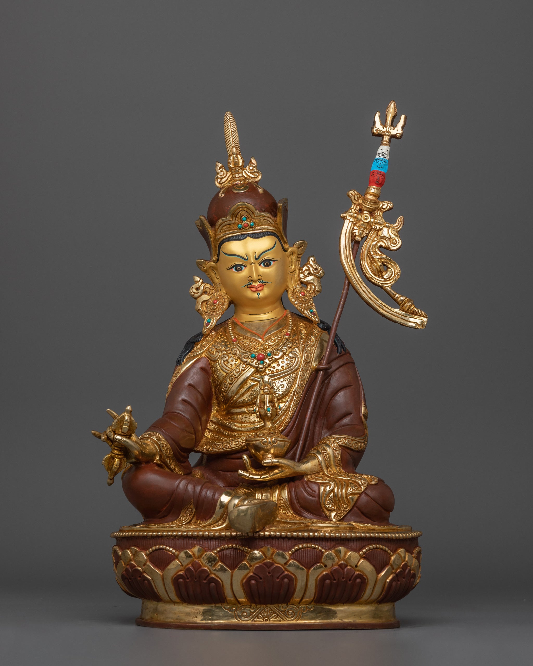 This statue of Tantric Master Guru Rinpoche is 14.4”/36.5cm high and has a base width of 9.4”/24cm. It weighs 3.99 kg and is made from 24K gold gilding, gold and acrylic paintings, an oxidized copper body, and gemstones. Seated on a lotus disc, Padmasambhava embodies purity and enlightenment, showcasing his ability to transcend the distractions and illusions of the material world. His right hand holds the vajra, symbolizing indestructible wisdom that worldly forces cannot shake. In contrast, his left hand holds a skull cup attached to a nectar vase, representing immortality and the offering of wisdom to sentient beings. Additionally, the skull cup symbolizes his mastery over the cycle of birth and death, offering spiritual sustenance to those seeking liberation. In his other hand, he holds the khatvanga trident, a significant and powerful symbol.