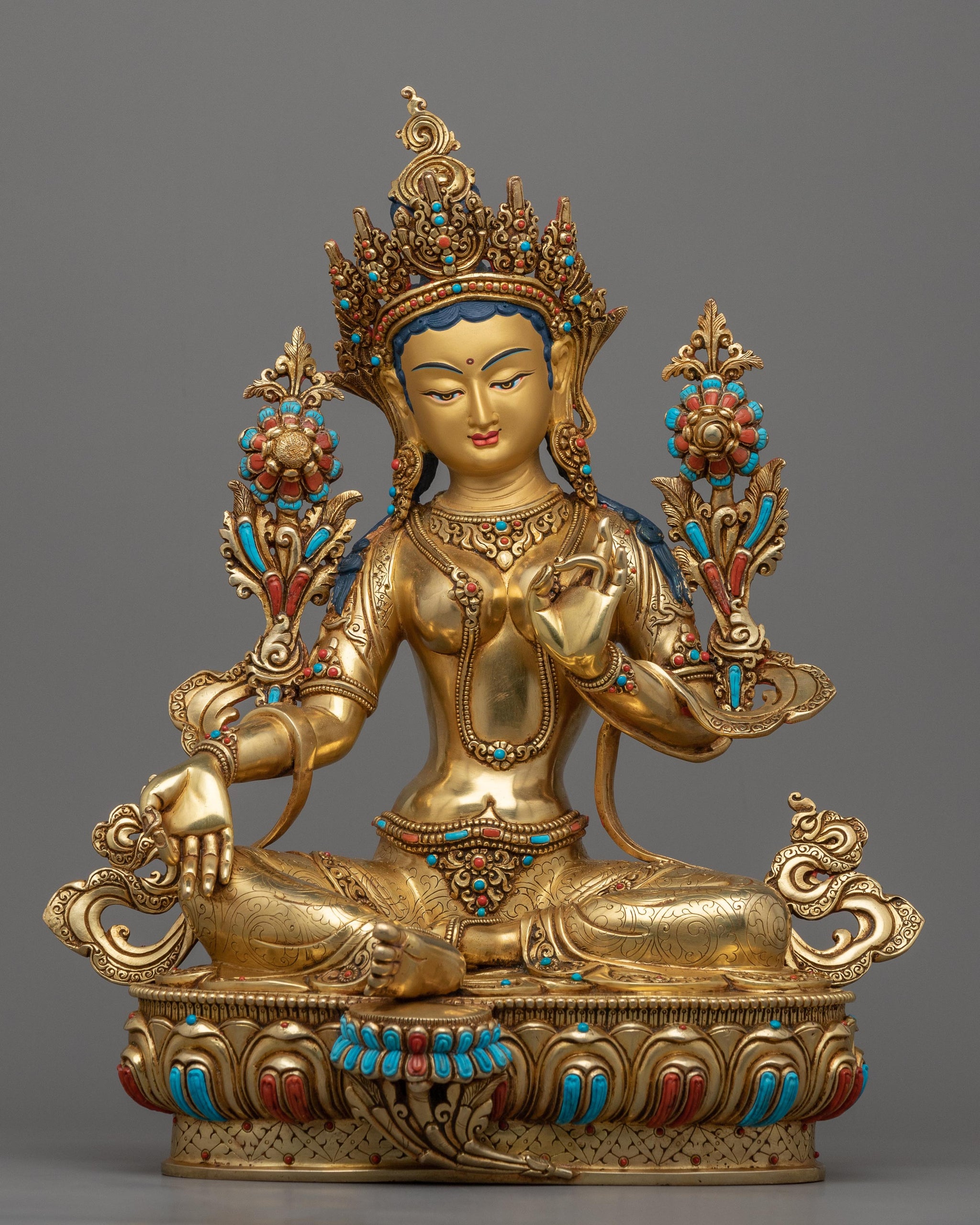 Our exquisite Green Tara statue was expertly created by our gifted artisans utilizing the best 24K gold plated copper and embellished with detailed acrylic paints. Female Bodhisattva and emanation of Avalokiteshvara Green Tara is renowned for her quick thinking, compassion, and capacity to vanquish difficulties and phobias.