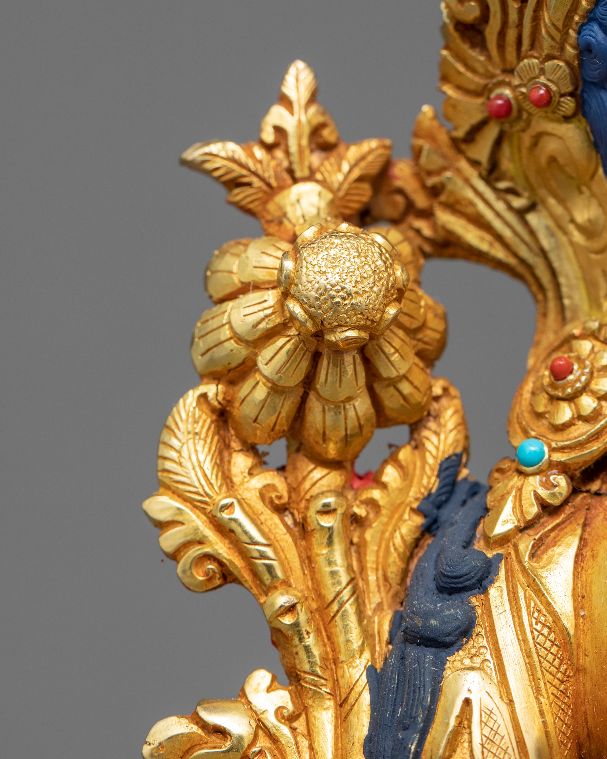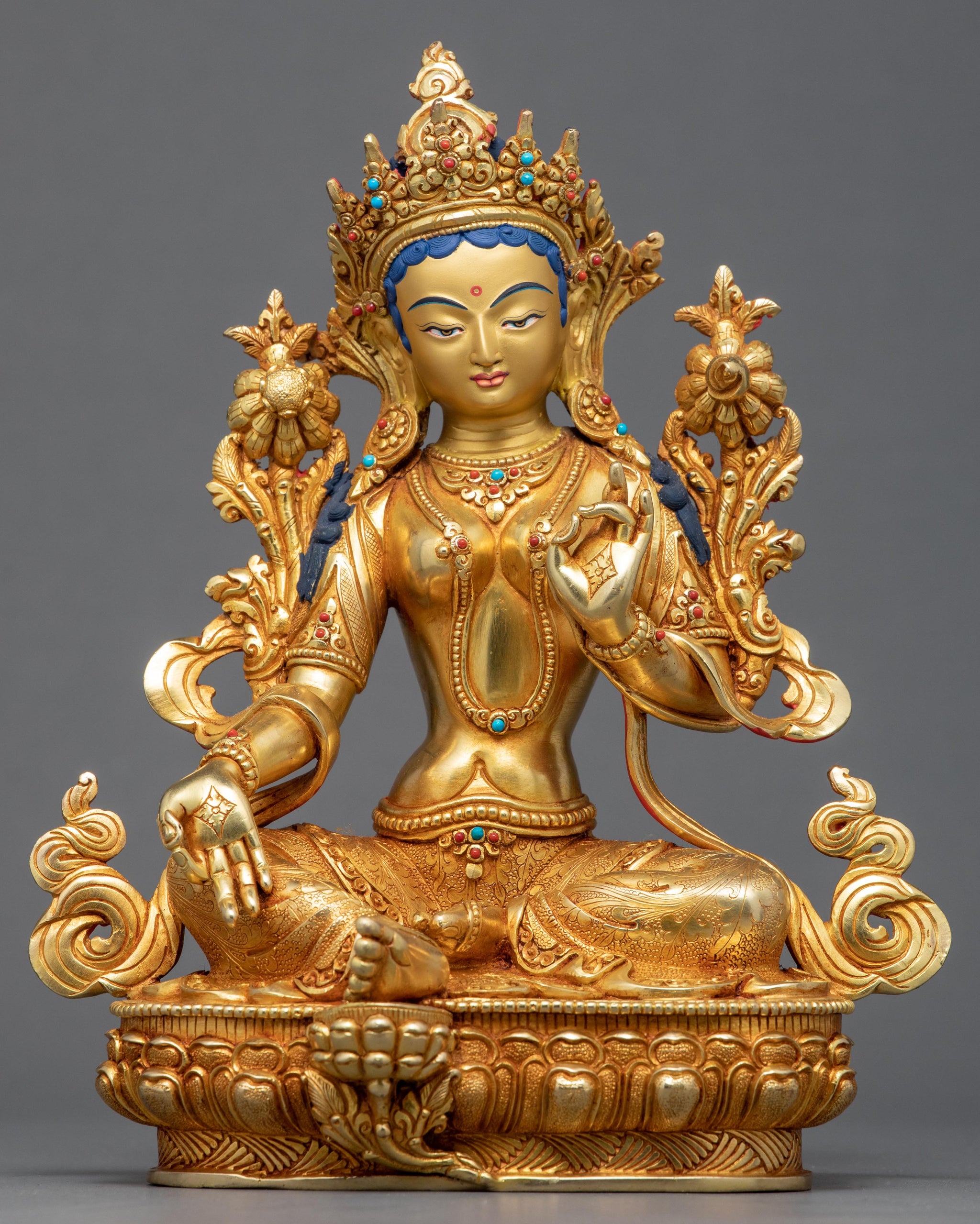 We have magnificently hand-carved the statue of Tara Green in a traditional Himalayan Art of Nepal. We are the artist of Kathmandu valley whose artwork in sculpting ancient Vajrayana statues has passed through generations. You can use this statue in different Buddhist rituals and even in your regular meditational activities. We have depicted a deity seated on top of a moon disc lotus seat with a tranquil expression. She holds an utpala in her both hands, which is mesmerizing. We have exquisitely adorned the crown with precious gemstones and corals and embellished the ornaments with valuable jewels. We assure you that the materials used in this artwork are of high quality and will last for many years.