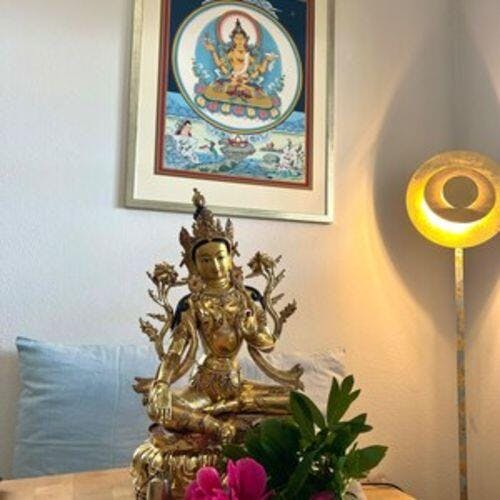 The Tara Shyam Statue was carefully created in our studio using beautiful Nepalese design patterns. The Green Tara body was made of copper and covered in 24-karat pure gold. With a beautifully designed, detailed blooming lotus flower next to her head and a semi-blooming lotus flower beside her, Mother Tara is shown in the statue sitting on a moon disc lotus while holding a lotus flower stem in each hand. The gold gilding gives the figure an exceptional luster and brightness. The deity's facial characteristics have been highlighted using acrylic paint. The statue was creatively adorned with hand-carved body ornamentation, the crown, and the lotus seat. These jewels are all elegantly arranged. The figure is covered with complex patterning but keeps the statue very sleek at the very same time. It took our master artisan years to hand-carve it wholly and make it this decorative.