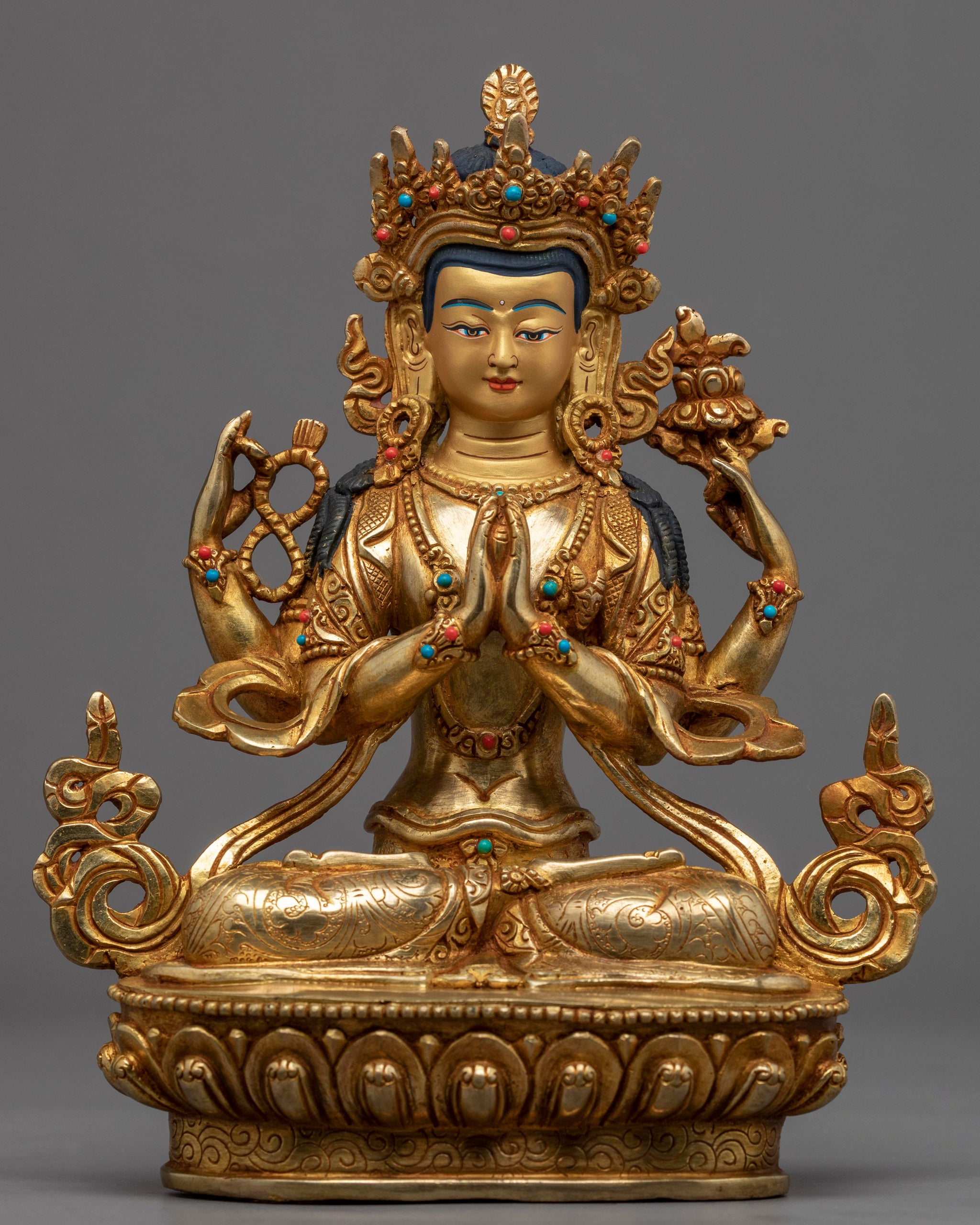 Utilizing the skillset passed down for centuries, we have exclusively sculpted this mesmerizing 'The Bodhisattva Avalokiteshvara Statue.' The body is molded using the oxidized copper body, which is later gilded with genuine 24K gold. We have hand-craved visually appealing design patterns on the robe and body ornaments of the deity. The statue is adorned with precious gemstones. Crafting this statue took us months and months of hard work and total dedication. You can use this artwork for various purposes, such as in your regular meditational or yoga activities, in different Buddhist rituals, and for home décor things.