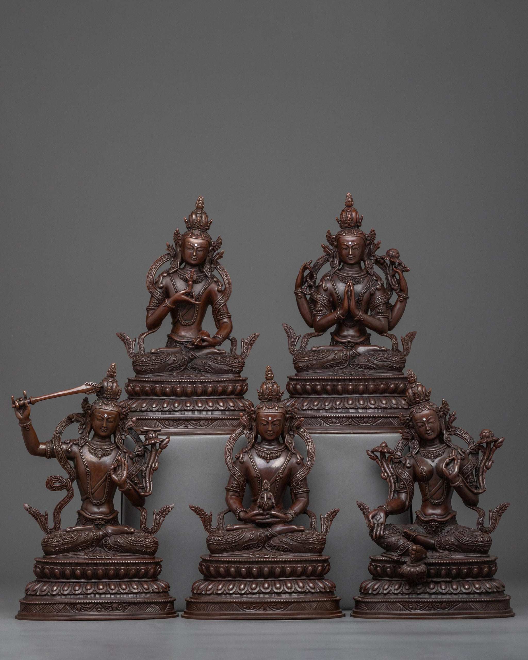 The set is made of an oxidized copper body and weighs a hefty 9.286 kg. This gives it an ancient, cherished appearance. Each figure tells a tale of knowledge, compassion, and longevity that epitomizes fundamental Buddhist teachings, and the superb details showcase the exceptional craftsmanship of our Nepalese artisans.