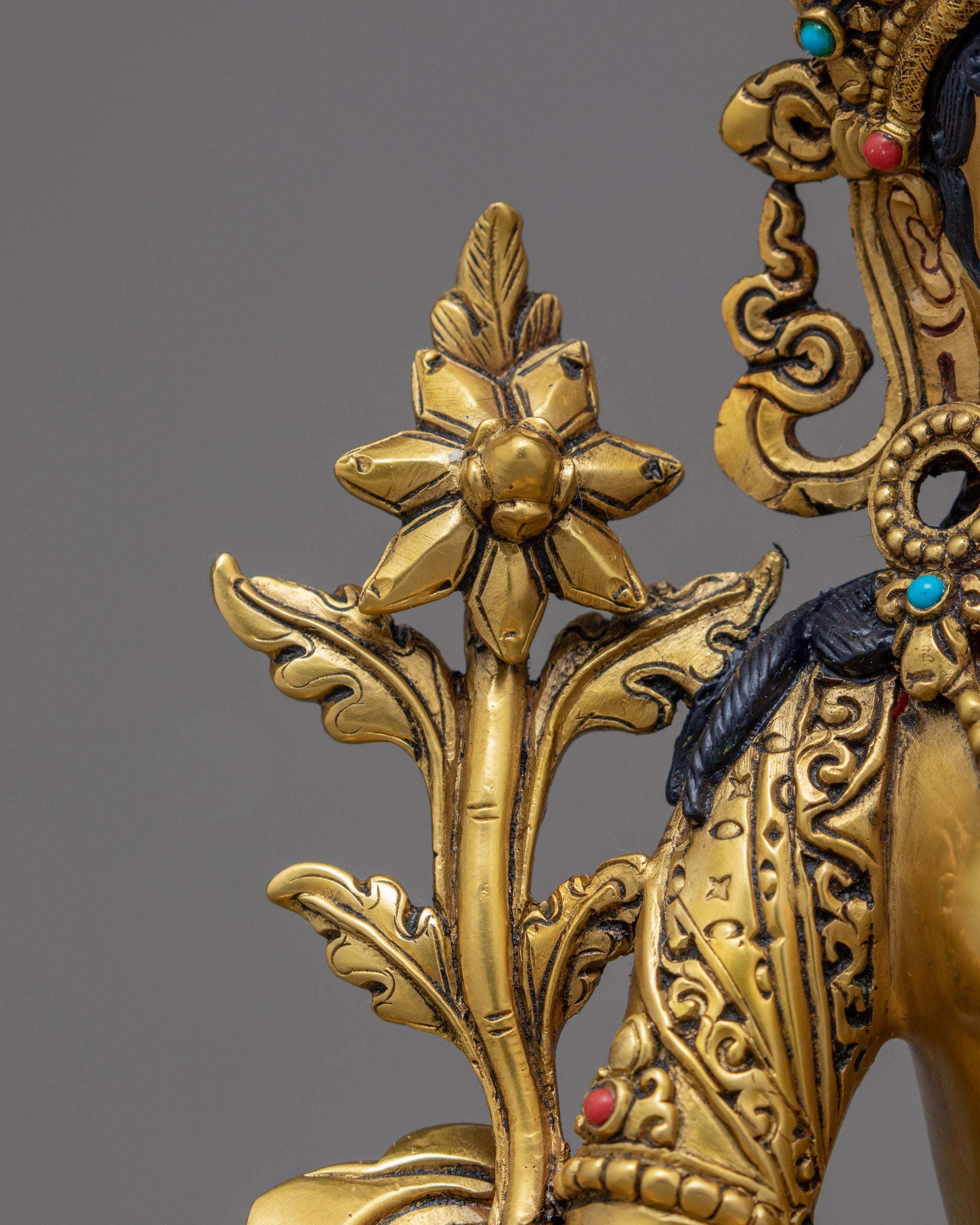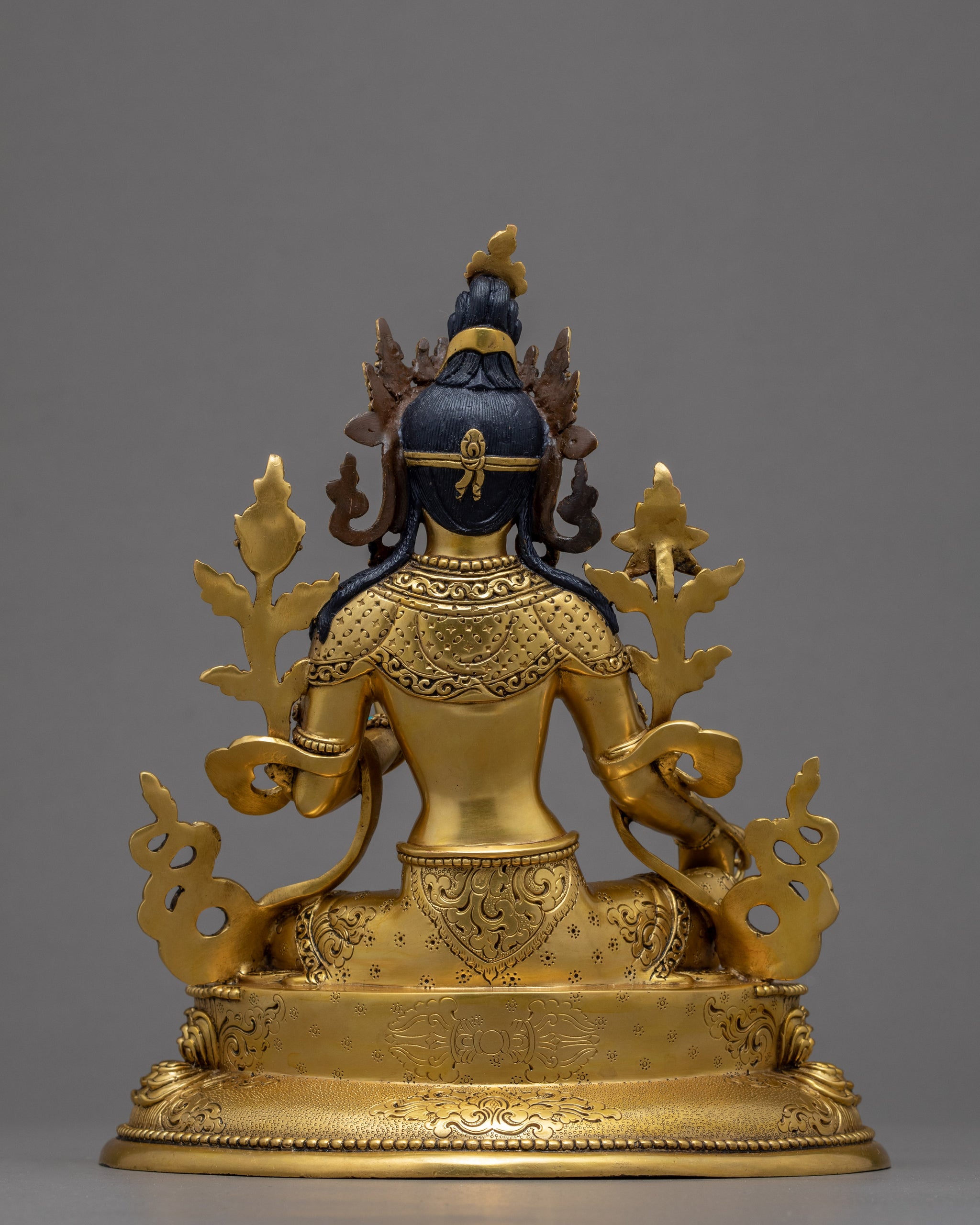 The Green Tara, often known as the Buddhist Mother Deity, is shown in this sculpture. Her face is entirely gilded in gold and radiates complete peace and tranquility. Her beautifully shaped eyes glance towards eternity. She is completely gold-plated and carved with magnificent Himalayan Art designs and motifs. This statue has an incredibly appealing contrast because of the combination of precious stones and corals. Kathmandu valley artisans sculpted and crafted the crown and lotus seat, adorned with exquisite diamonds and embellishments.