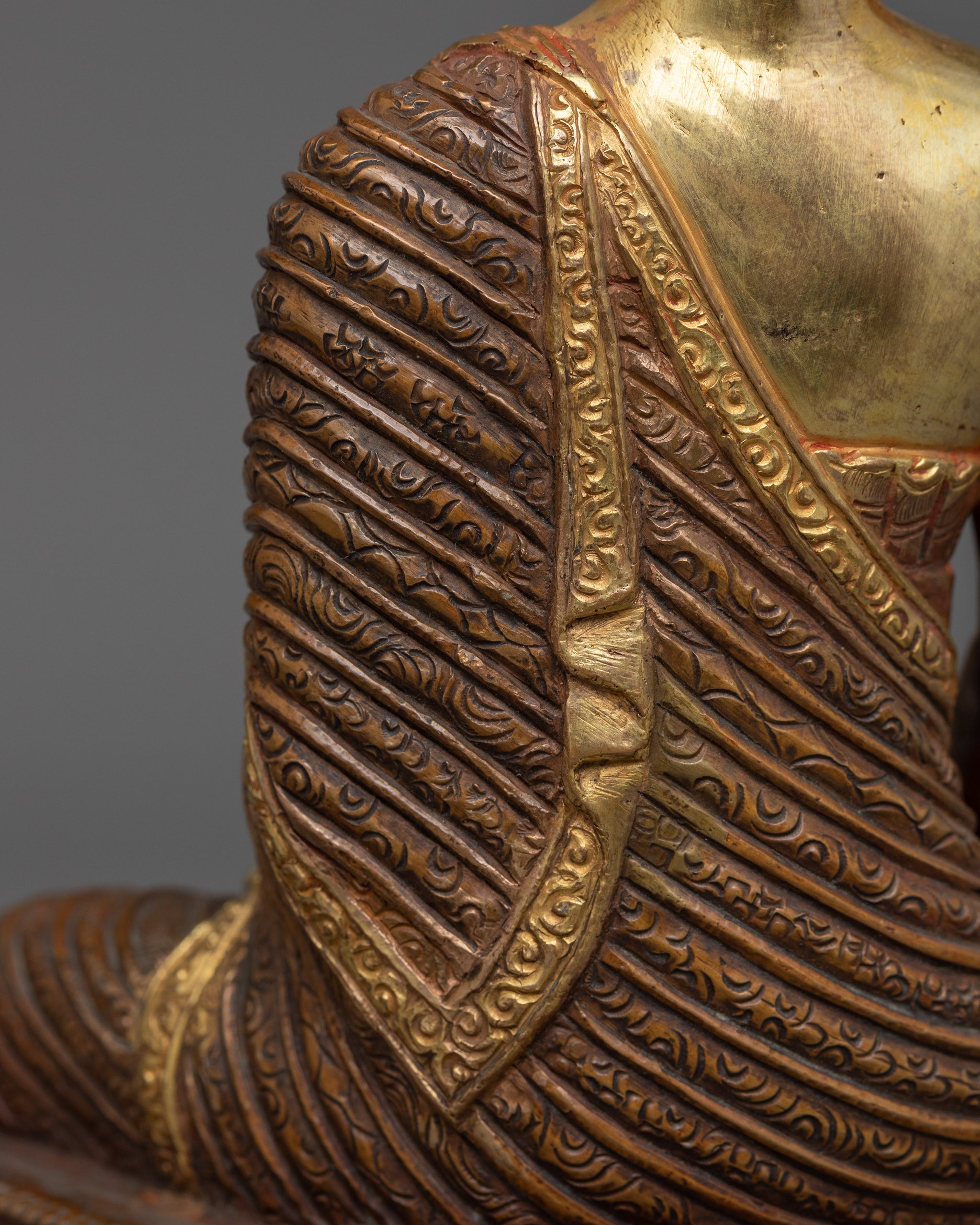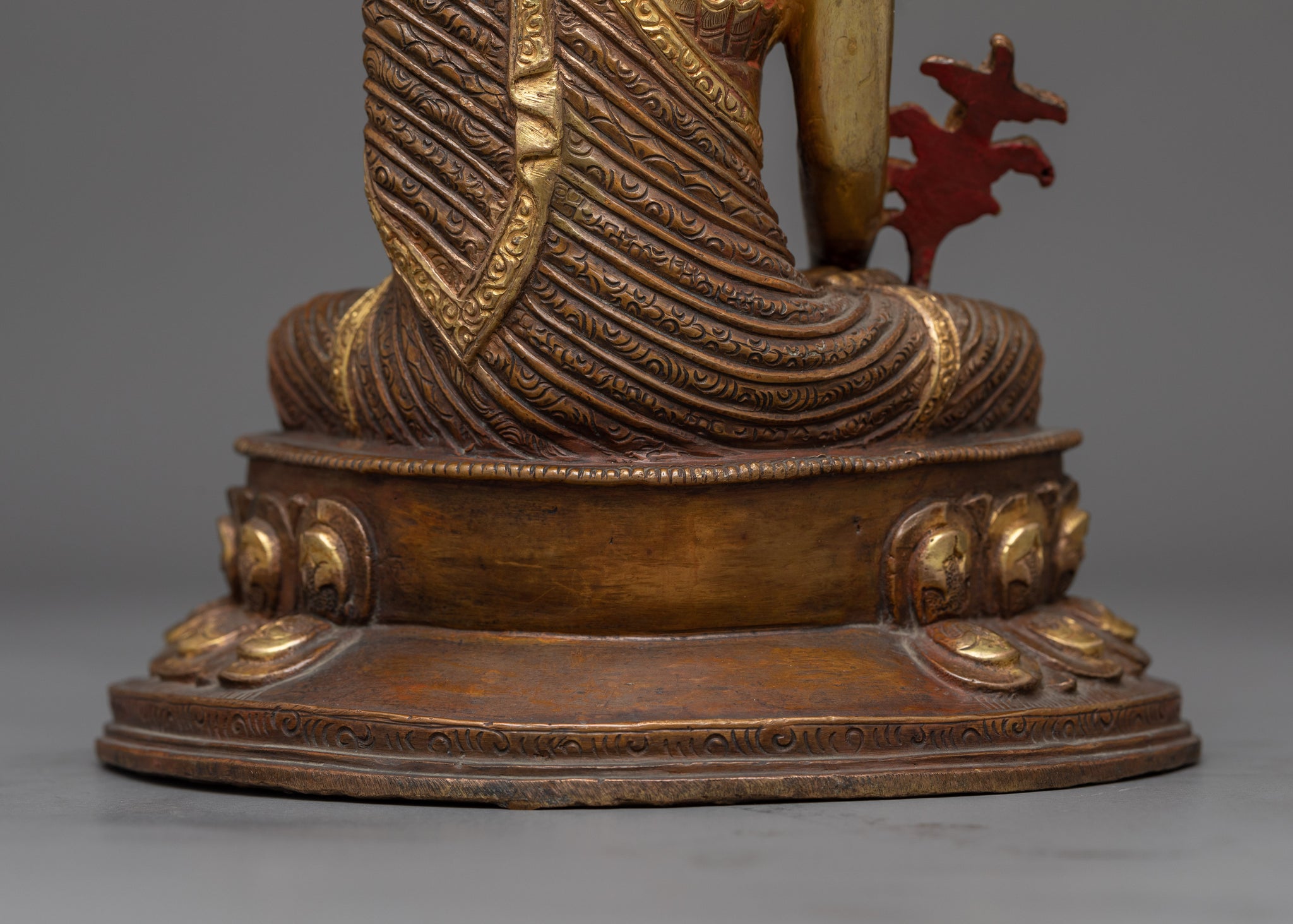 The Medicine Healing Buddha 21cm Statue blends spiritual depth and excellent craftsmanship. Standing 21cm tall and weighing 1.63 kg, it is made of oxidized copper, giving it a timeless, ancient appearance. The statue is carefully gilded in 24K gold, bringing out the fine details of the Buddha's tranquil look and the symbolic objects he holds.