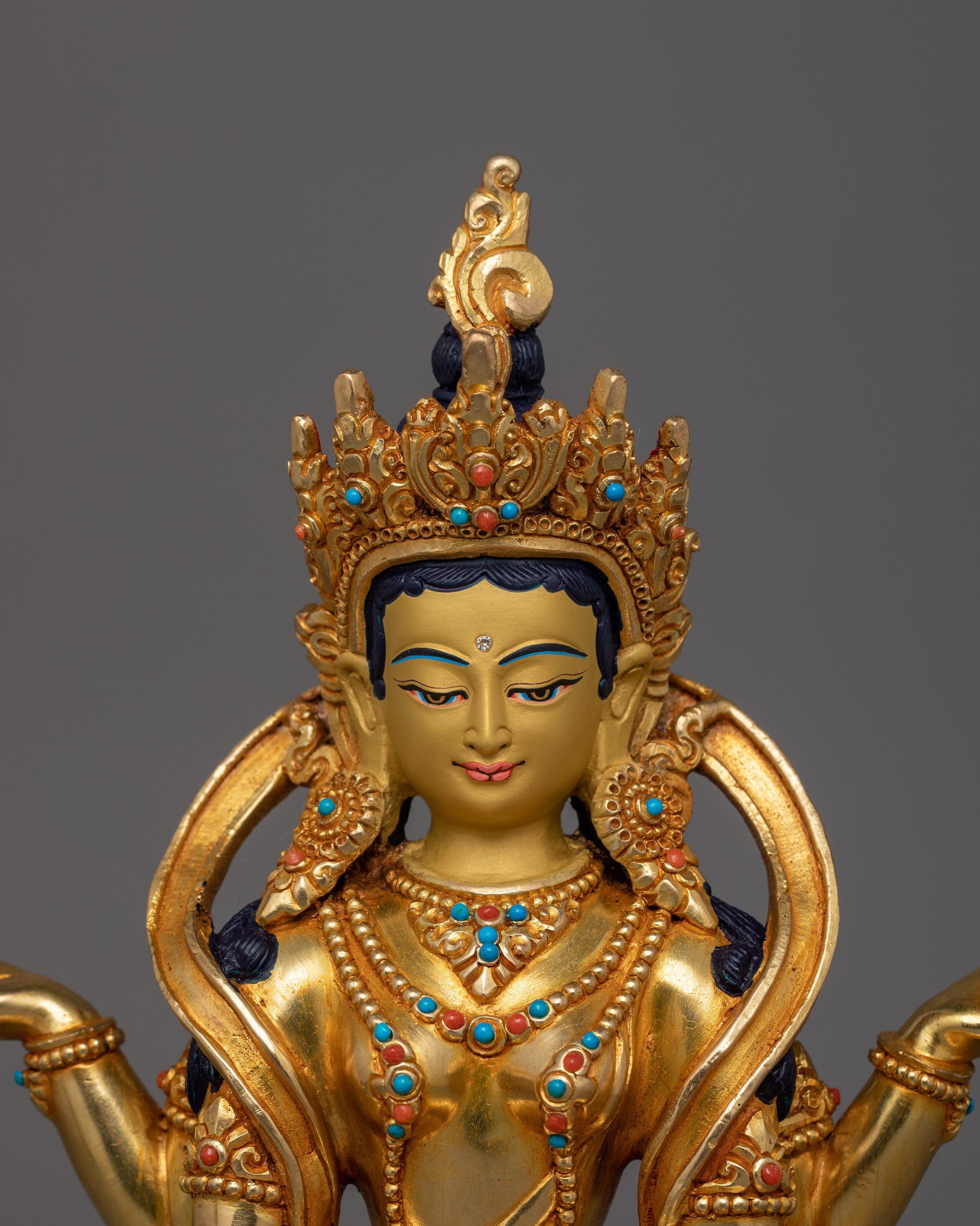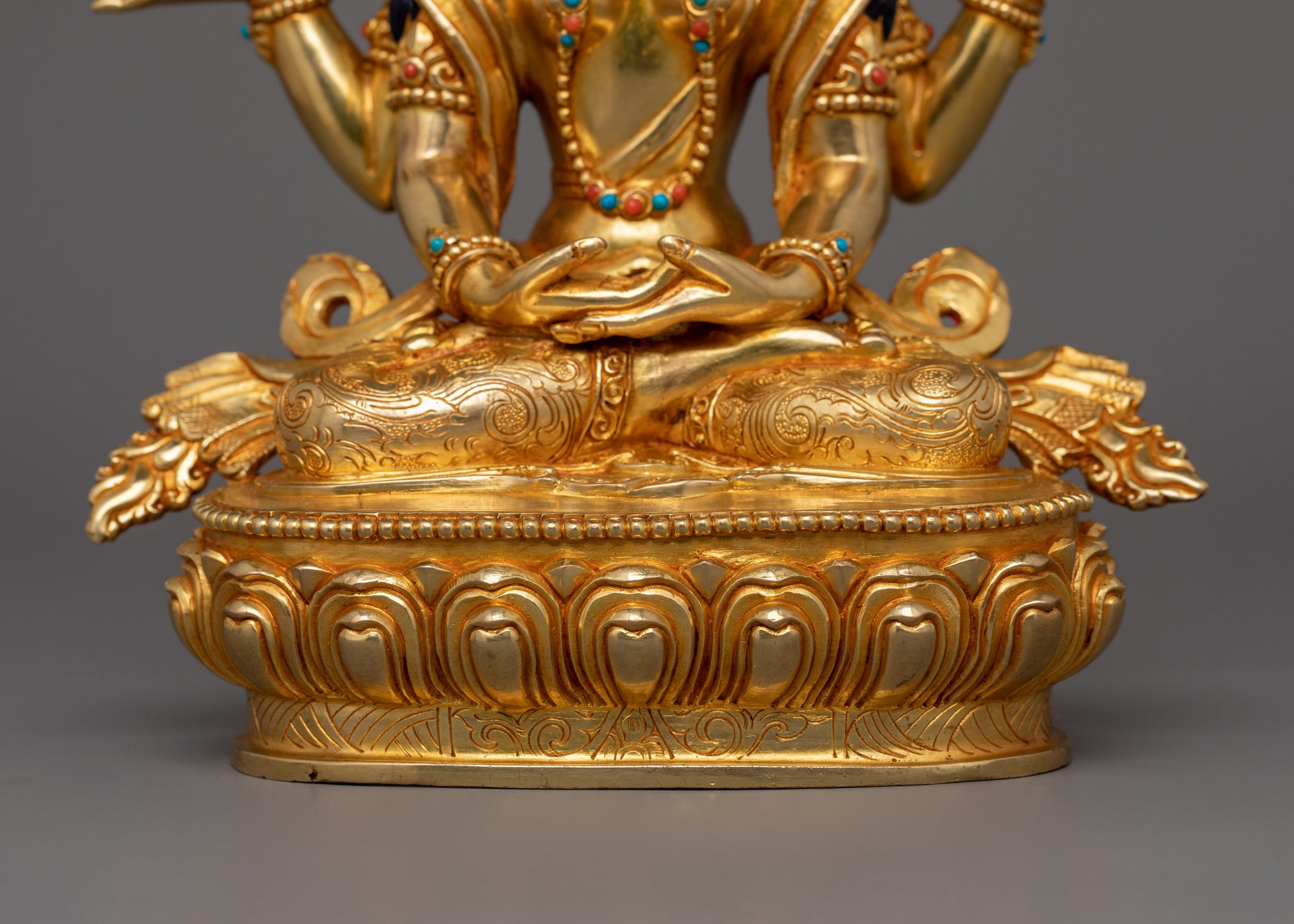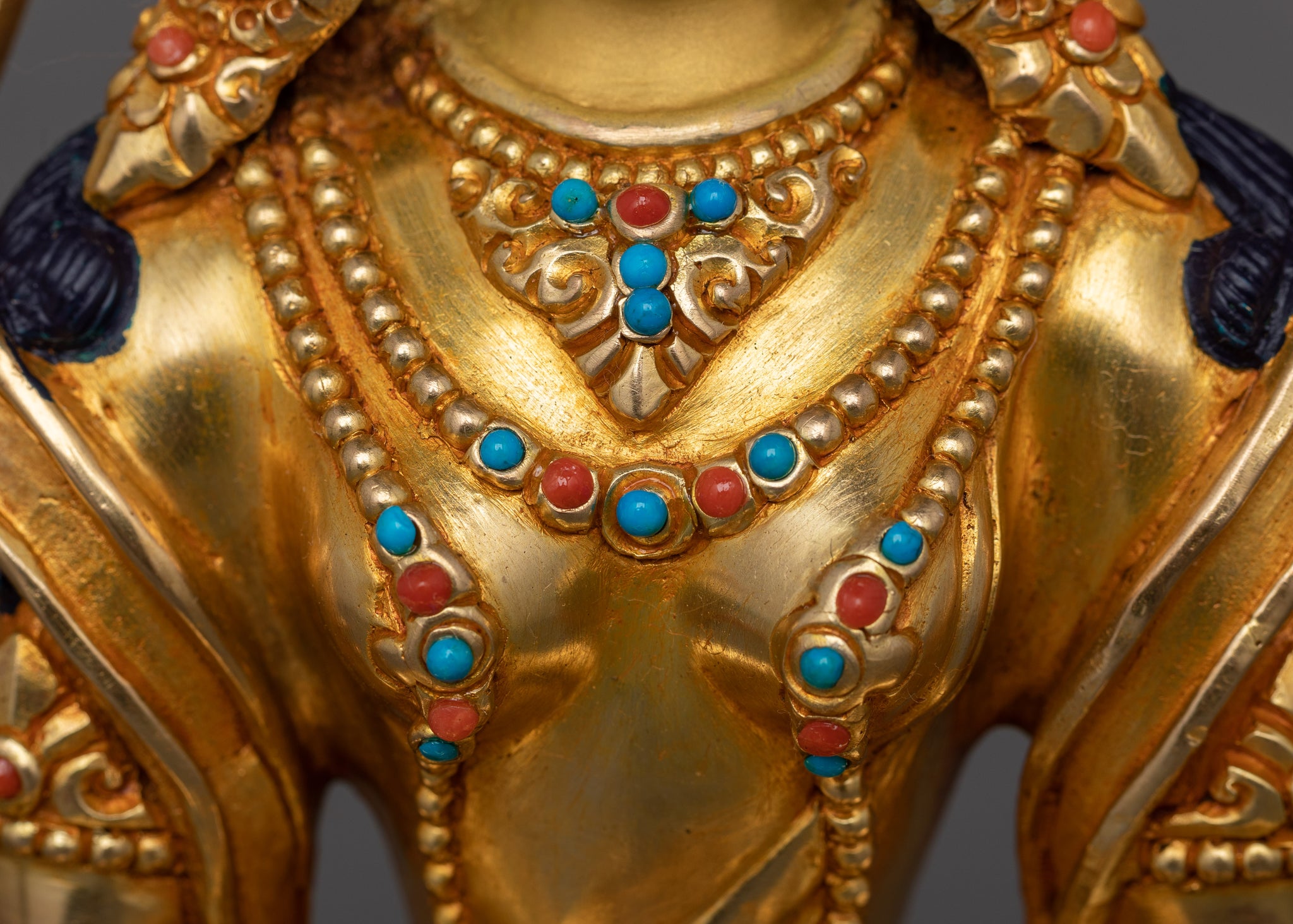 The Perfection of Wisdom Prajna Paramita statue stands at 8.9”/22.5 cm in height with a 6.7”/17 cm base and weighs 1.61 kg. This statue represents Prajna Paramita, the Bodhisattva embodying the wisdom of emptiness and the Perfection of Wisdom in Mahayana Buddhism. The figure is gilded with 24K gold, gold and acrylic paintings, copper body, and adorned with gemstones. Designed by talented Nepalese artisans, this detailed sculpture is ideal for altars, meditation areas, or as a meaningful decor item for individuals seeking awareness in their daily life.