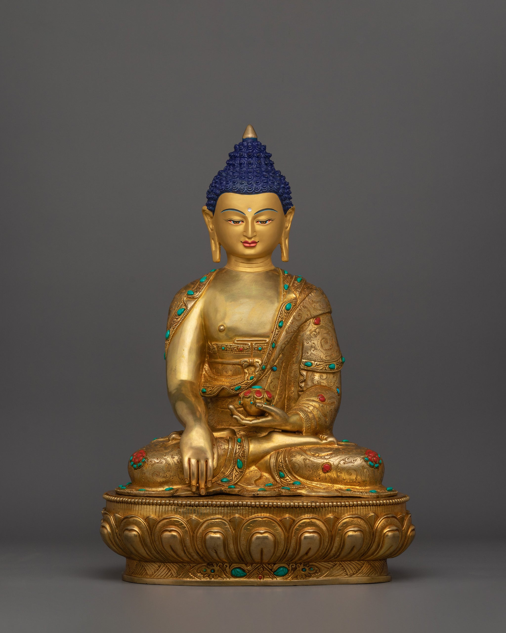 This handmade statue of the rulers of the Shakya clan Shakyamuni Buddha, stands 18.1”/46cm in height with a 12.6”/32cm base and weighs 9.21 kg . This statue represents Shakyamuni Buddha, the historical Buddha, who attained enlightenment and shared the Dharma to guide others on the path to liberation. The statue is made of copper, covered with a triple layer of 24K gold gilding, and carved with deeply engraved carvings that produce a magnificent 3D-like effect. This sculpture, adorned with hand-carved gemstones, handcrafted by expert Nepalese artisans, elegantly symbolizes Himalayan Buddhism's sacred traditions, making it an appropriate addition to altars, meditation places, or sacred collections.
