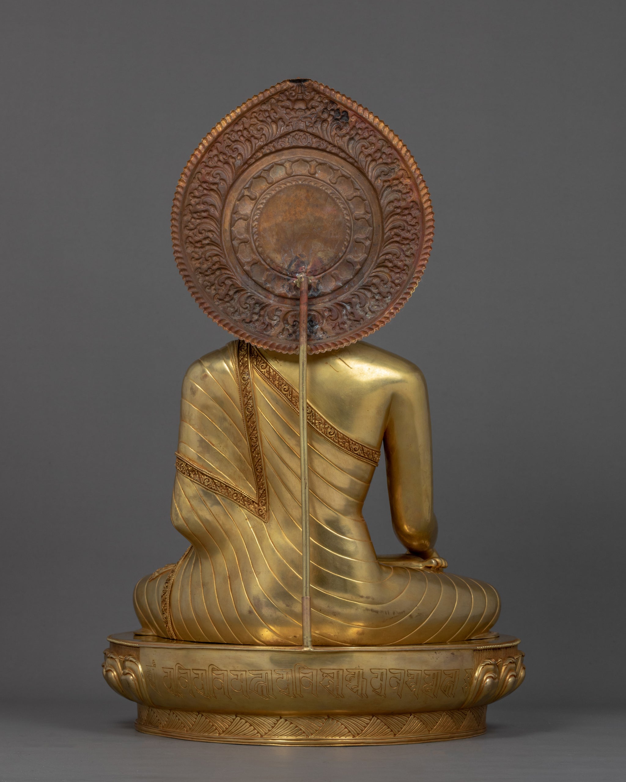 We, the artists from the Kathmandu Valley, sculpted this magnificent statue of the Buddha Shakyamuni in the traditional Himalayan manner. The figure of the Buddha shows him meditating while sitting on top of a moon disc lotus seat. The gold-plated halo beautifully illuminates his face, and the intricately carved lotus seat is stunning. This statue was initially hand-carved with a body made of pure copper, and then it was exquisitely gilded with 24k gold. We have magnificently adorned the statue with a precious hand-crafted robe which is very antique and valuable. We assure you that the materials used to craft the sculpture are of high quality and will last many years. His left hand carry an alms bowl, while his right hand is making an earth-touching mudra. This kind of indoor meditation statue will be an excellent dharma gift for a practitioner like you.