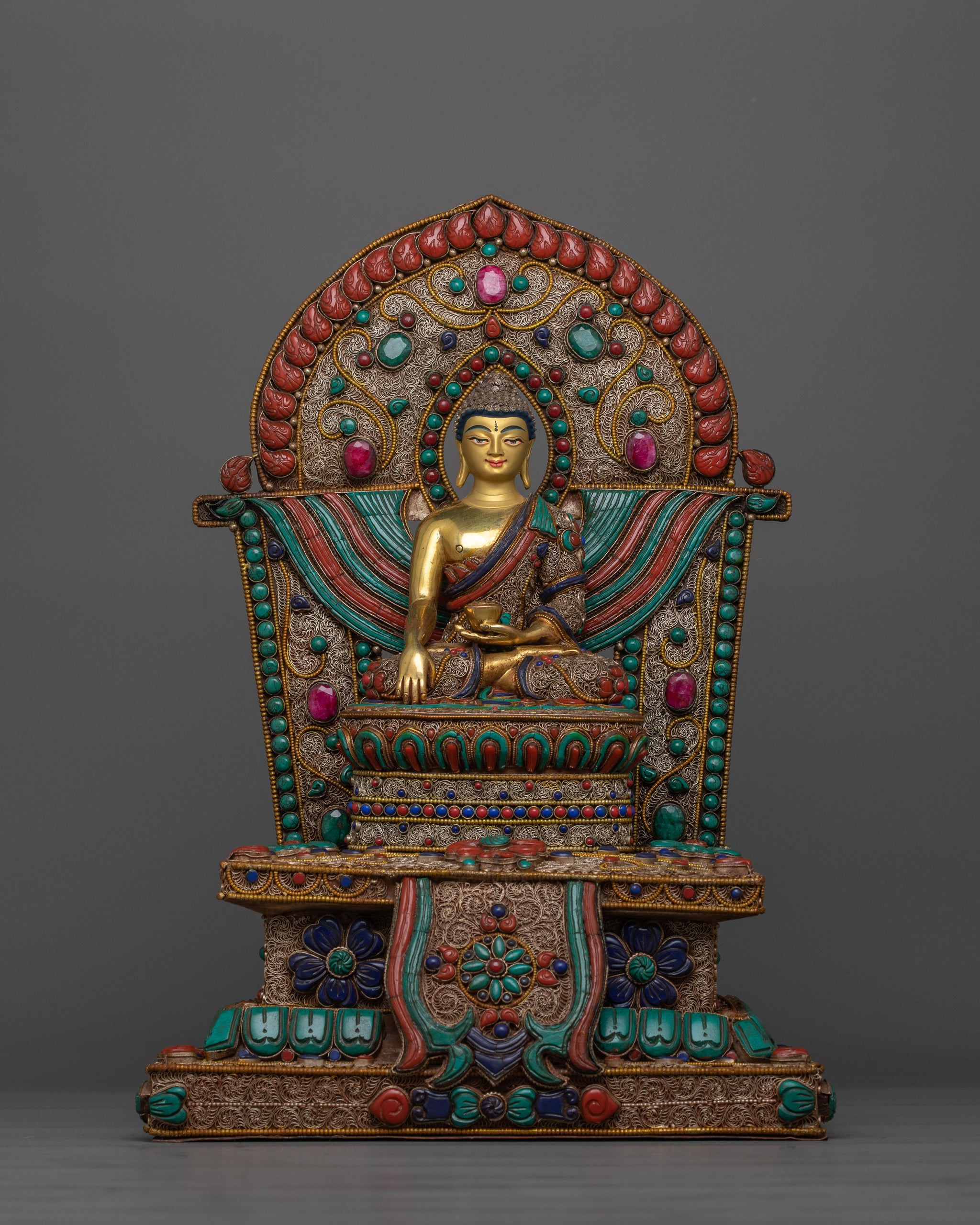 This magnificent The Spiritually Awakened One Shakyamuni Buddha statue, which is 15.7 inches tall with a base of 11.4 inches, embodies the essence of enlightenment and calm. It weighs 3.78 kg and is made of copper with 24K gold plating, which represents purity and transcendence. The statue is delicately inlaid with hand-carved jewels, including turquoise, lapis lazuli, and coral, which each add layers of spiritual meaning, representing protection, knowledge, and life. The silver-plated details highlight the golden glow, transforming this item into a breathtaking example of spiritual beauty and artistry.