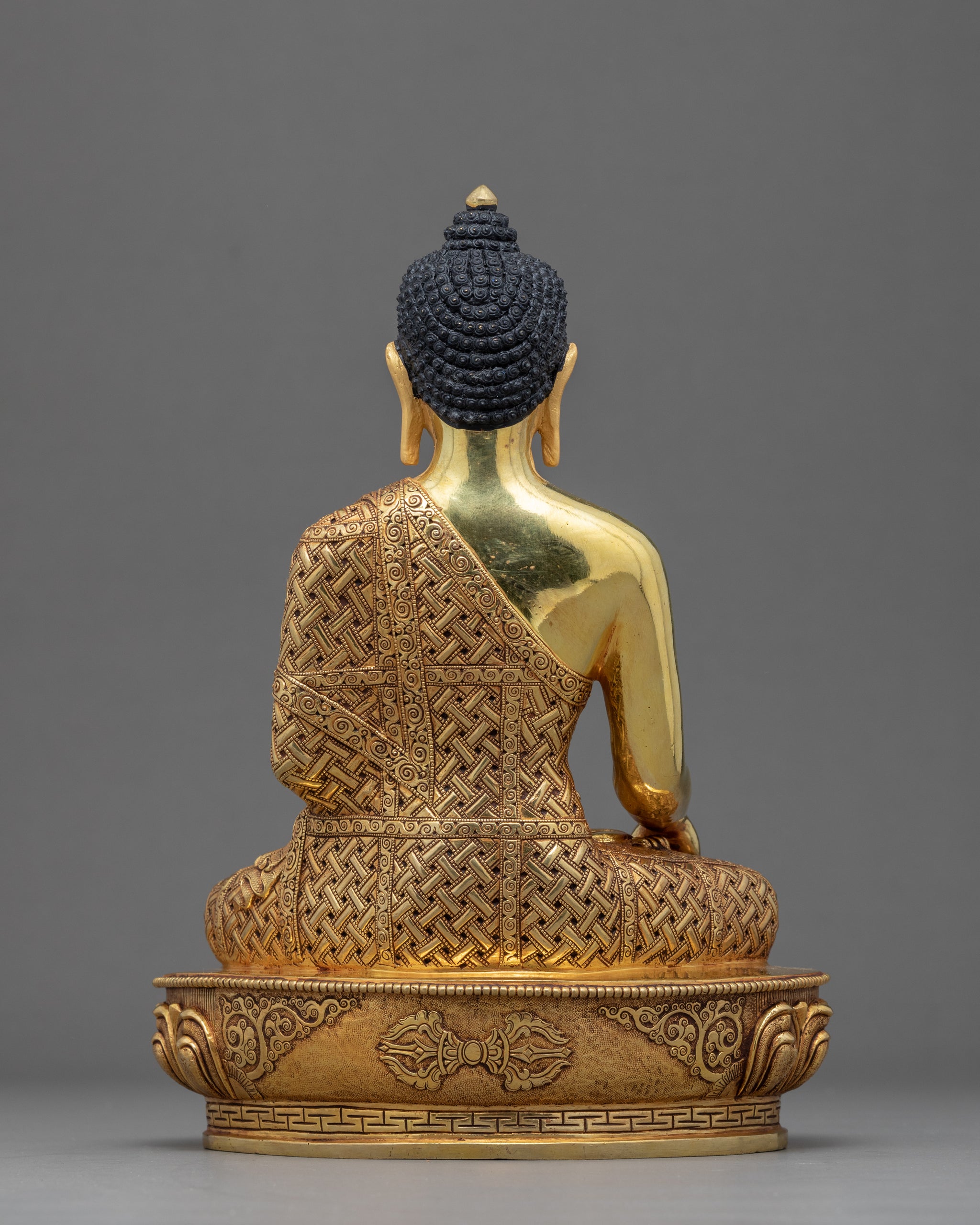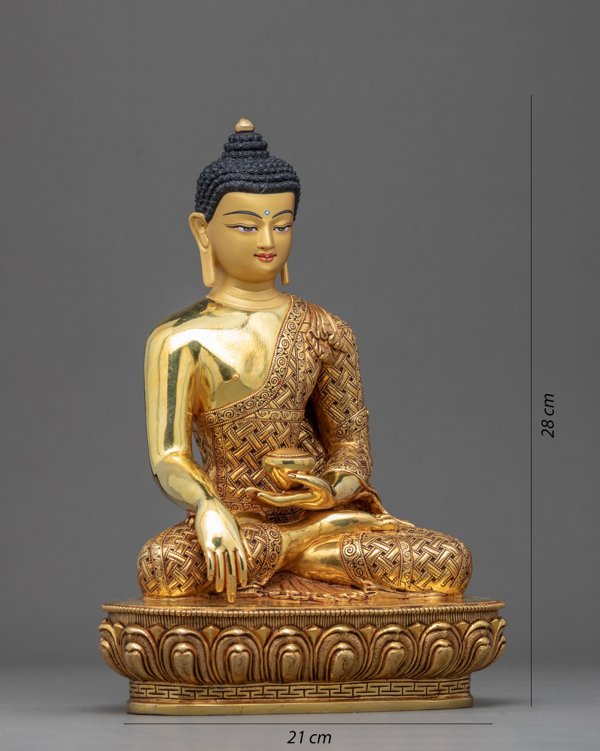 All three Buddha sculptures depicted on a top moon disc lotus seat look mesmerizing. We have traditionally hand-carved in a pure copper body and gilded it with genuine 24k gold. We have finely carved with gold to adorn the Buddha's robes, while we have used antique and valuable jewels to embellish the ornaments. The materials used for crafting are of high quality and are rare in Vajrayana arts. We also assure you that you can use the statue for home décor for a long-lasting without any damage and scratches. From this exquisite statue, you can also make beneficial meditation and yoga practices in many Buddhist ceremonies and rituals. It took more than a month for us to accomplish this elegantly hand-crafted art of Himalayan. This statue will be a tremendous gift from Nepal to a practitioner like you.