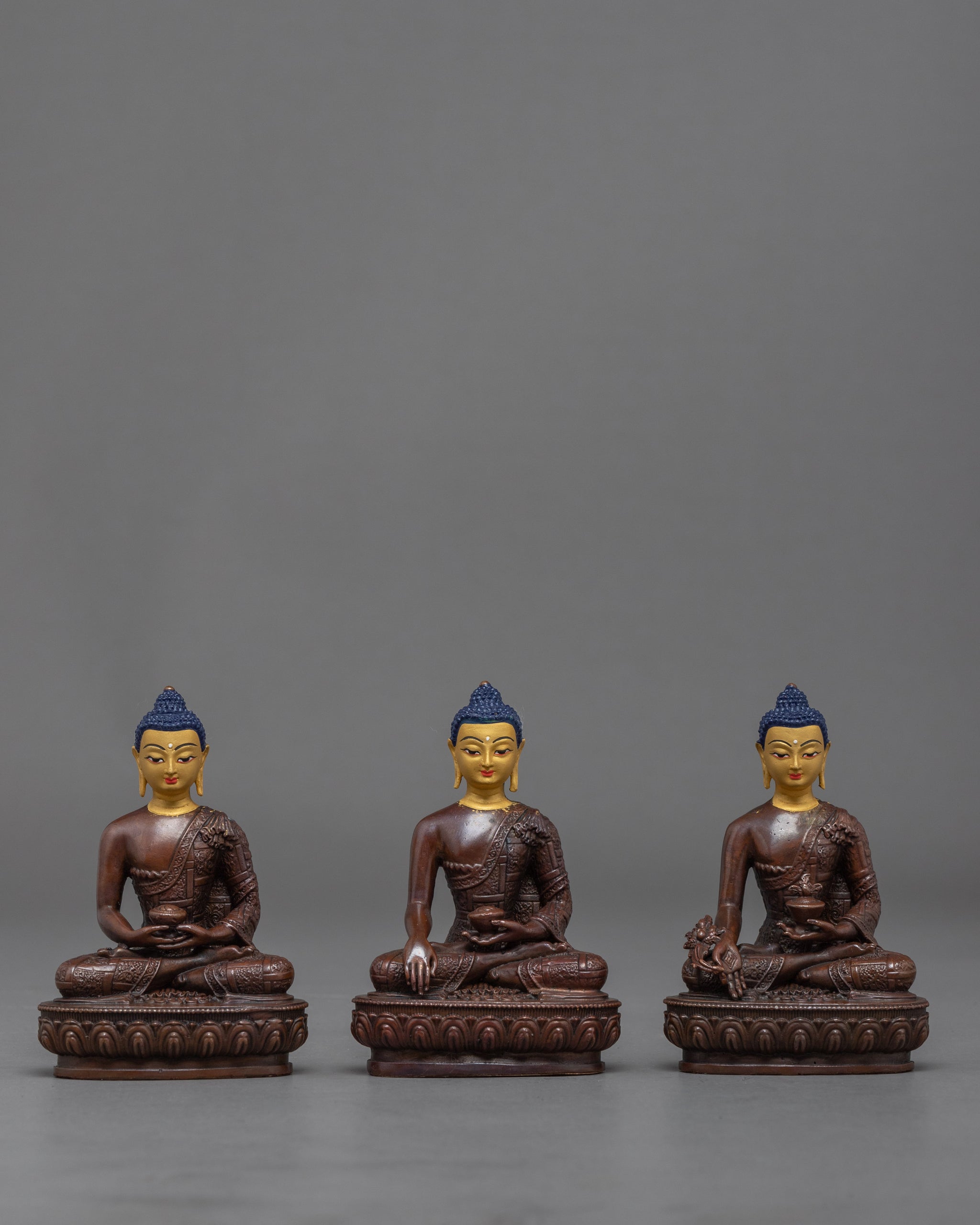 The three Buddha Statue Set have been crafted with oxidized copper with machines, gilded with genuine 24k gold on the face portion of the statue. The materials used for crafting are of high quality and are rare in Vajrayana arts. The buddhas are depicted as seated upon a lotus-shaped in cross-leg position. Each individual symbolizes a different meaning in the part of the right hand.