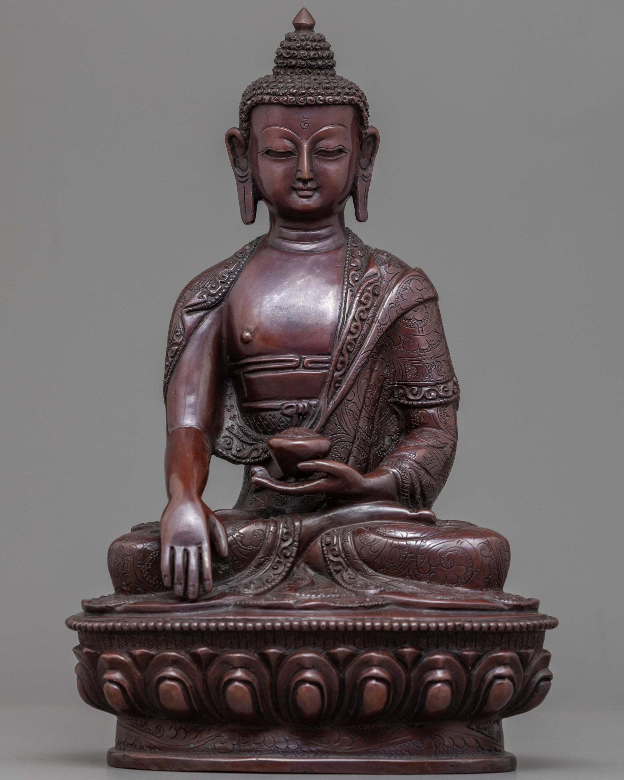 This stunning, intricate sculpture of Lord Gautam Buddha was made by our Master Craftsmen from Nepal, a historical nation where the lord was born, for the Tibetan buddha mantra Practise. Oxidized copper was used for its immaculate, unadorned appearance. Our sculpture is much more attractive because of its unique design patterns. The deity is depicted sitting cross-legged on a lotus moon disc with a serene countenance. The earth goddess is called to witness the moment of enlightenment, and his right hand barely touches the ground. His left hand is shown holding an alms bowl over the lap, representing the 49 pieces of rice he was given before enlightenment while meditating.