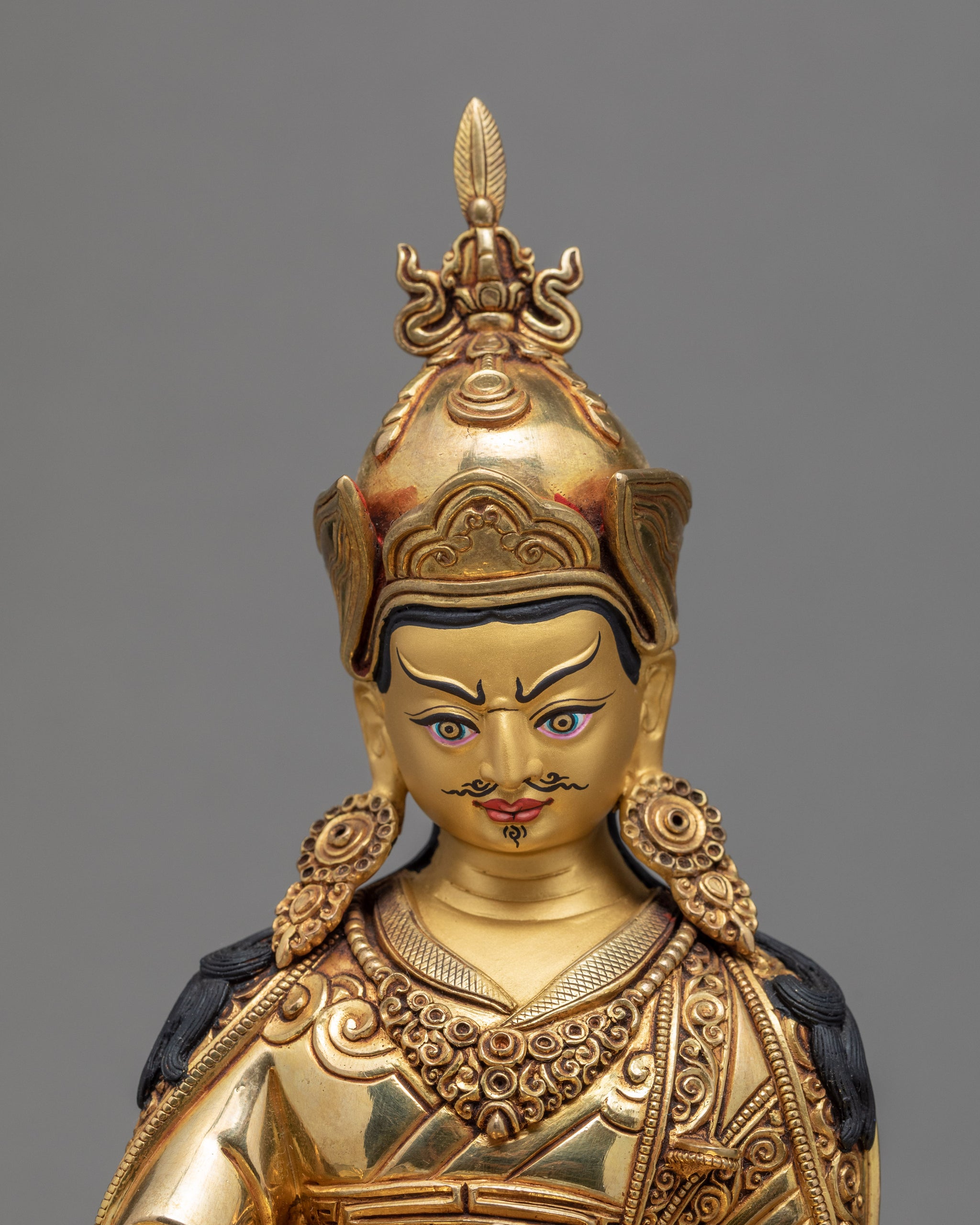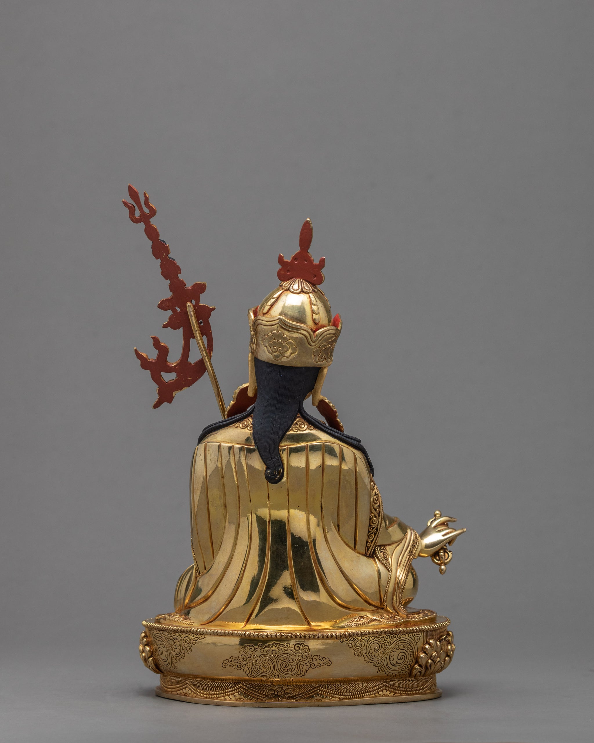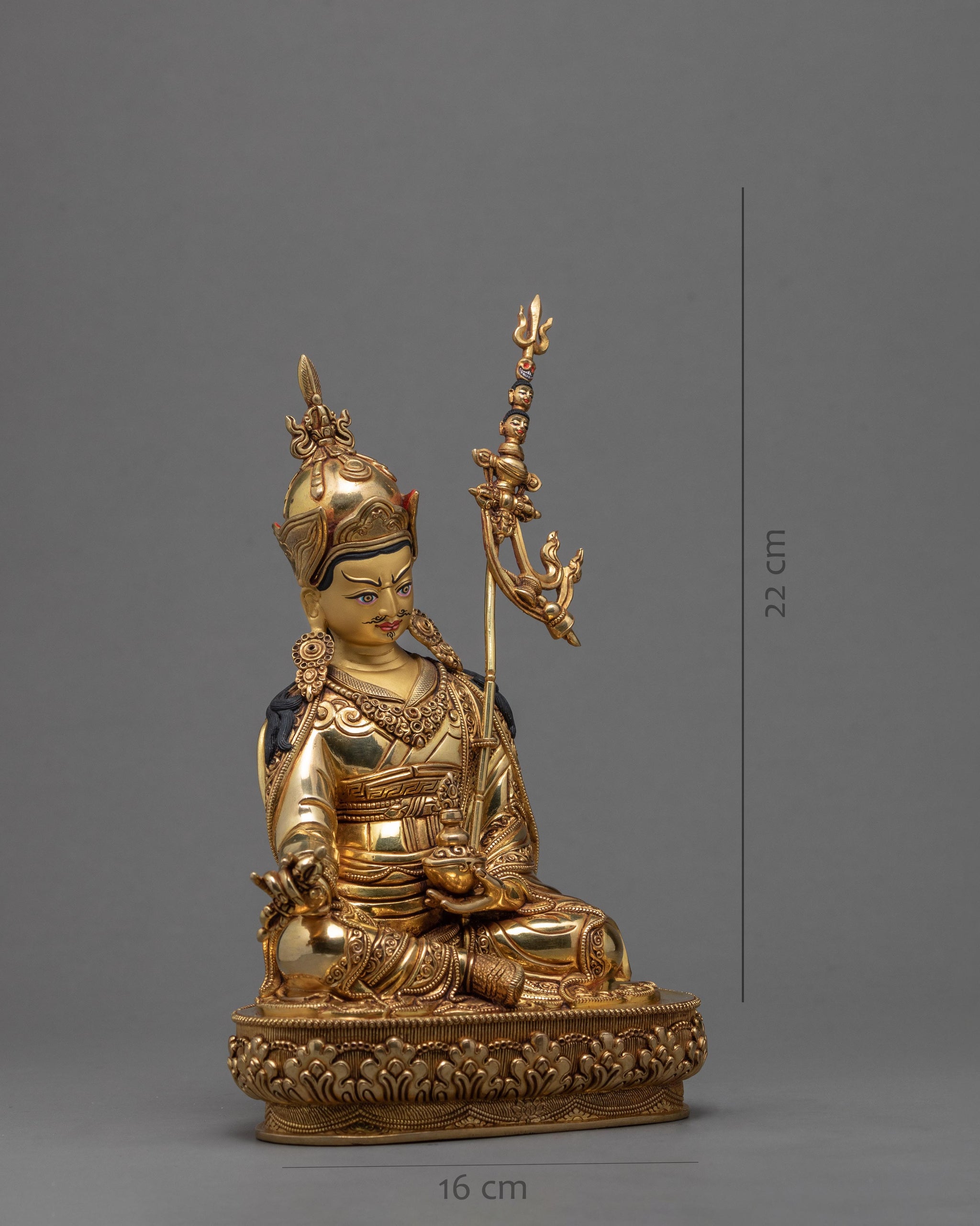 Guru Rinpoche also The lotus born is shown magnificently in this statue. This statue of a Tibetan Buddhist master was handcrafted in Kathmandu by a Nepali artist in copper and gilded in 24K Gold. She is depicted seated in a king posture on a lotus seat. He holds a vajra in his right hand and has a trident with his arms in his left.