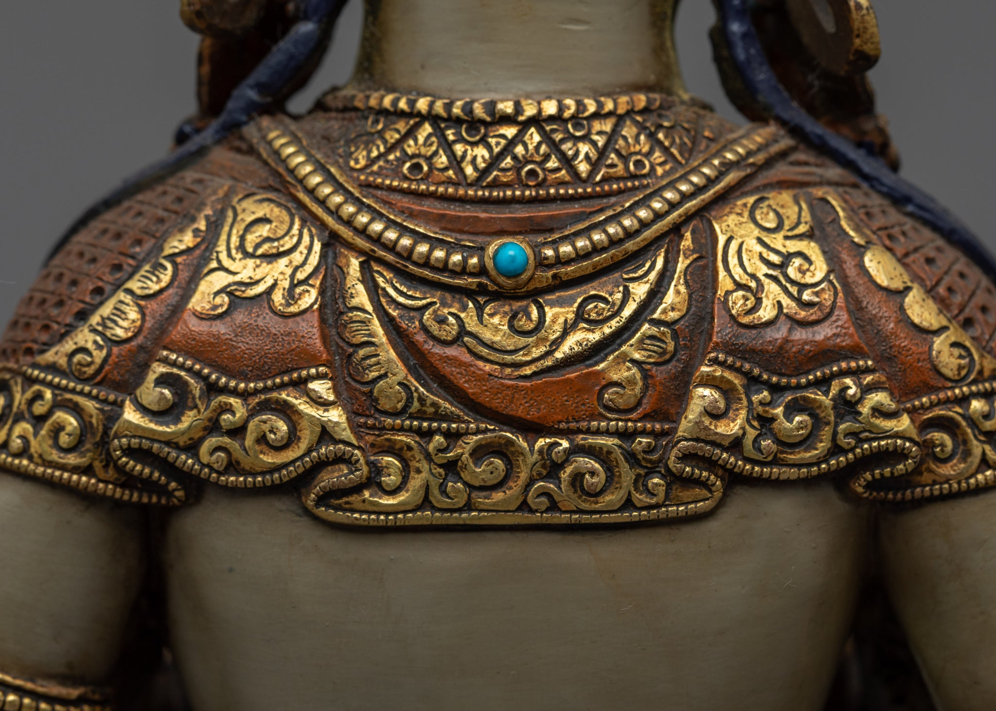 We have magnificently hand-carved the Tibetan Chenrezig statue, inheriting the craftsmanship passed down through generations. The statue is carved from a copper body, gilded with 24k genuine gold, and finely painted with acrylic paint, which enhances the statue's details. The deity is depicted with four arms, one holding rosary beads and the other a full-blown lotus, and his two front hands in a praying gesture with a wish-fulfilling crystal in between. The lotus seat, robe, and crown are all original designs by Nepalese artists. The intricate design patterns on the statue took us months to hand-carve.