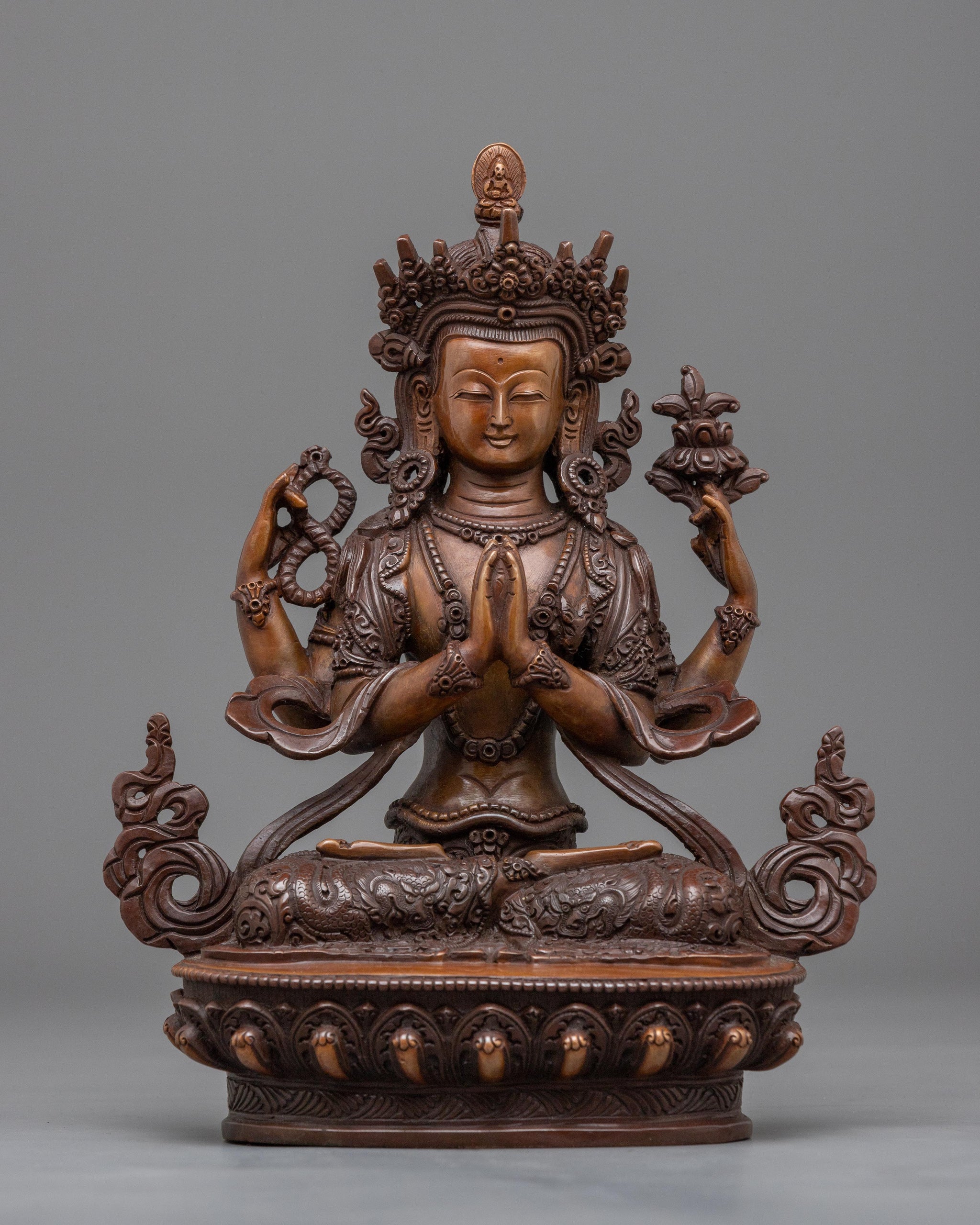 Take in the stunning artistry of the Tibetan Deity of Mercy Chenrezig Statue. This statue, which is made of oxidized copper and stands 9.1"/23 cm tall and 1.63 kg in weight, exhibits fine detailing and accurate carvings. Take note of the intricate dragon designs that cover Chenrezig's attire; they stand for strength and wisdom. With every brushstroke, the artist renders the heavenly essence of this venerated divinity, producing a work of art that exudes kindness and peace.