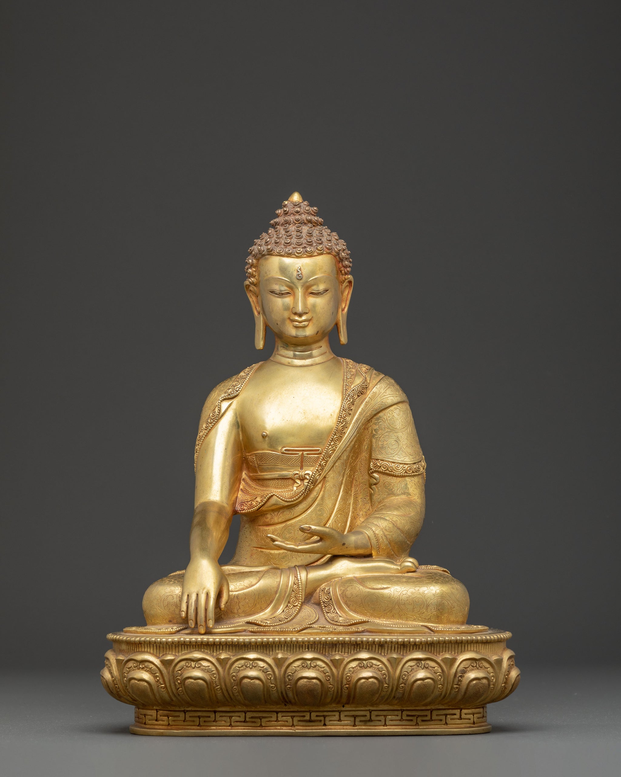 The Handmade Tibetan Golden Shakyamuni Buddha Copper Art symbolizes the Buddha's deep teachings and the path to spiritual awakening. This handcrafted statue is 11.8" (Height) x 9.1" (Base) and weighs 3.92 kg. It is made of copper Body and 24K gold gilding. This sacred statue, created by expert Nepalese artisans, represents the craftsmanship of Himalayan Buddhism, making it an inspirational addition to altars, meditation places, or sacred collections.