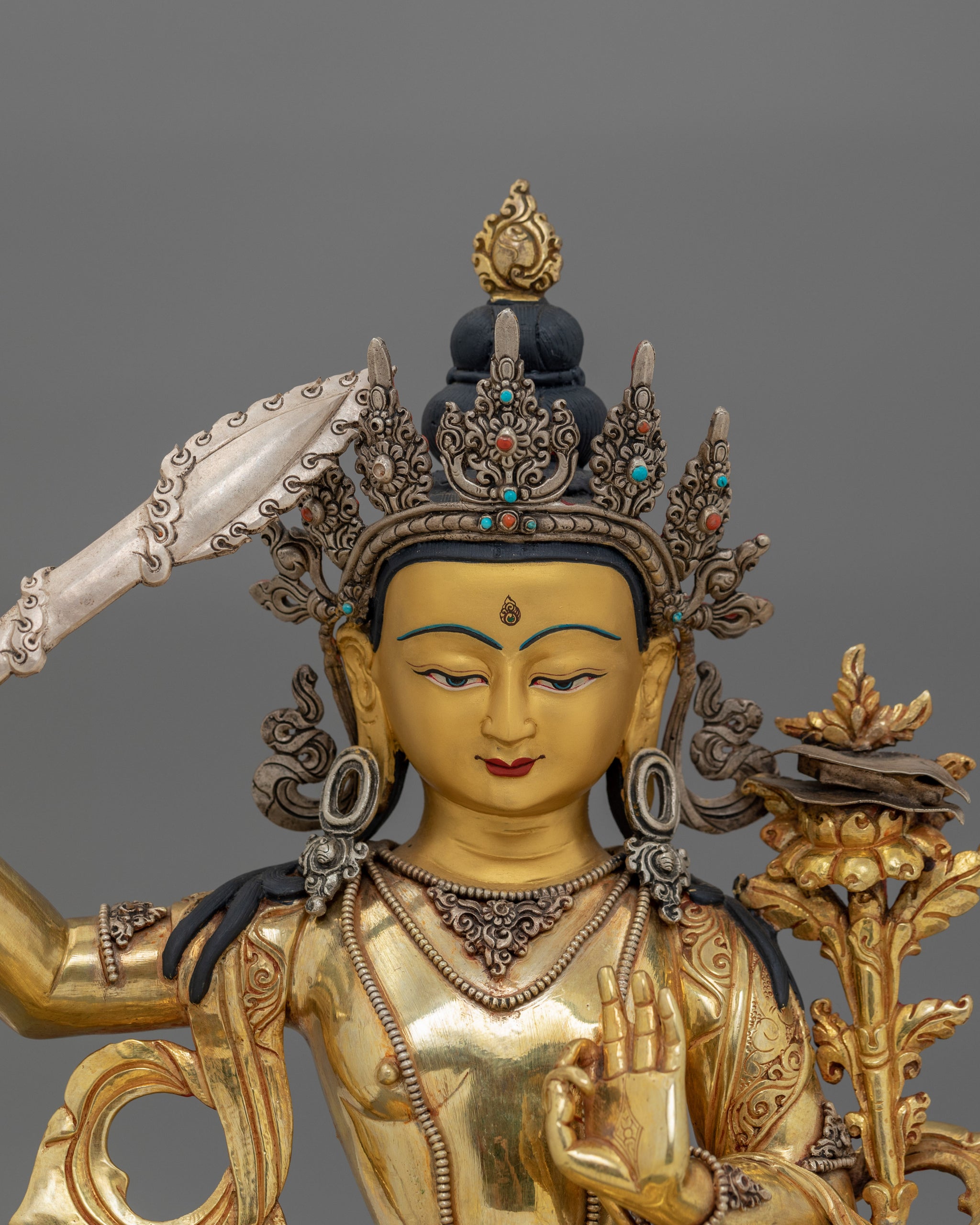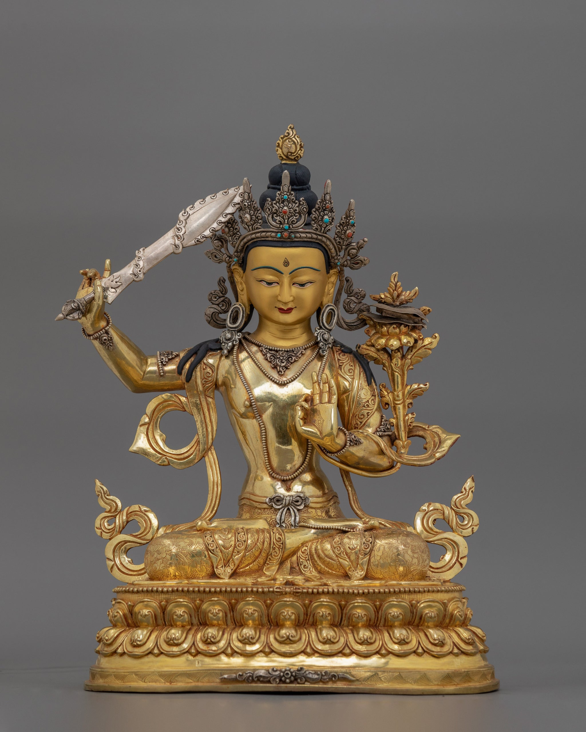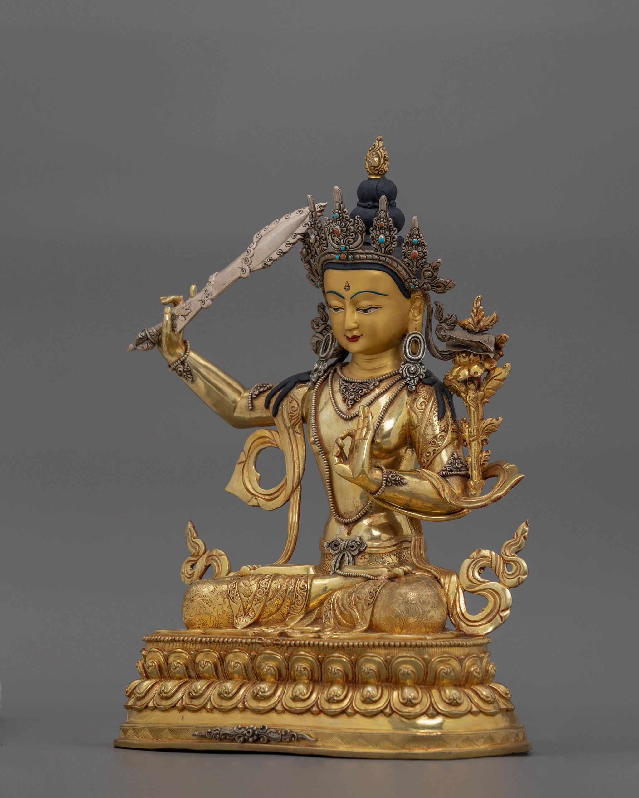 Manjushri is depicted in a posture of serene contemplation, representing the stillness that comes with deep understanding. In his right hand, he wields the flaming sword of wisdom, with its flames artistically rendered to represent mental illumination and the removal of ignorance. His left hand holds a lotus flower, atop which is the Prajnaparamita Sutra, which represents the pinnacle of transcendent wisdom. The lotus, emerging pure and unstained from muddy waters, represents spiritual awakening and the innate capacity for enlightenment in all beings.