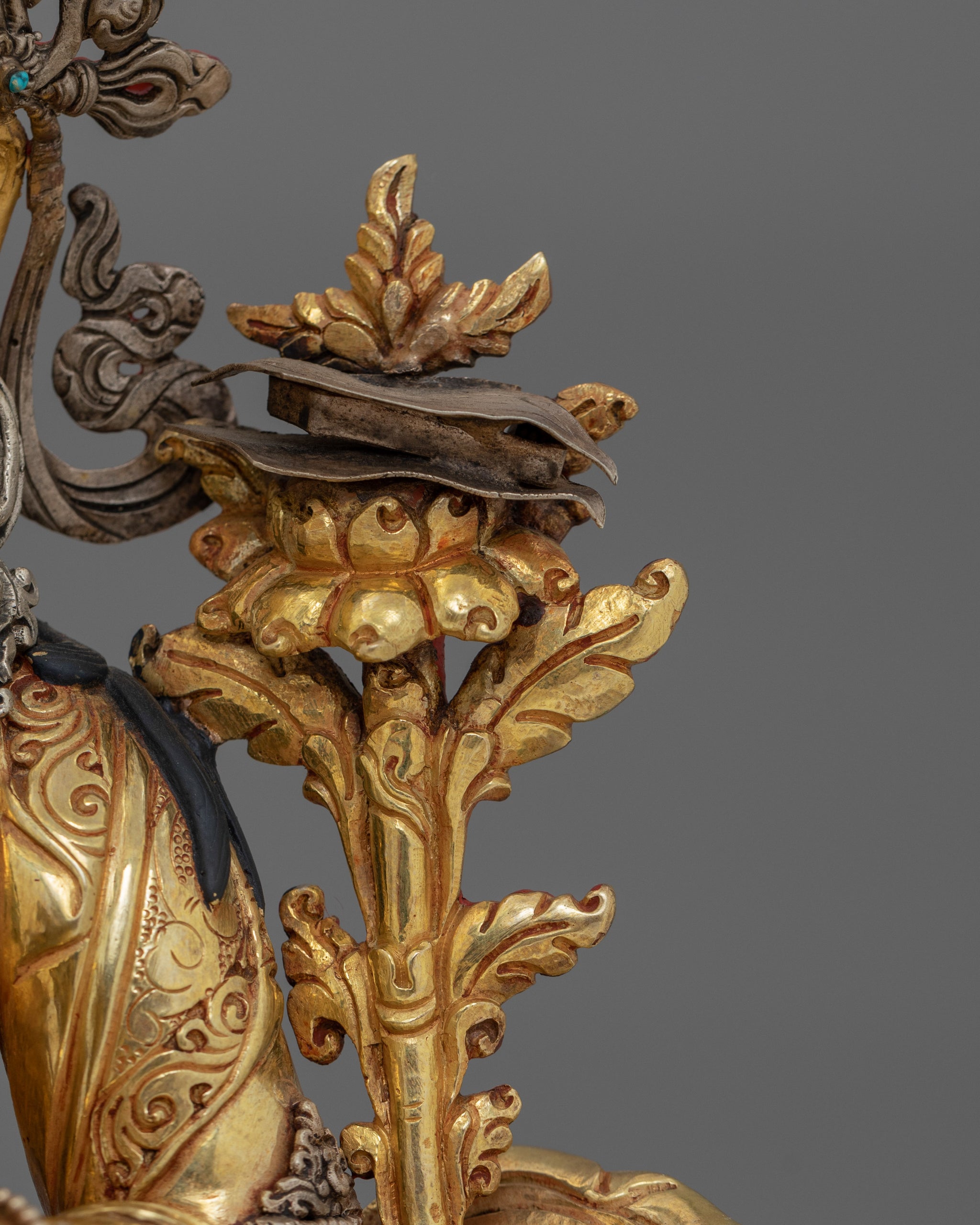 Standing Tibetan Kadampa Manjushri Statue 13.2" (33.5cm) tall and with a base width of 9.8" (25cm), this wonderfully constructed statue weighs 3.51 kg and has a copper body with superb 24K gold gilding. The artwork is further accentuated with gold and acrylic paintings, as well as a polished silver-plated finish that lends depth and complexity to the statue's religious aura.