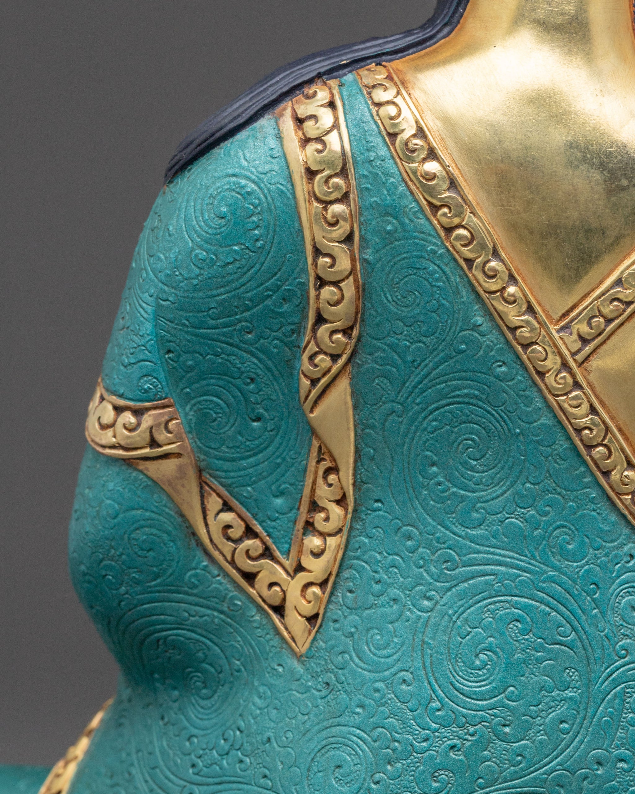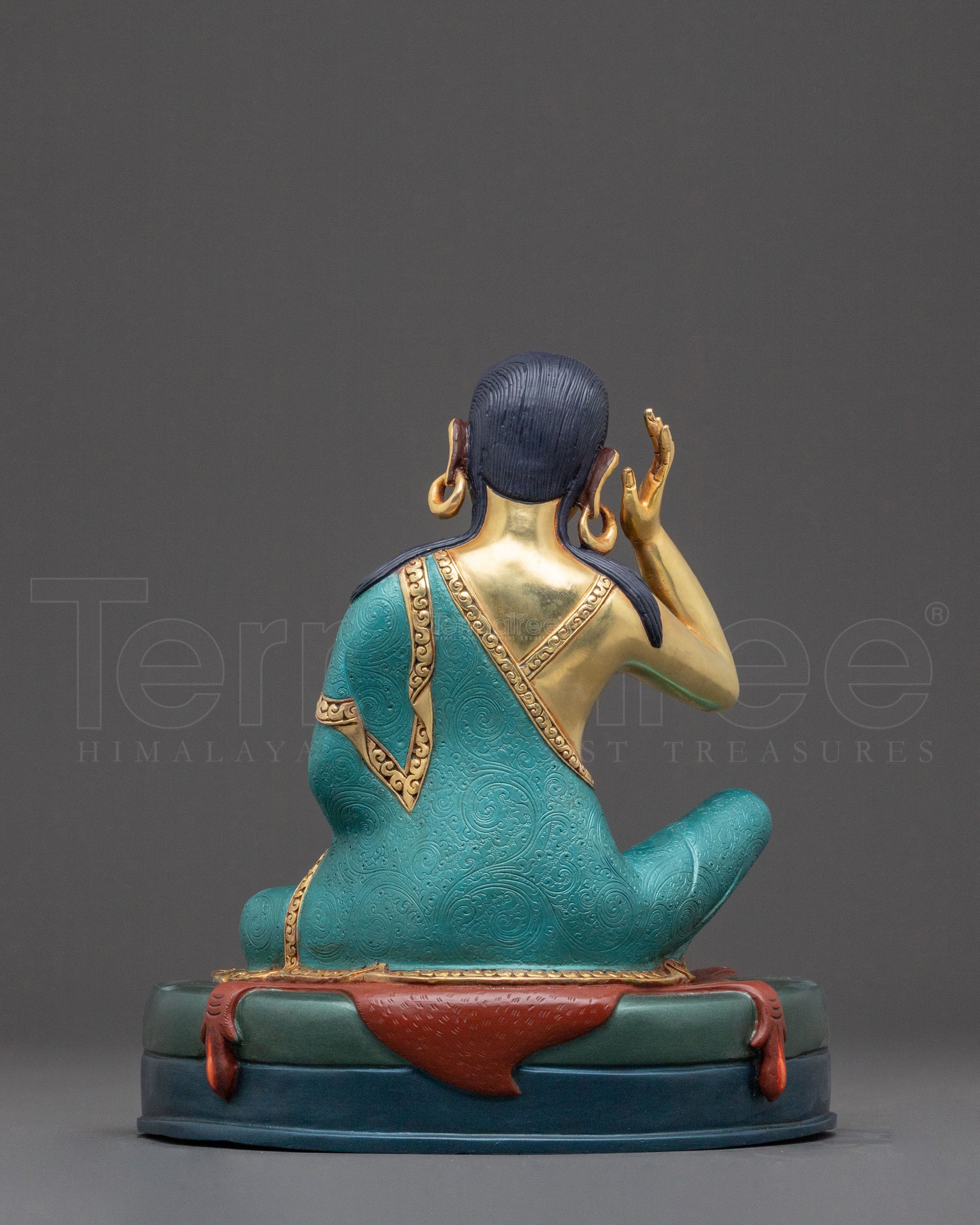 This Tibetan Milarepa statue, standing 24.5 cm tall on a 22 cm base and weighing 2.96 kg, captures the revered yogi in his iconic meditative pose. Crafted from solid copper, it features multi-layer 24K mercury-gold gilding for lasting radiance. Handcrafted in Nepal by master artisans, the statue's serene features are highlighted with delicate acrylic paintings and inlaid gemstones, adding subtle luminosity. Combining repoussé artistry with intricate detailing, this statue embodies both spiritual power and Himalayan craftsmanship.