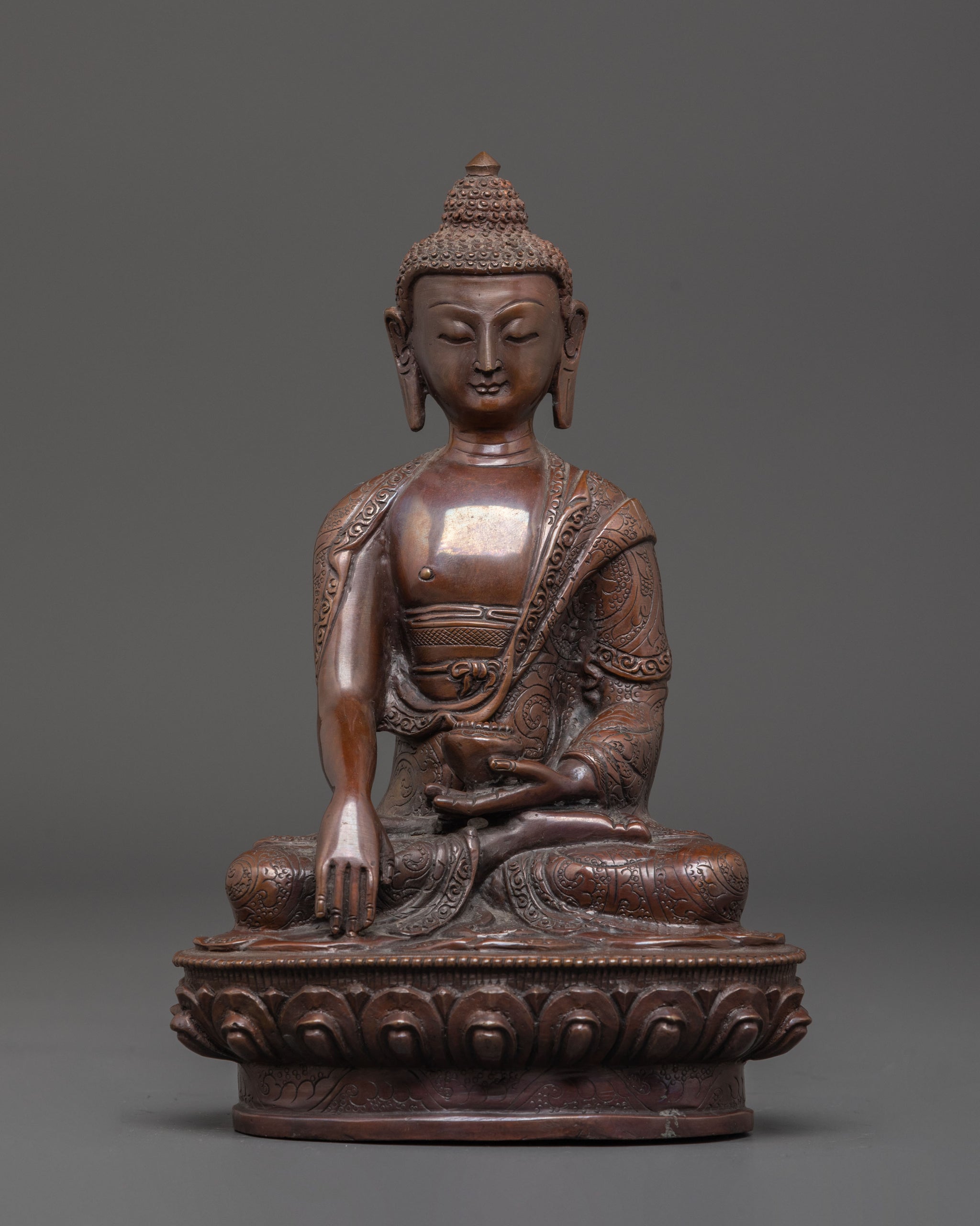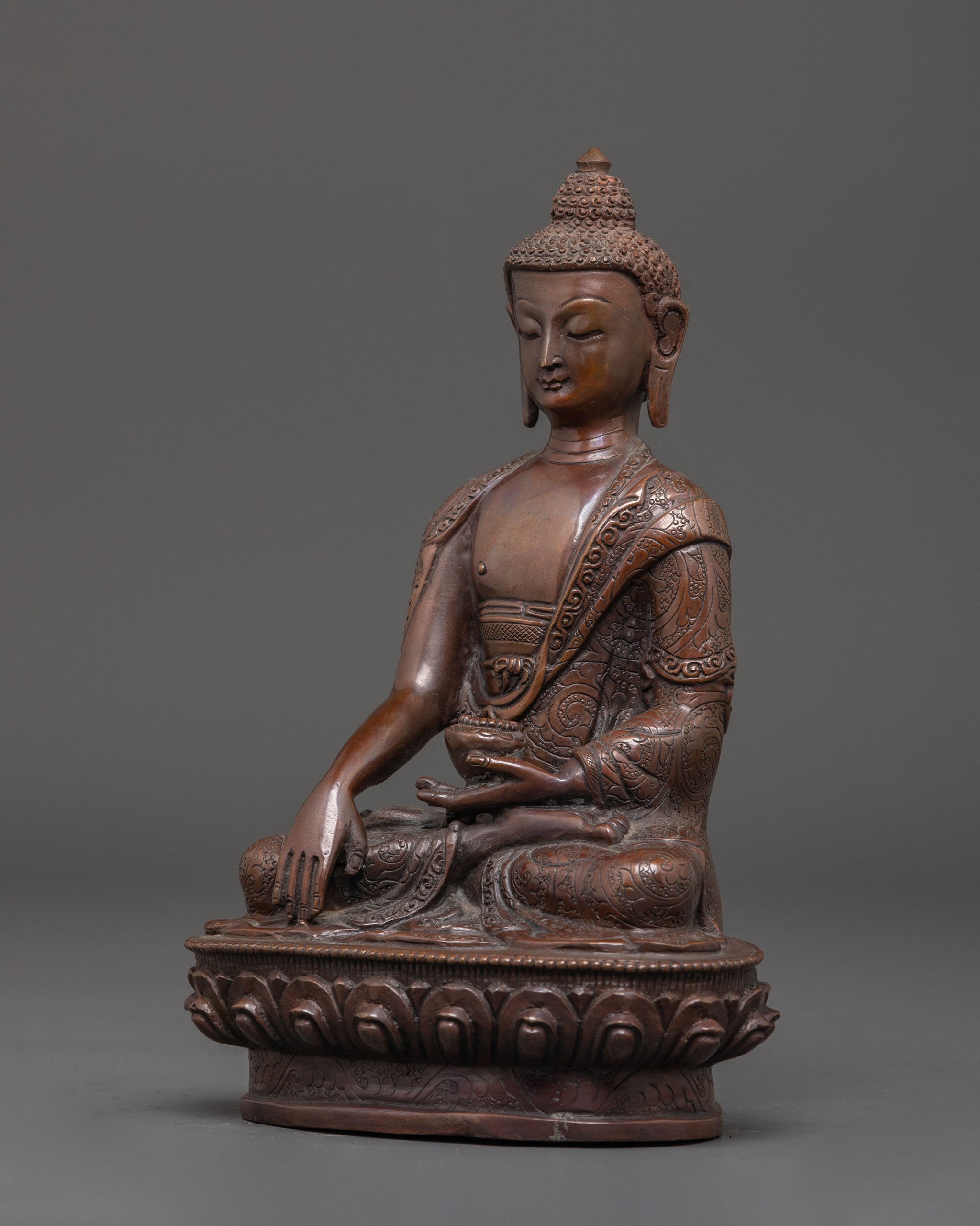 The statue depicts Shakyamuni Buddha seated in the padmasana (lotus posture) atop a lotus base, symbolizing purity and spiritual enlightenment. His right hand displays the bhumisparsha mudra (earth-touching gesture), marking the moment of enlightenment, while his left hand holds an alms bowl, representing renunciation and inner peace. This depiction captures the serene and dignified presence of the Buddha, making it a powerful symbol of spiritual awakening and serenity, ideal for meditation spaces, altars, or as a meaningful gift for practitioners.