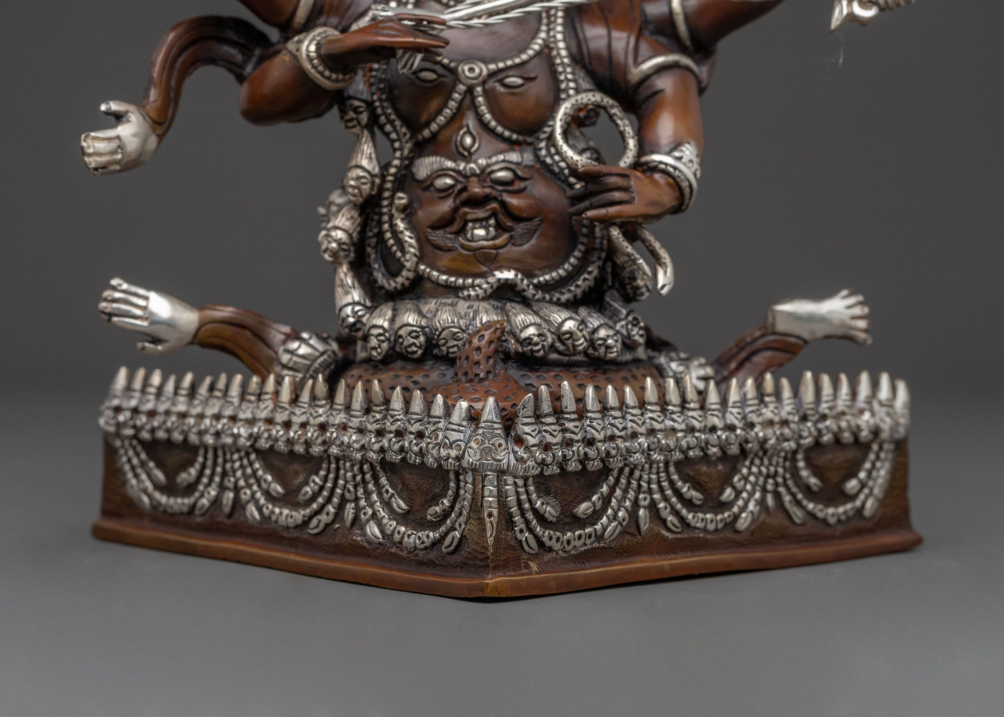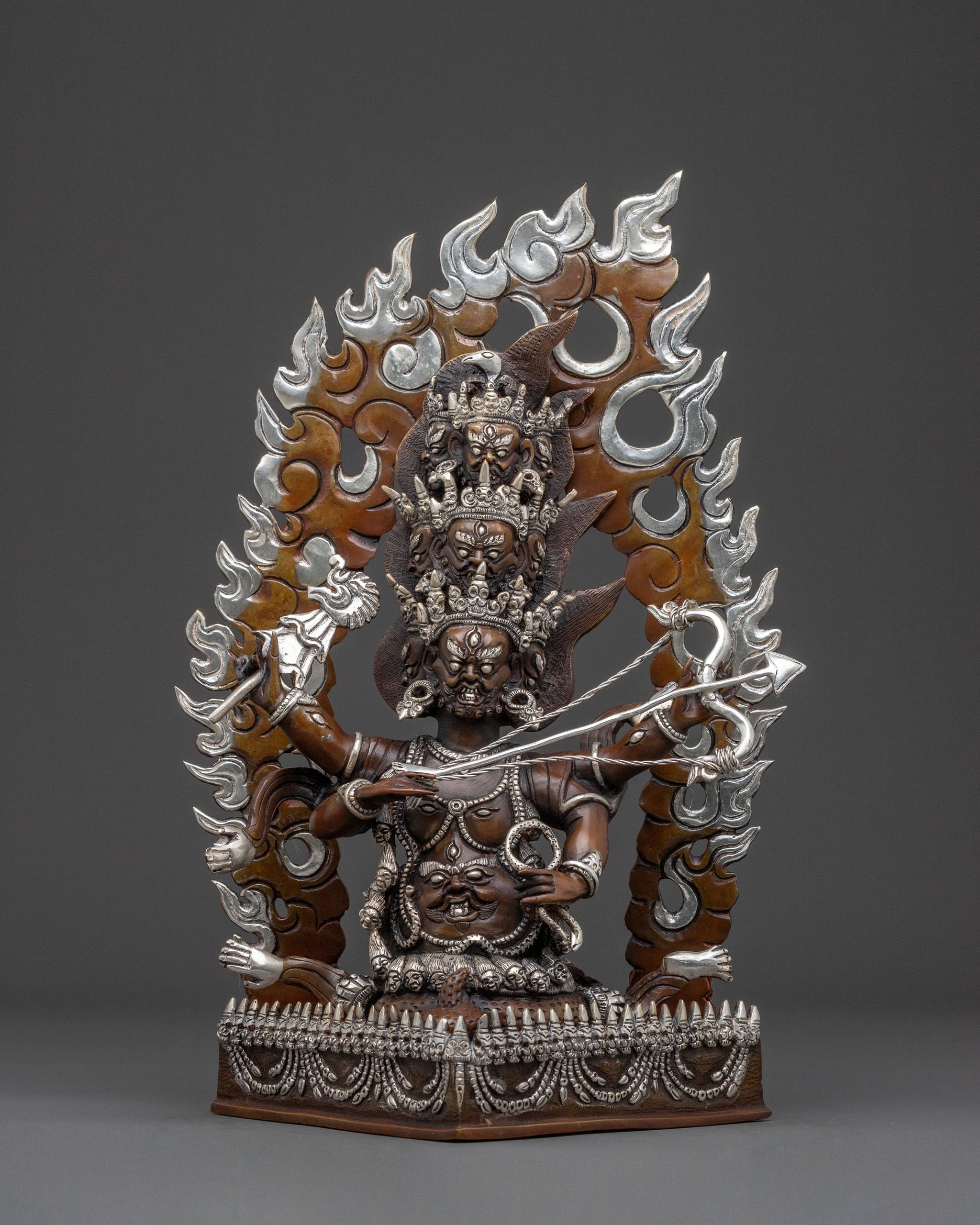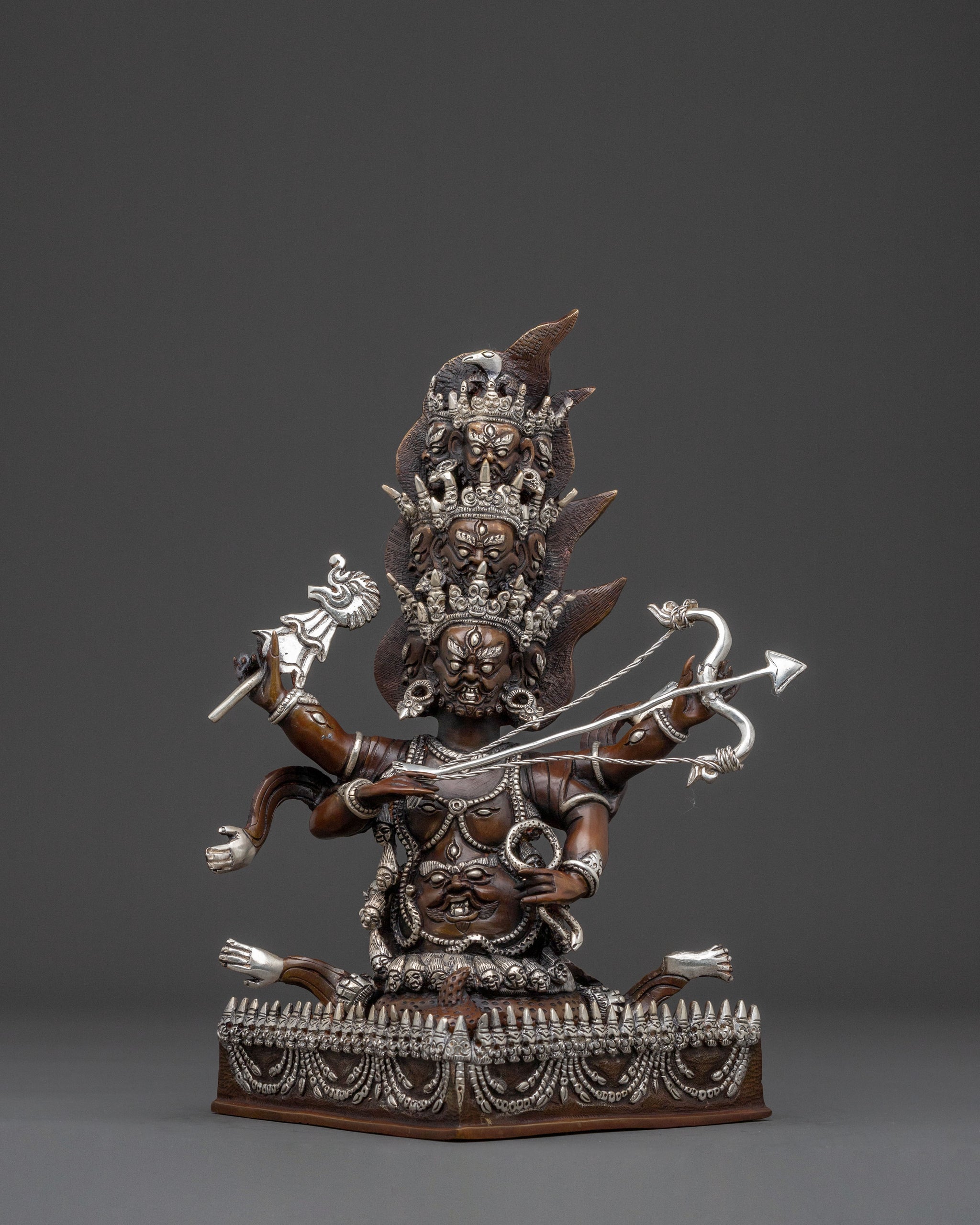 This magnificent Tibetan Rahula copper statue embodies fierce protection and profound wisdom. Standing 35cm (13.78 inches) tall with a 9.06-inch (23cm) base, this unique spiritual decor piece showcases Rahula in his formidable glory. Crafted from oxidized copper with intricate silver plating, this meditation statue resonates with ancient Himalayan craftsmanship and spiritual power, making it perfect for any sacred space. Handcrafted in Nepal by skilled artisans, it invites both strength and contemplation into your environment.