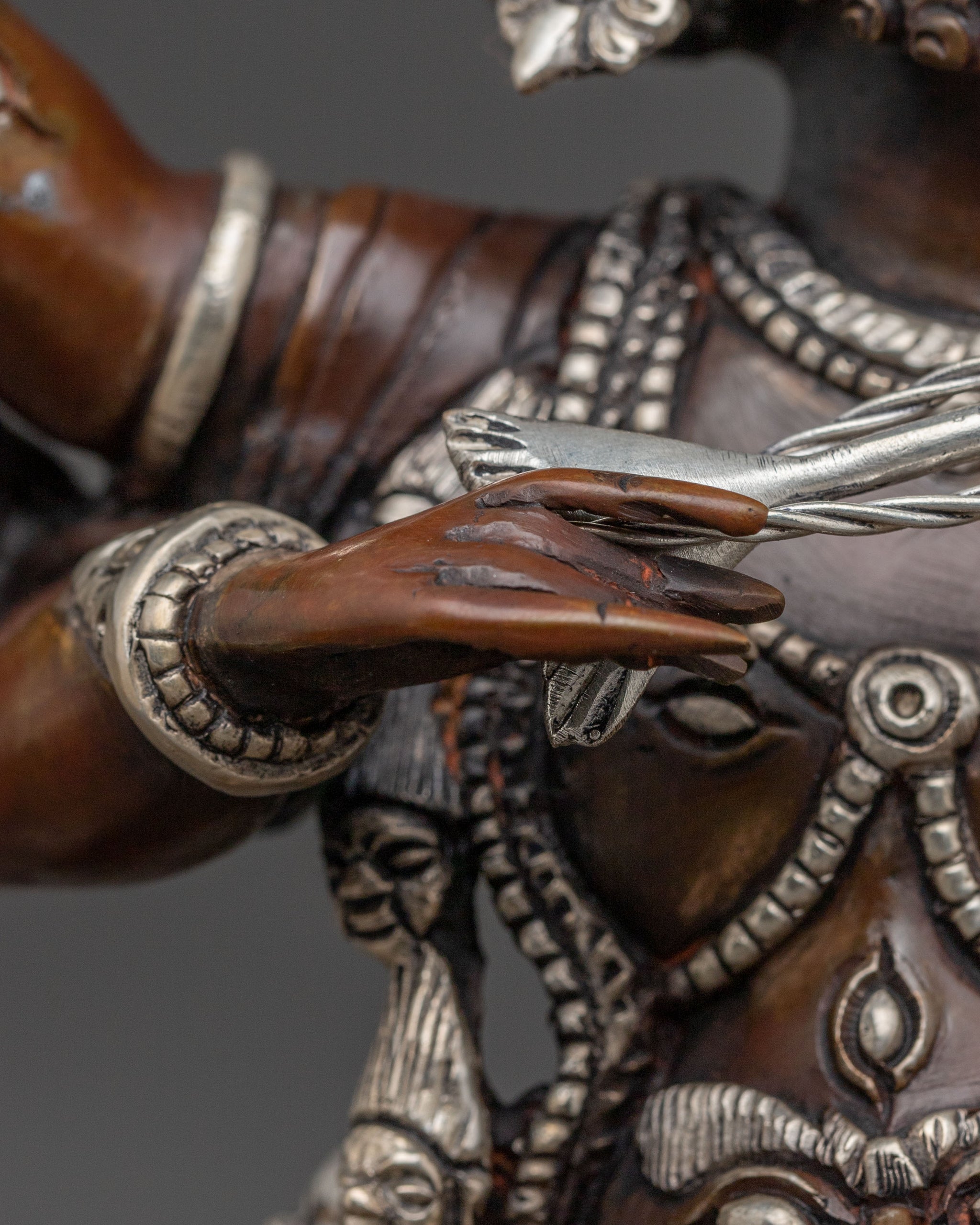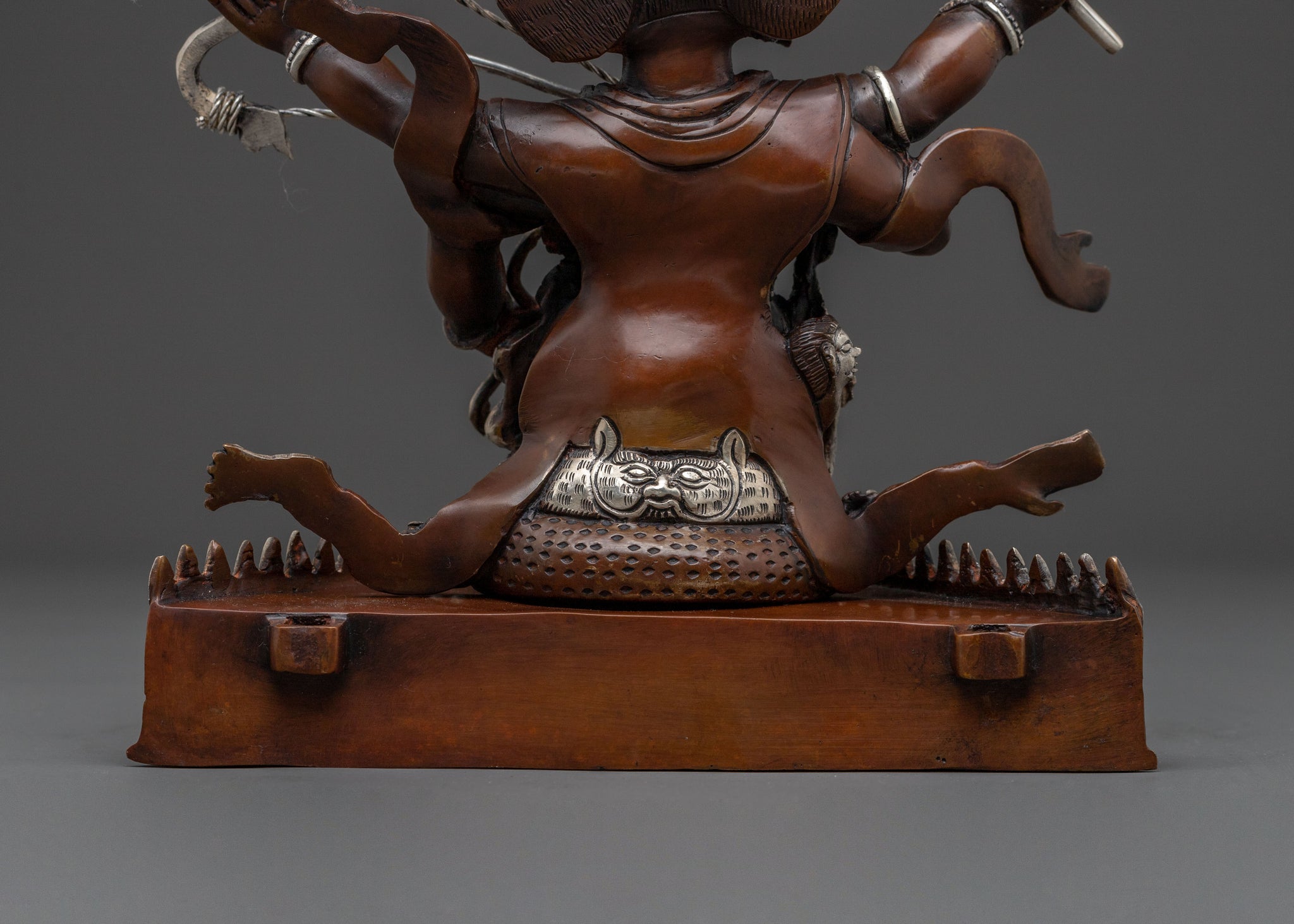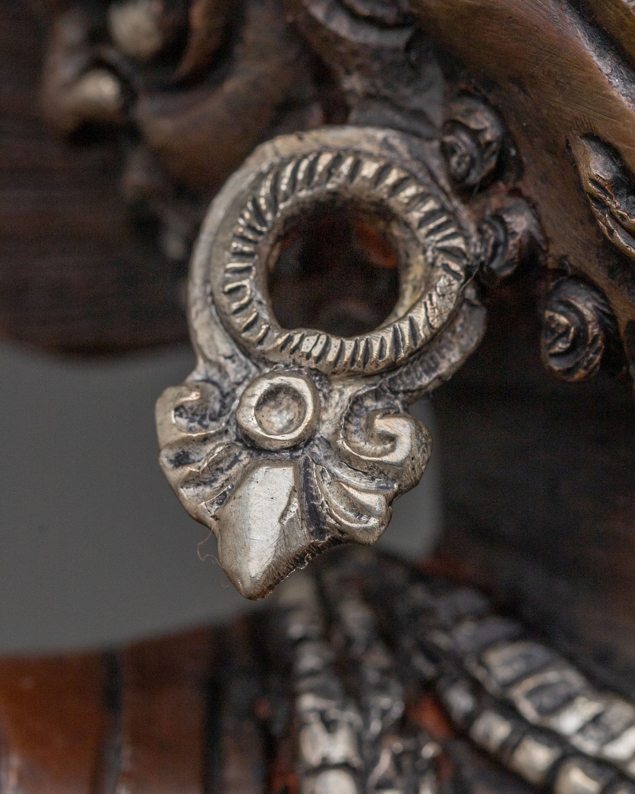 This magnificent Tibetan Rahula copper statue embodies fierce protection and profound wisdom. Standing 35cm (13.78 inches) tall with a 9.06-inch (23cm) base, this unique spiritual decor piece showcases Rahula in his formidable glory. Crafted from oxidized copper with intricate silver plating, this meditation statue resonates with ancient Himalayan craftsmanship and spiritual power, making it perfect for any sacred space. Handcrafted in Nepal by skilled artisans, it invites both strength and contemplation into your environment.