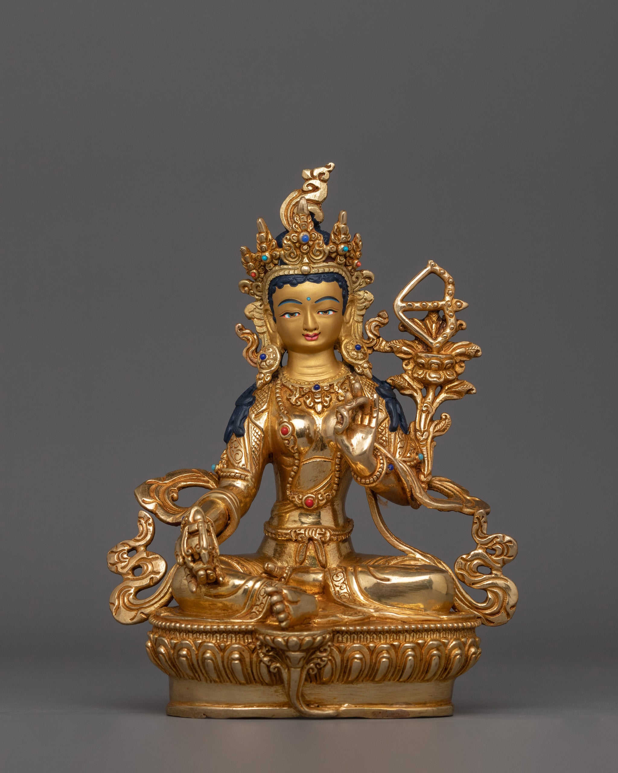 The Traditional Statue of Red Tara, crafted from copper, 24k gold gilding, stands at a height of 8.9”/22.5cm (Height) and 6.3”/16cm (Base), with a total weight of 1.67kg. Red Tara, known for her ability to remove obstacles and bestow blessings of empowerment and magnetism, is beautifully captured in this detailed form. With every curve and detail, this figure represents both strength and grace, making it a sacred symbol of divine feminine energy.