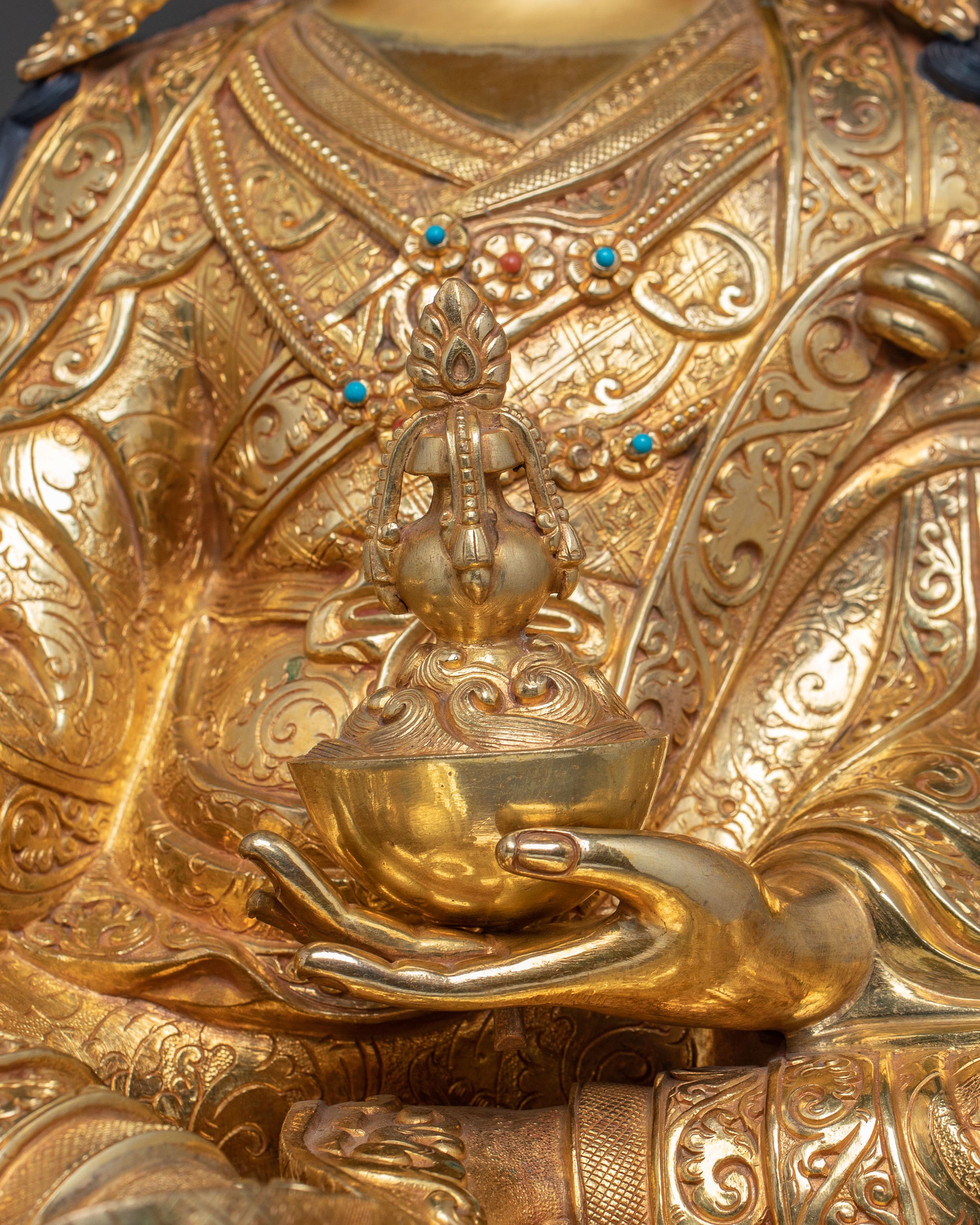 A magnificent traditional Padmasambhava statue, also known as Guru Rinpoche, emerges in serene grandeur, handcrafted in Nepal. Standing 51cm tall (20.08”) with a base width of 14.17” (36cm) and weighing 12.27 kg, this powerful yet peaceful figure is skillfully cast in copper and richly gilded in 24K gold. The surface showcases deeply engraved carvings that create a stunning 3D-like effect, highlighting the rich textures and intricate details. The combination of 24K gold gilding, copper, acrylic paintings, and gemstones enhances the statue’s divine presence, making it a striking symbol of spiritual power, wisdom, and serenity.