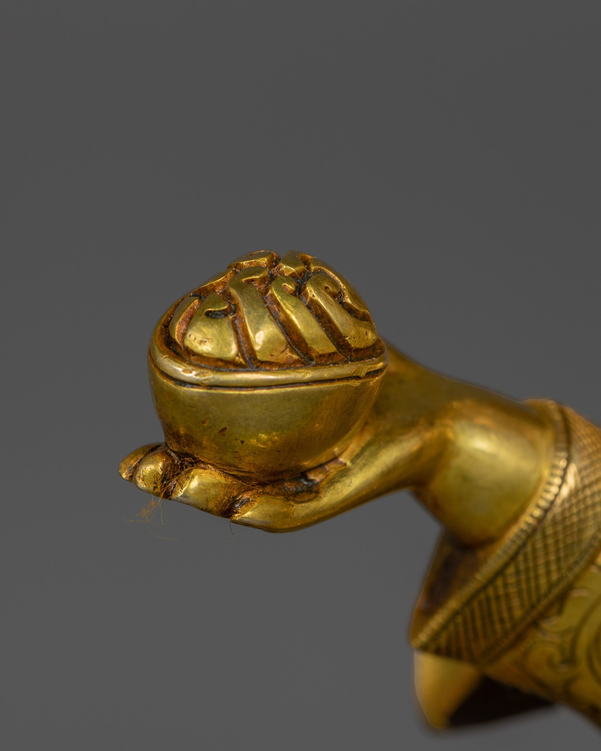 Vajrayogini is stunning. The details are amazing. It's easy to make out her facial expressions, skulls, feet, and the ring of fire around her. You can tell she's handmade. There is a consecration hole in her back.