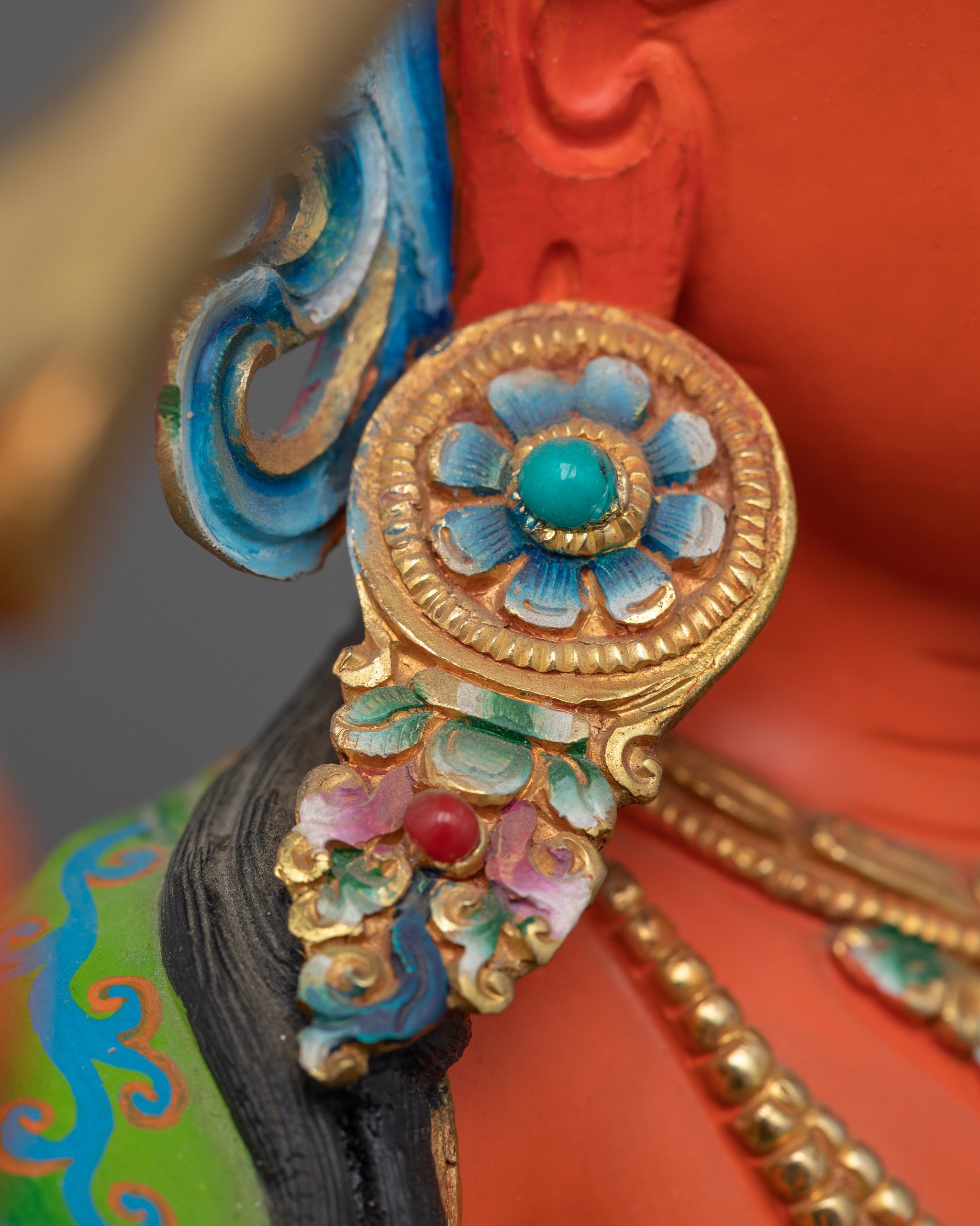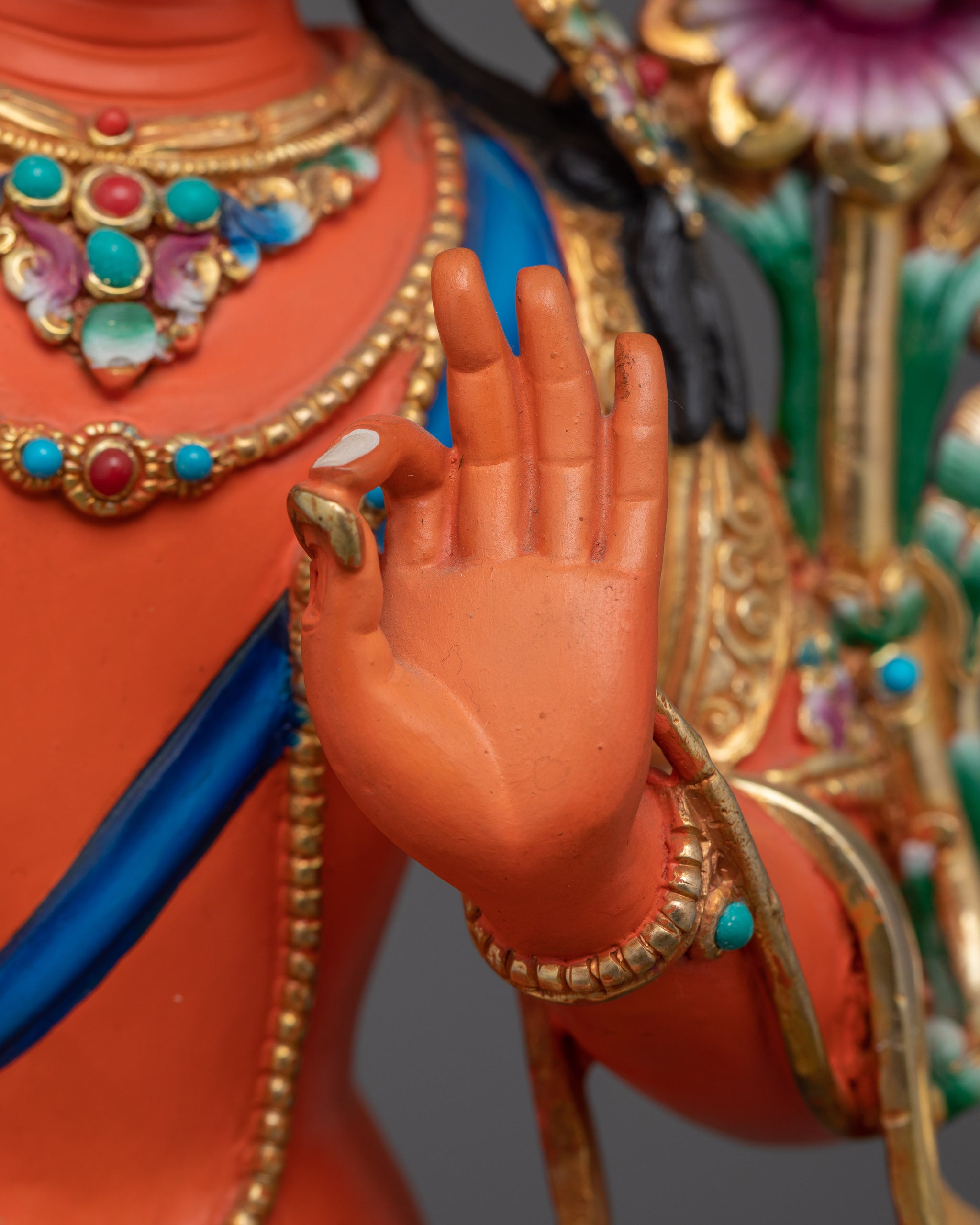 Vajrayogini is stunning. The details are amazing. It's easy to make out her facial expressions, skulls, feet, and the ring of fire around her. You can tell she's handmade. There is a consecration hole in her back.
