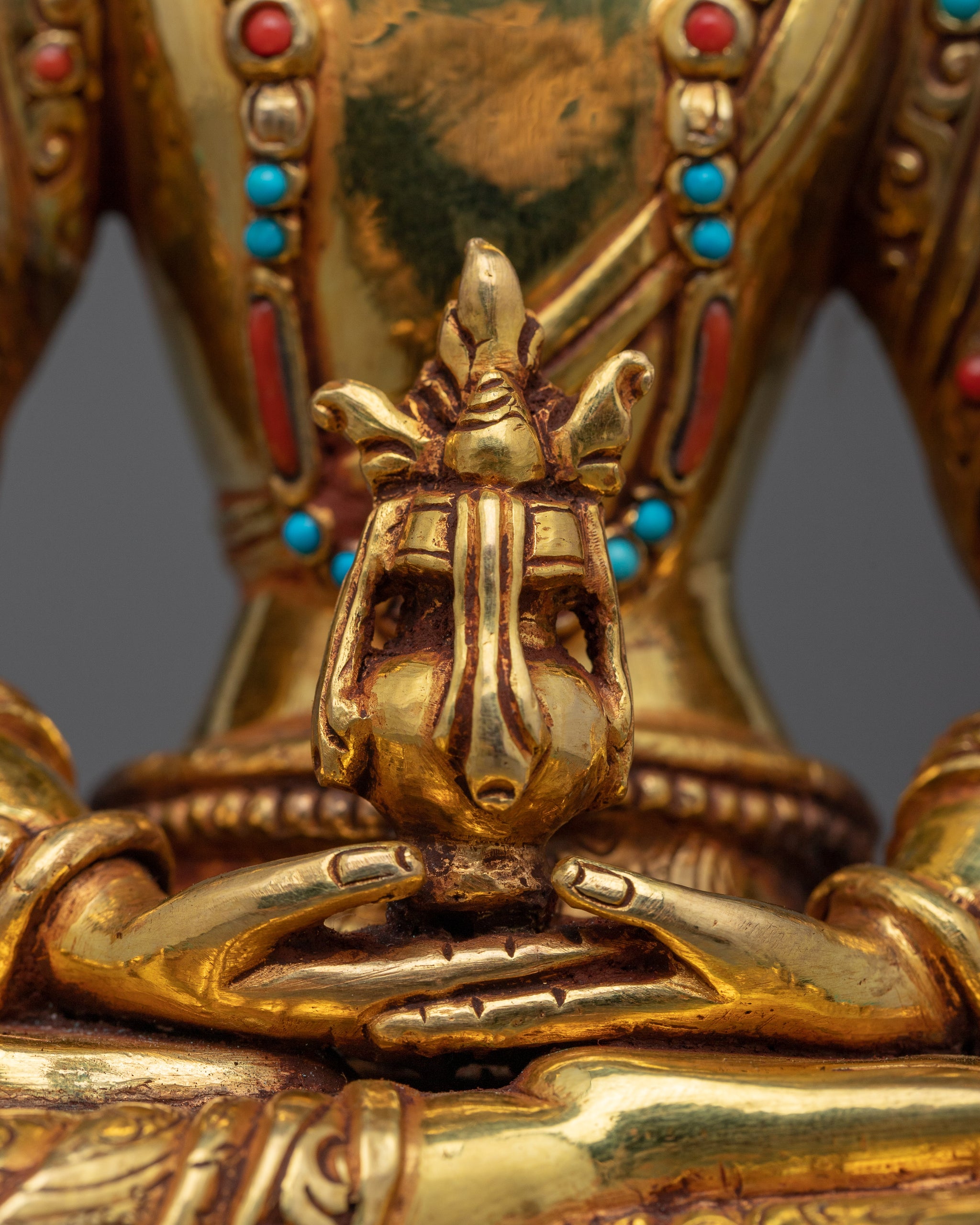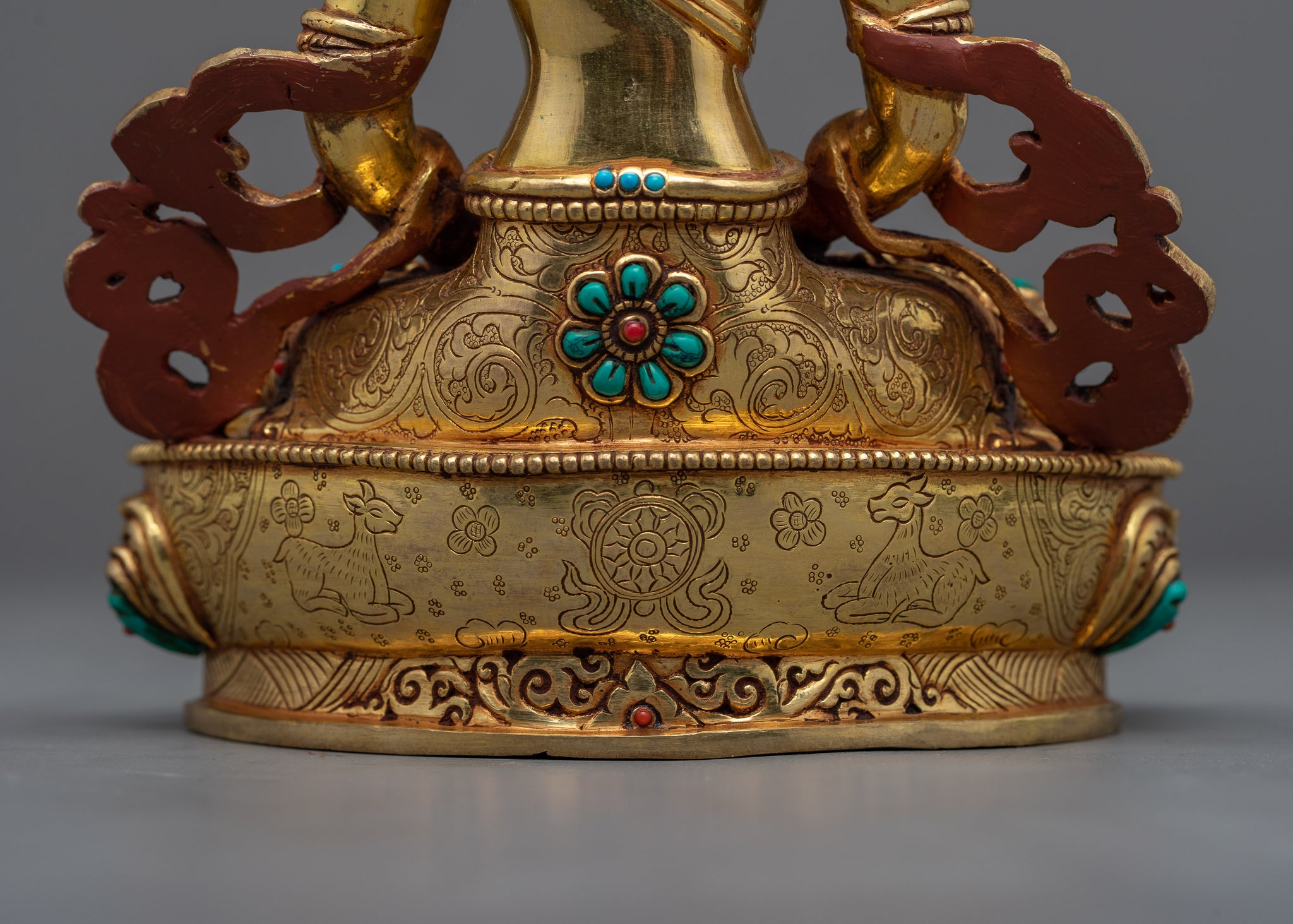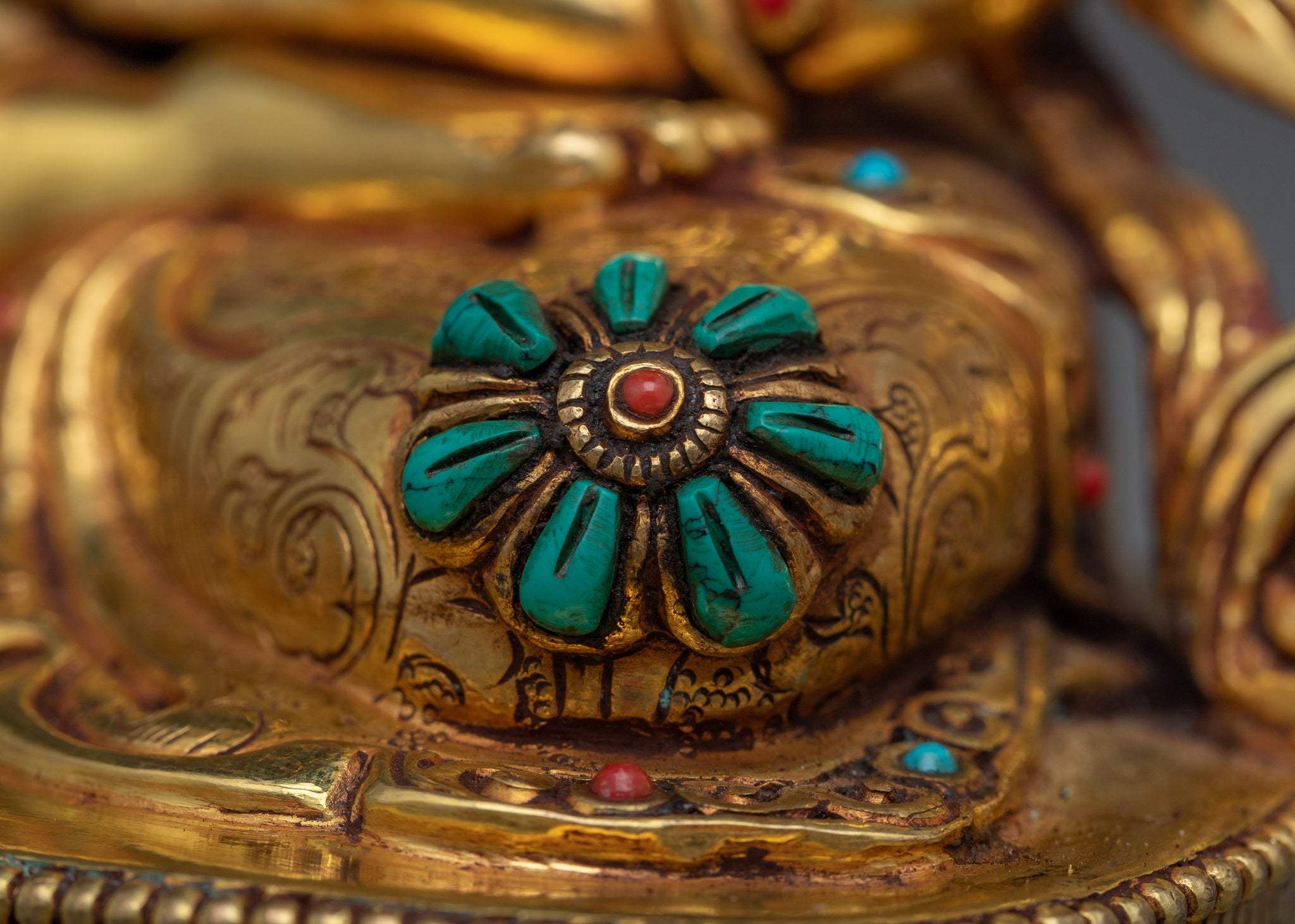 This divine image, expertly produced by our artisans in Nepal, has a copper body embellished with triple layers of 24k gold gilding that highlights the figure's nuances and depth. Hand-carved jewels, as well as 24k gold and acrylic paintings, add to the statue's vibrancy, while the deeply engraved designs and hand-carved stones heighten the 3D impact, transforming it into an object of great veneration.