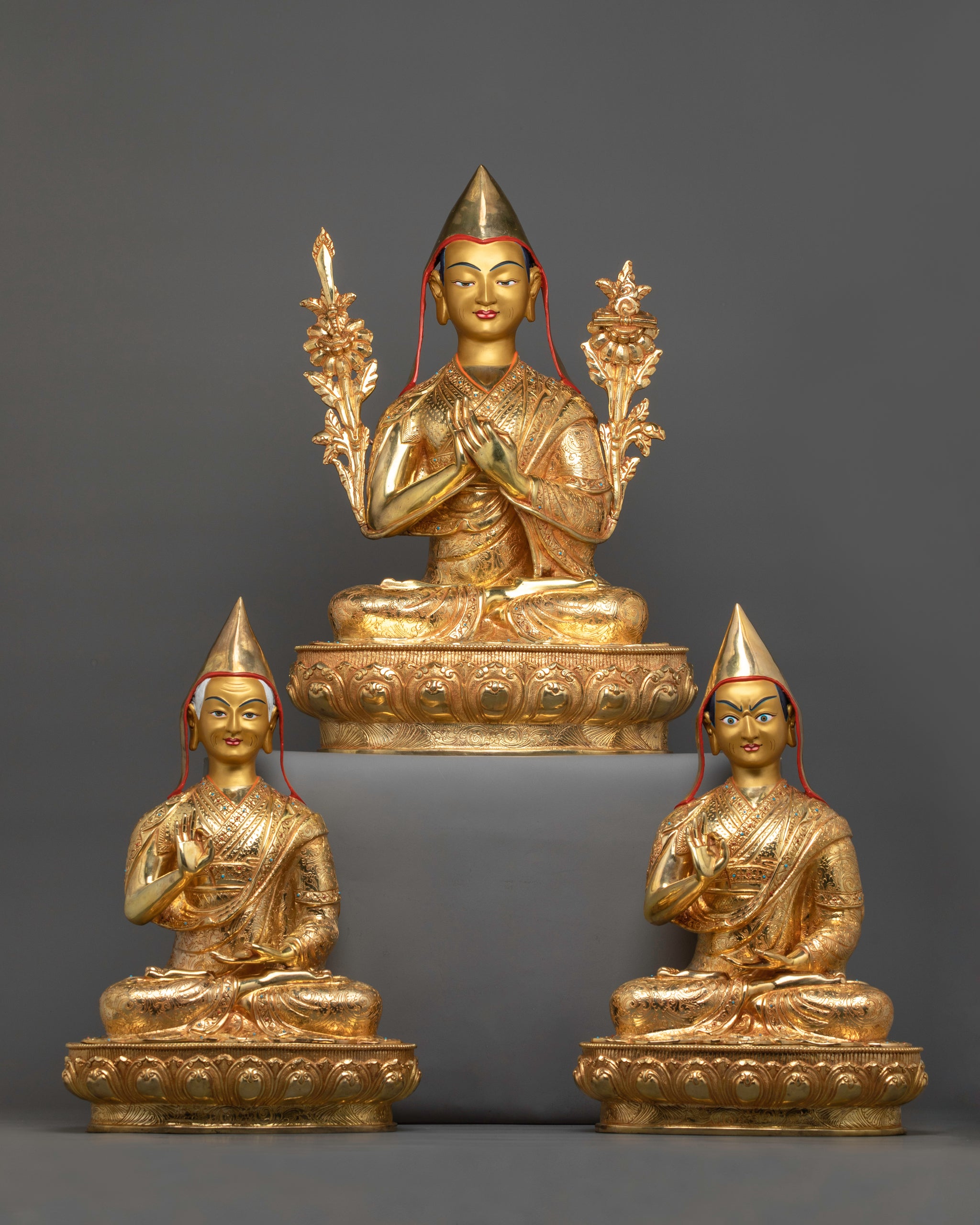 With this dazzling statue set showing Tsongkhapa, a Buddha in The Land of Snows, accompanied by two devoted pupils, you can enter the tranquil realm. This magnificent set is not only a spiritual centerpiece but also a work of art, ready to fill your holy space with a profound sense of wisdom and peace.