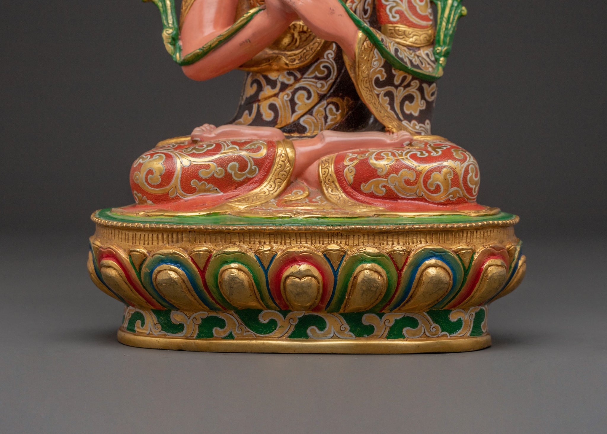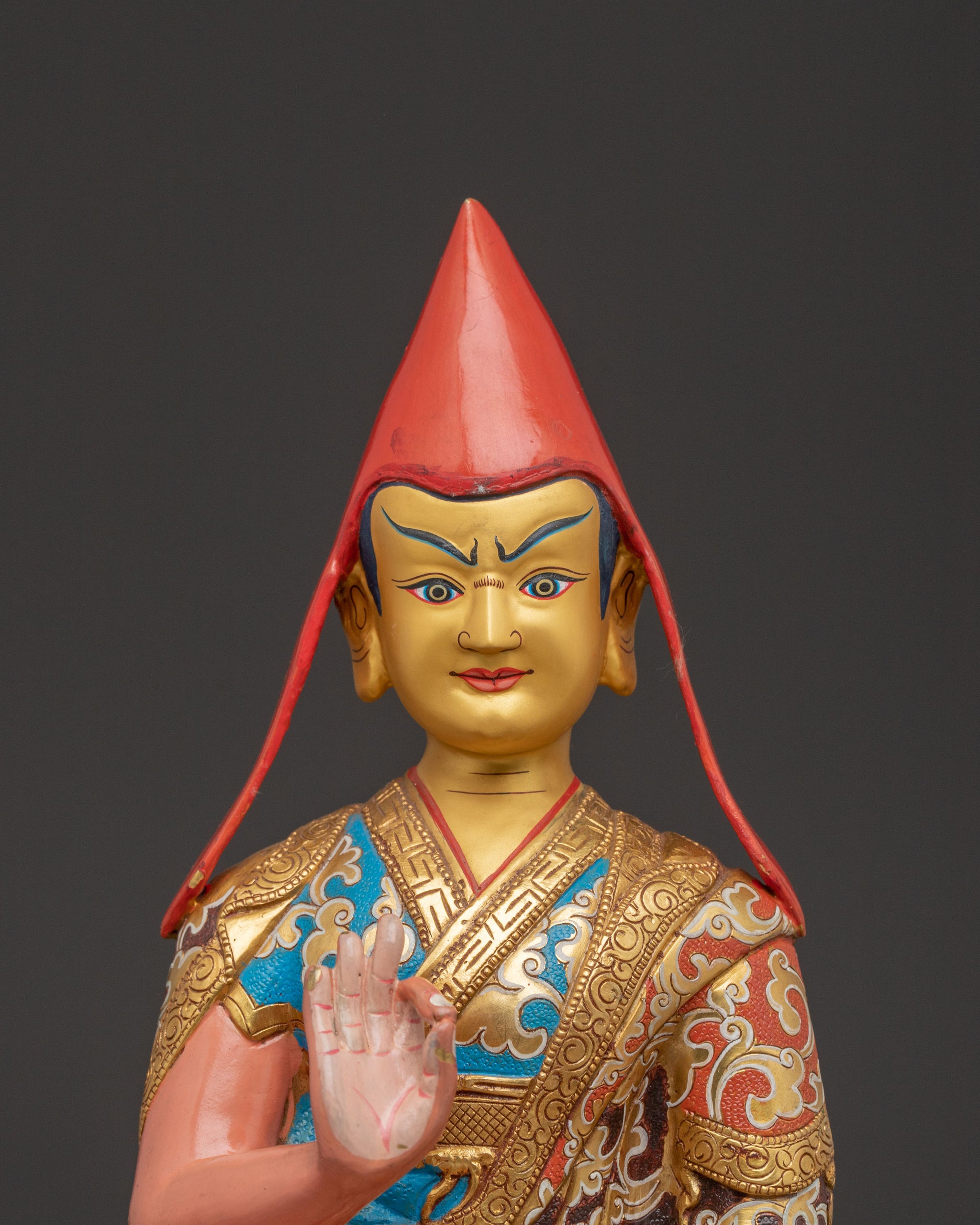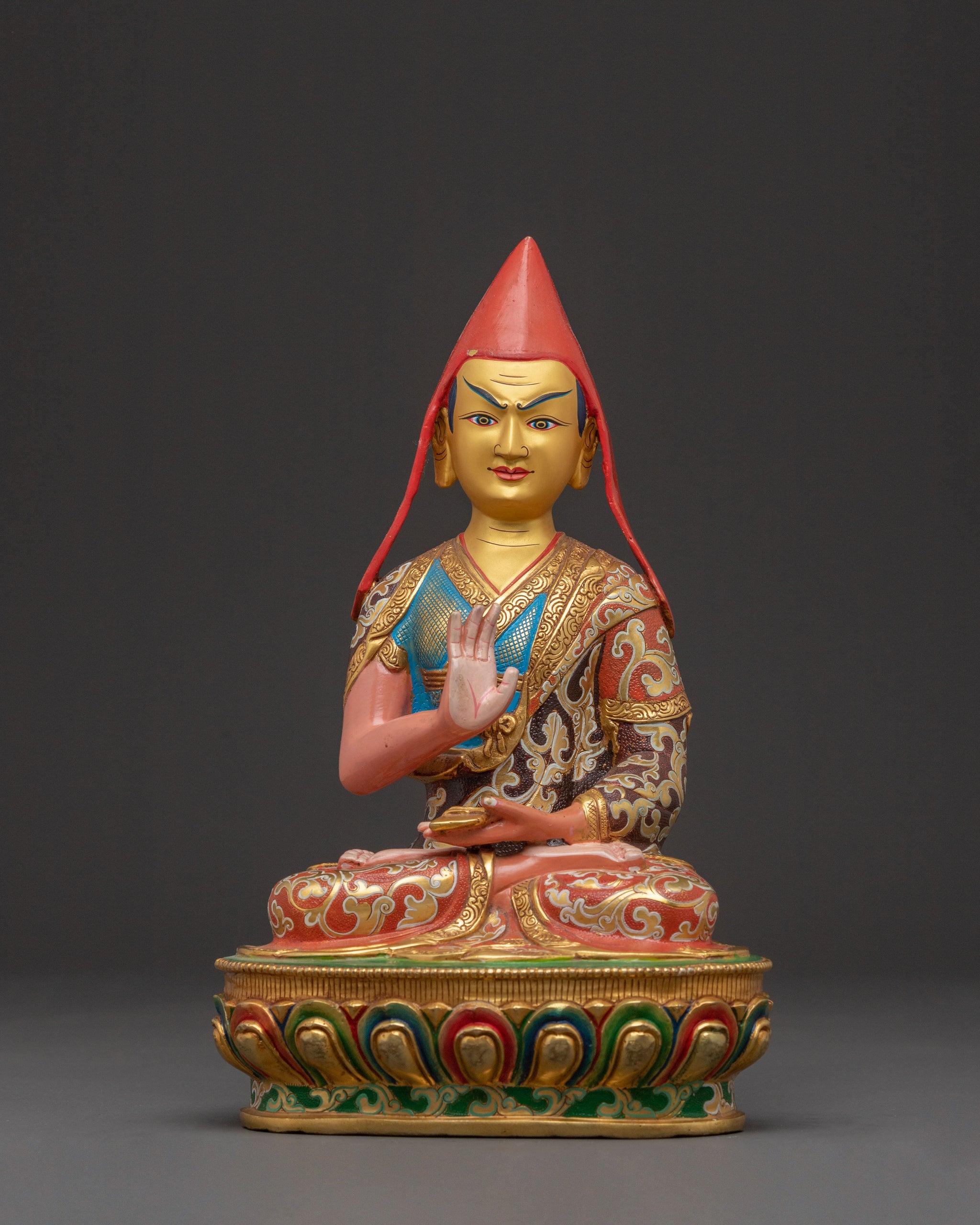 Tsongkhapa is depicted in his signature teaching mudra, symbolizing the clarity and vastness of his teachings on the Middle Way. His disciples, Khedrup Je and Gyaltsab Je, represent the continuity of the Gelug tradition, embodying profound dedication and understanding. This statue deeply symbolizes the transmission of pure dharma and unwavering wisdom.