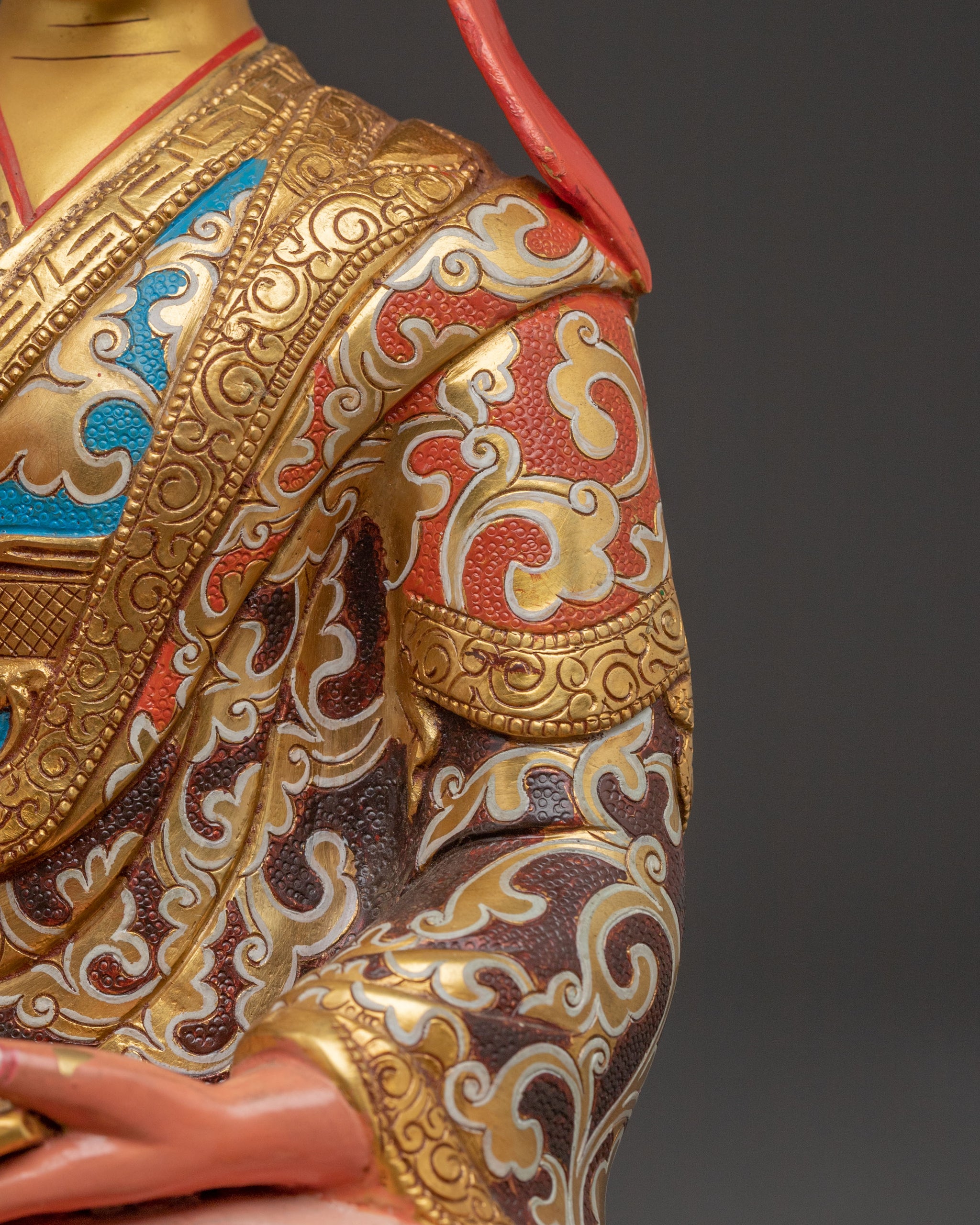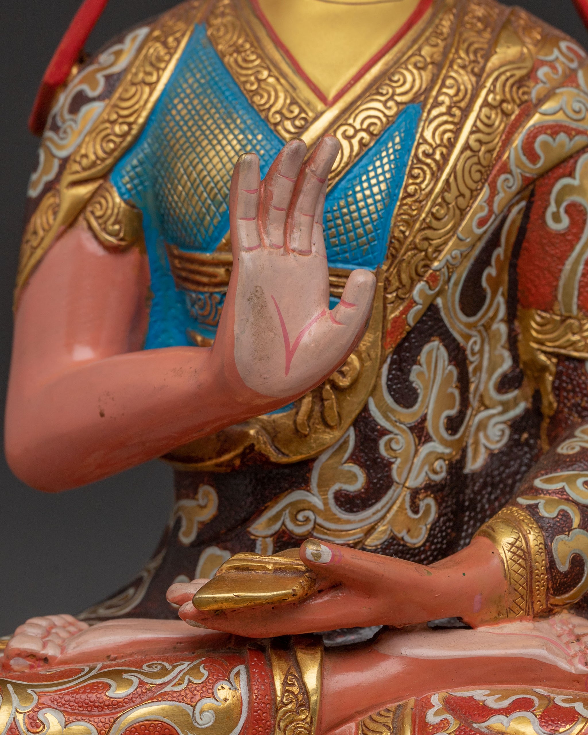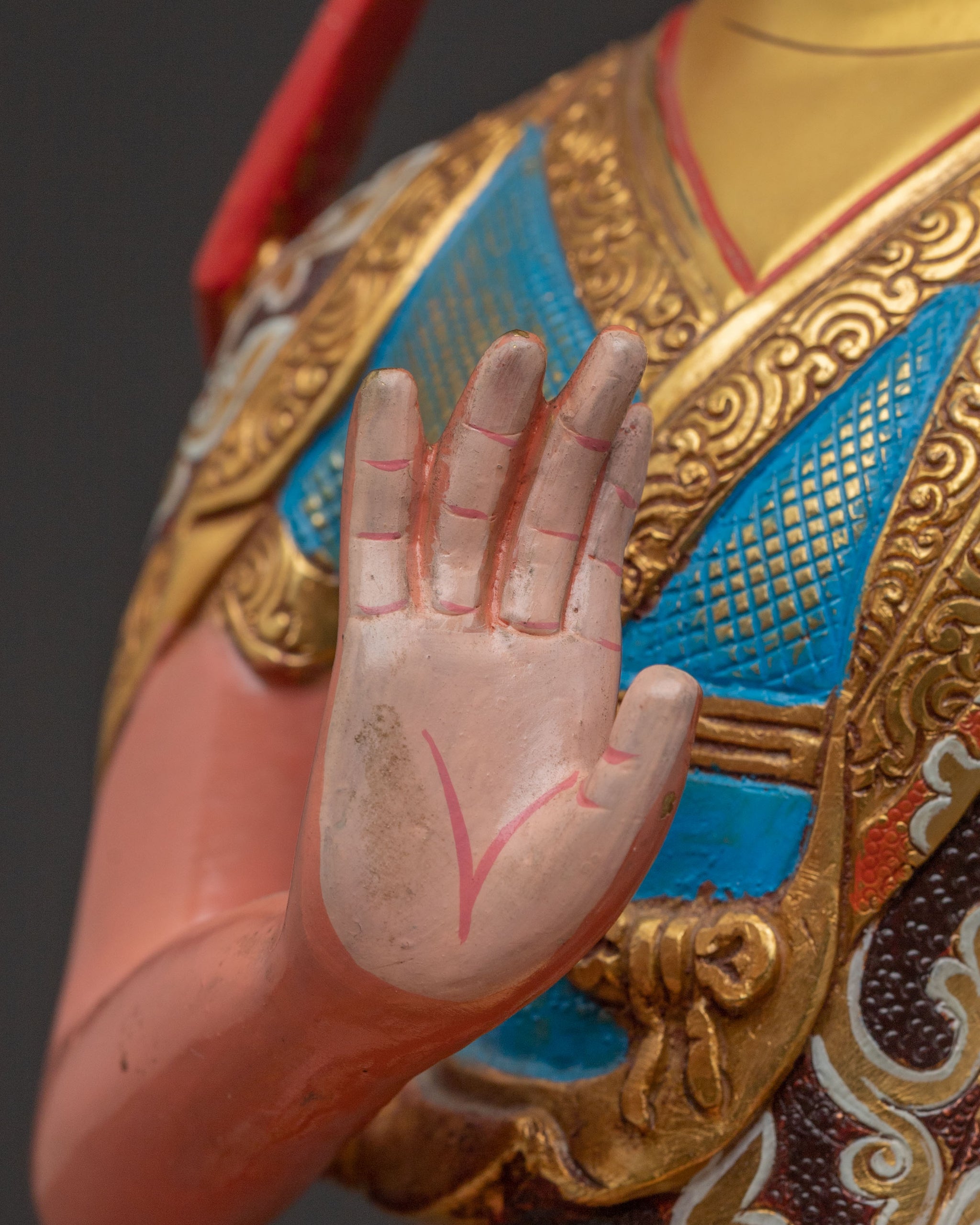 Tsongkhapa is depicted in his signature teaching mudra, symbolizing the clarity and vastness of his teachings on the Middle Way. His disciples, Khedrup Je and Gyaltsab Je, represent the continuity of the Gelug tradition, embodying profound dedication and understanding. This statue deeply symbolizes the transmission of pure dharma and unwavering wisdom.