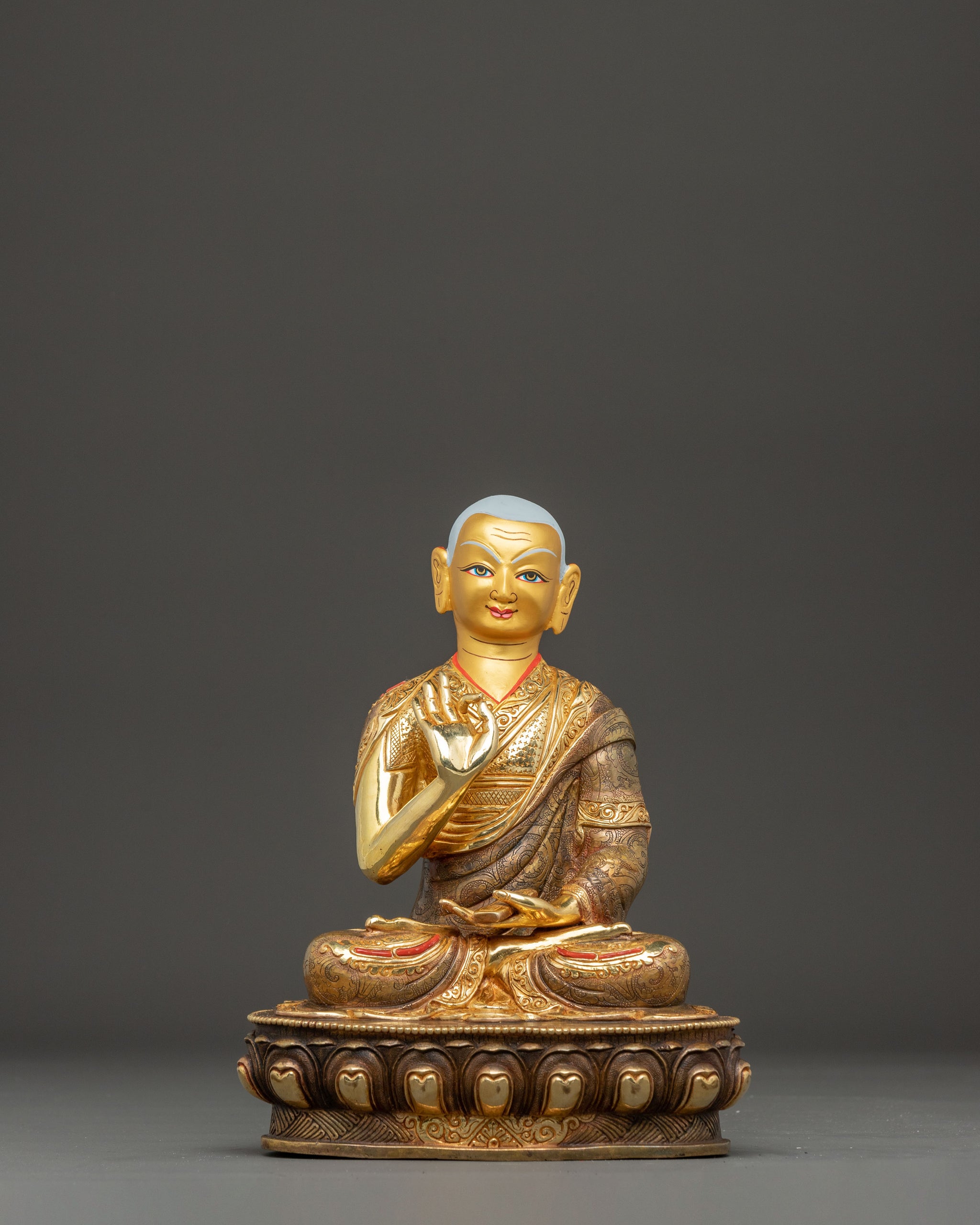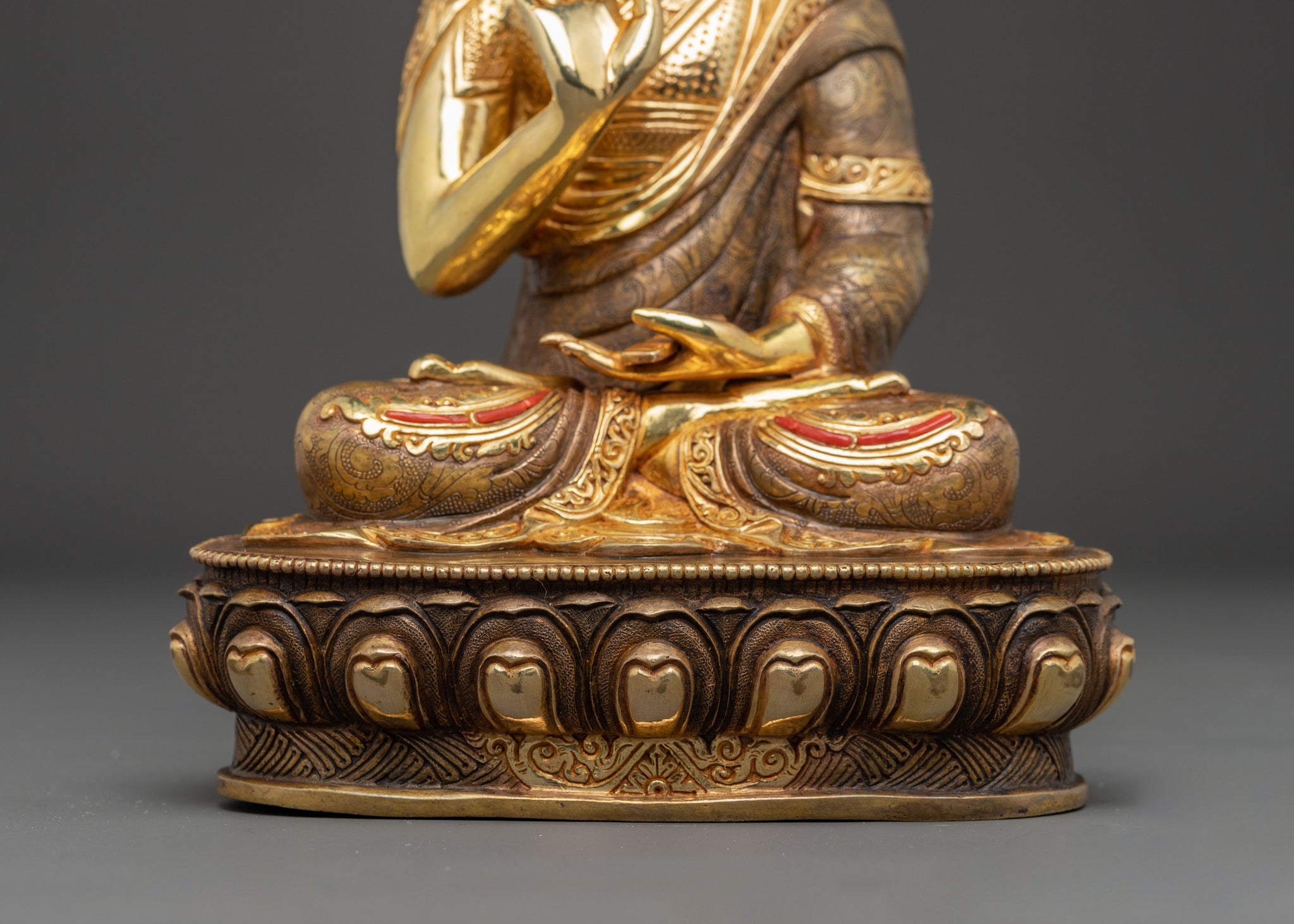 Tsongkhapa, the founder of the Gelug school, is shown in a serene meditative position, embodying profound wisdom and inner peace. His hands form the Dharma Chakra Mudra, symbolizing the spinning of the Wheel of Dharma and the teaching of the Buddha’s path. The two disciples, Je Gyaltsab and Je Khedrup, flank their teacher, representing the transmission of knowledge and the continuation of the Gelug tradition. Their postures reflect dedication to study and practice. This set is a powerful emblem of wisdom, devotion, and the preservation of the Dharma, making it a treasured centerpiece for any spiritual altar or meditation room.