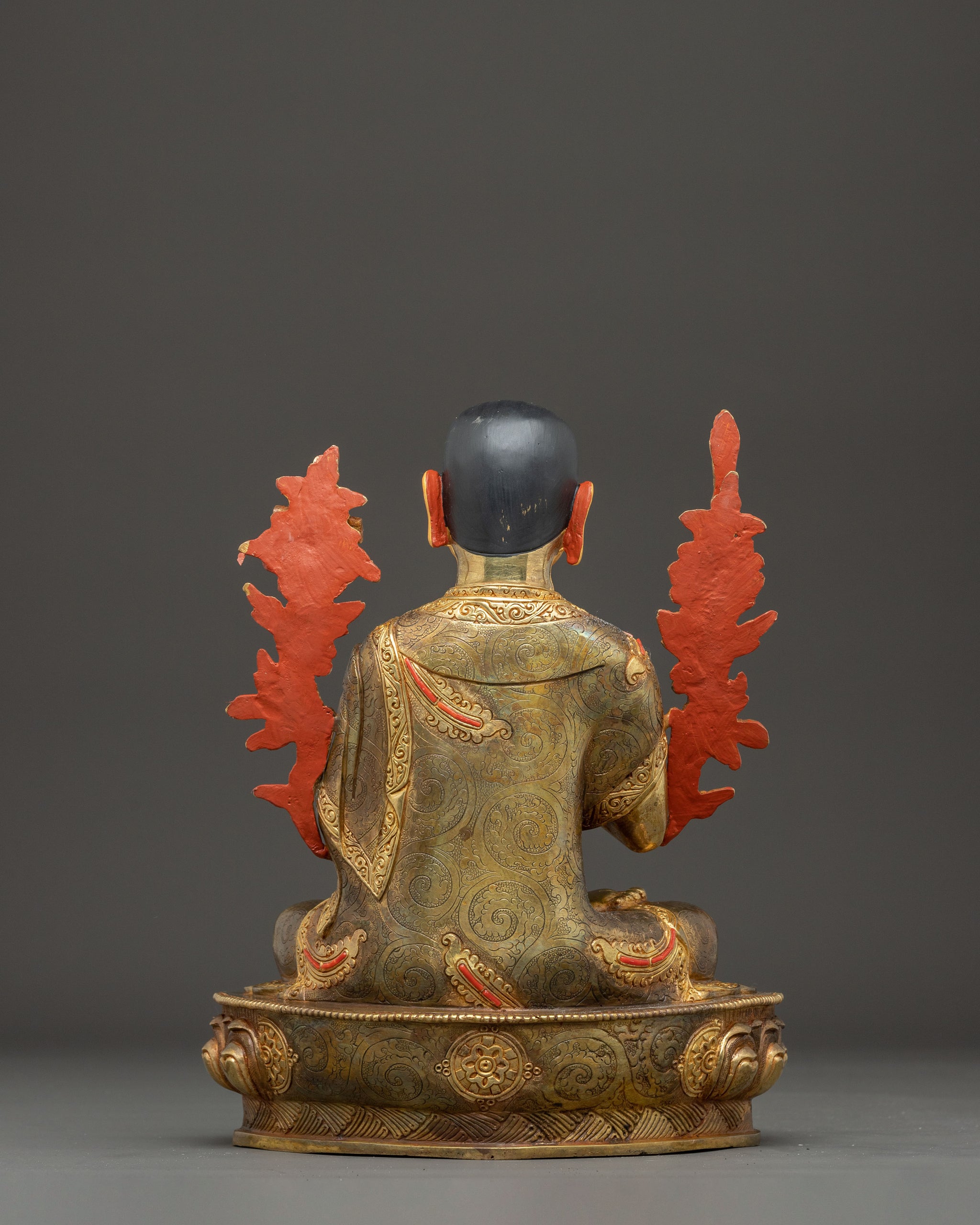 This handmade Tsongkhapa statue set features three finely crafted statues—Tsongkhapa, measuring 11.2”/28.5cm in height and 9.1”/23cm at the base. Meticulously made from copper and adorned with 24K gold gilding along with acrylic paintings, these statues radiate both spiritual significance and artistic elegance.