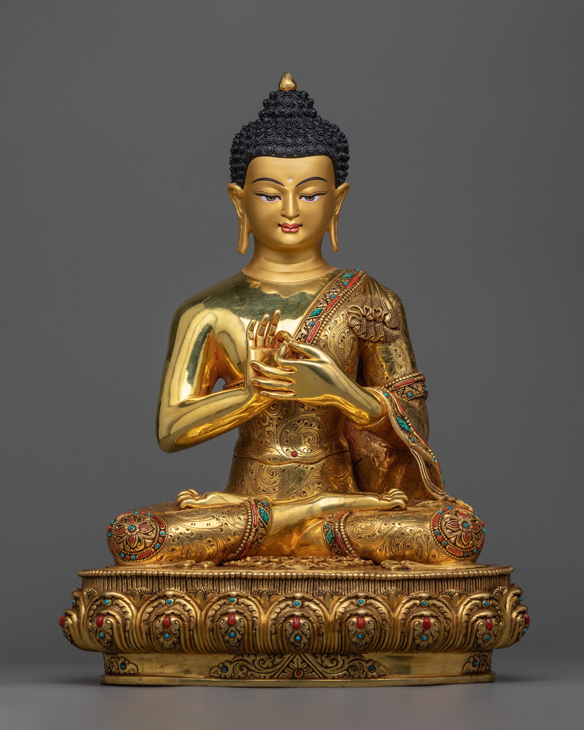 Vairocana is the principal figure of the Five Dhyani Buddhas, representing the Buddha's teachings in their purest form. This statue faithfully replicates his position and mudras, functioning as an iconographic tool to enhance meditation and contemplative techniques. The statue, when used as a centerpiece in any room, has a dominating yet serene atmosphere, inviting one to ponder on the inner light that dispels the darkness of ignorance.