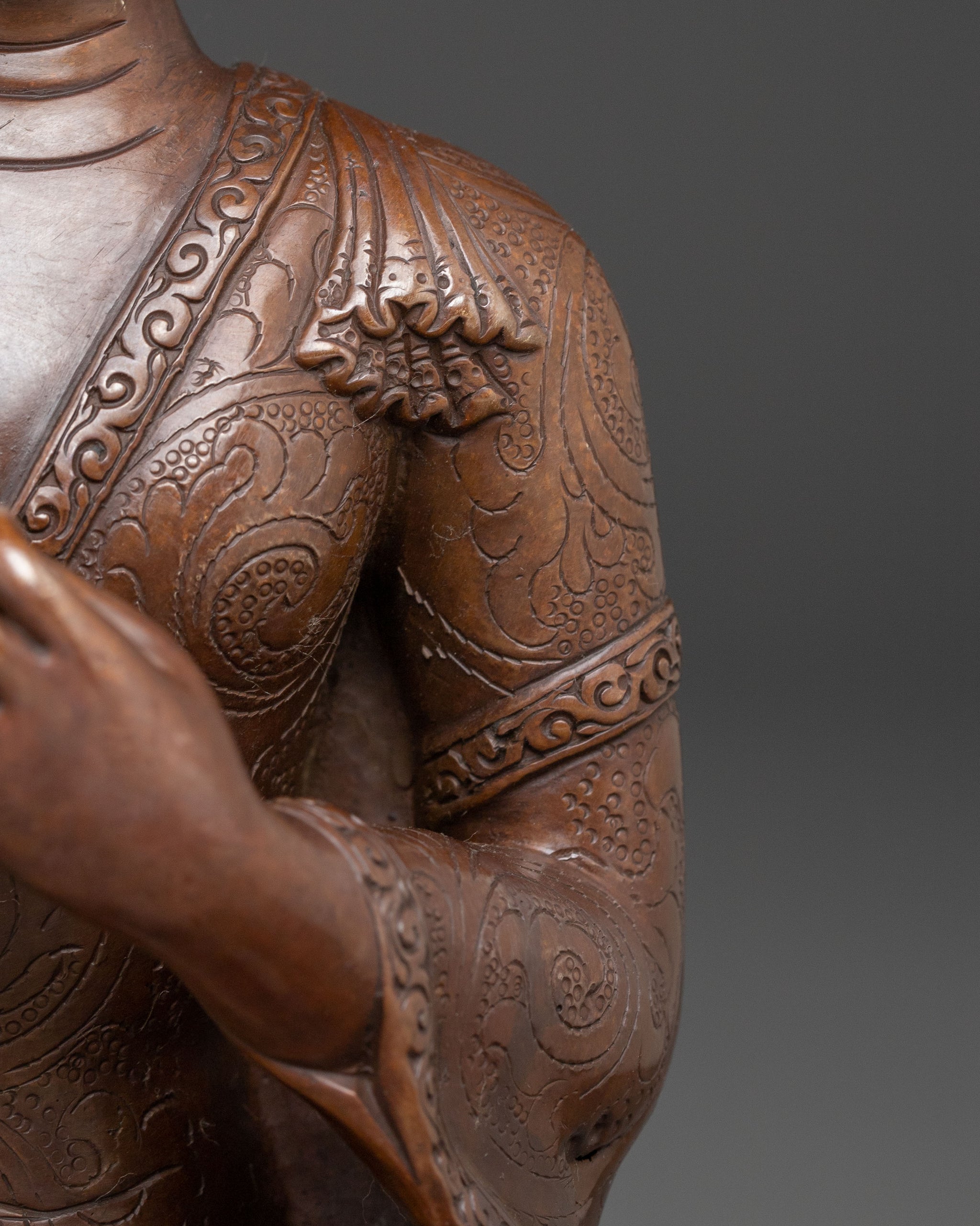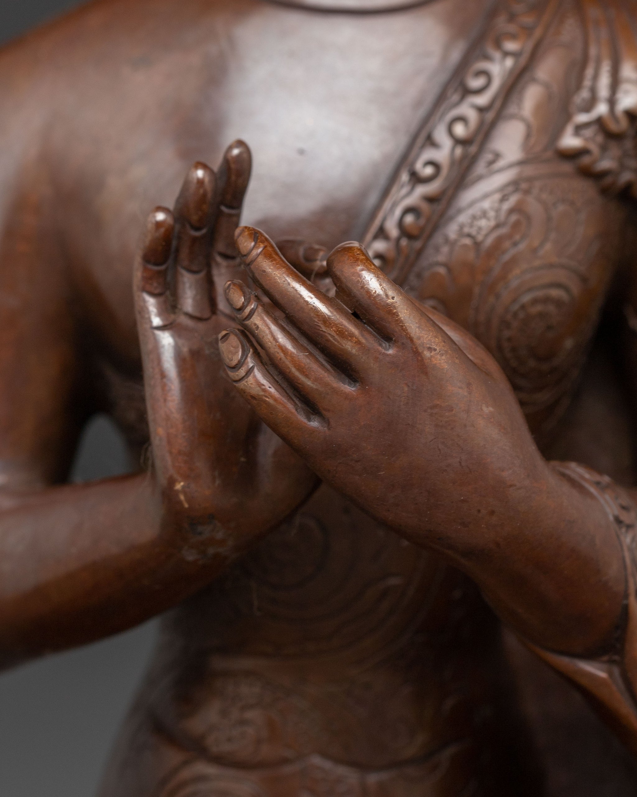This Vairocana Statue, representing the Buddha of All Buddhas, stands at 9.4 inches (24 cm) in height and 6.3 inches (16 cm) at the base, weighing 1.39 kg. Made from oxidized copper, the statue features a rich, textured finish that highlights its intricate detailing and serene presence. Designed by talented Nepalese artisans, this detailed sculpture is ideal for altars, meditation areas, or as a meaningful decor item for individuals seeking awareness in their daily life.