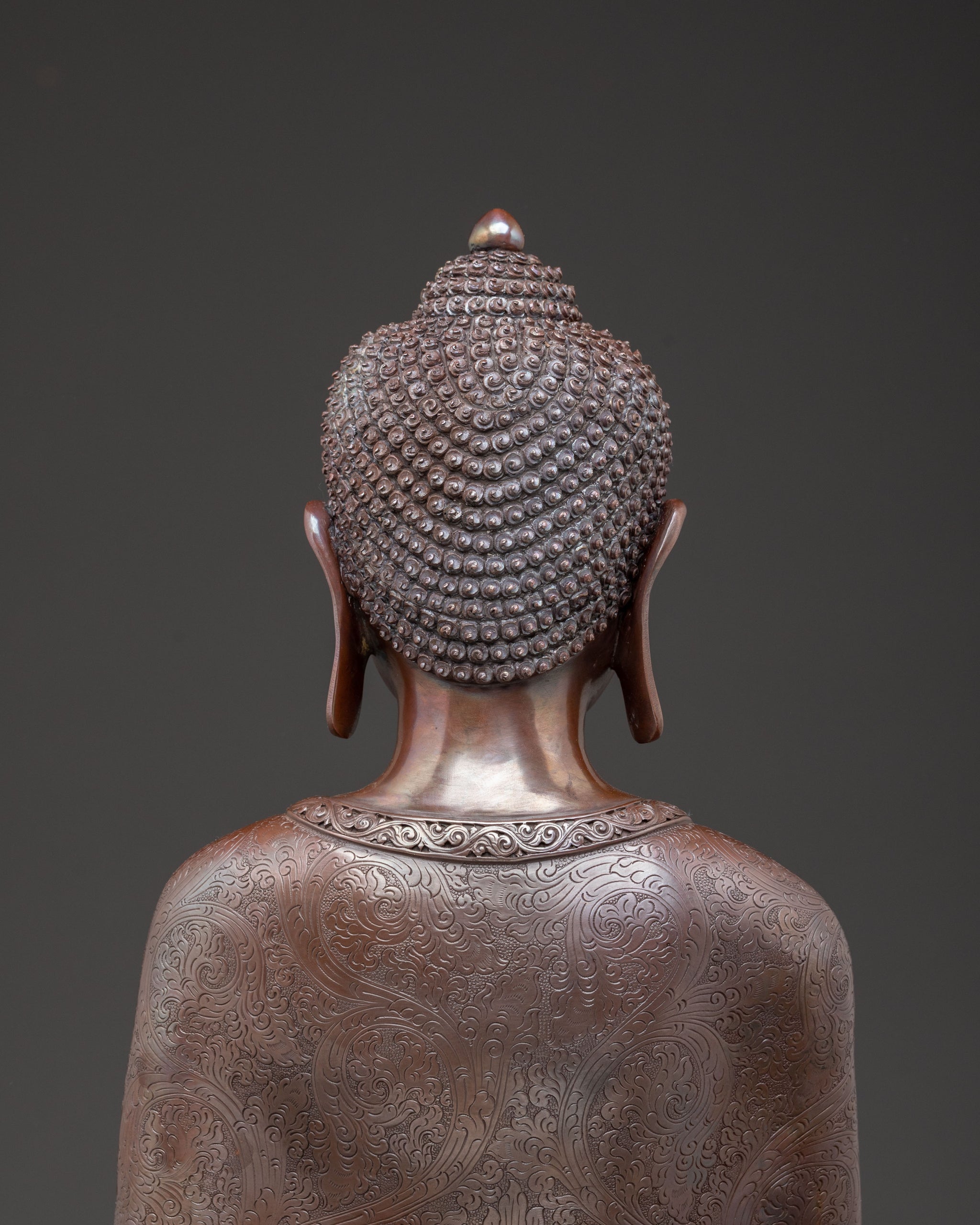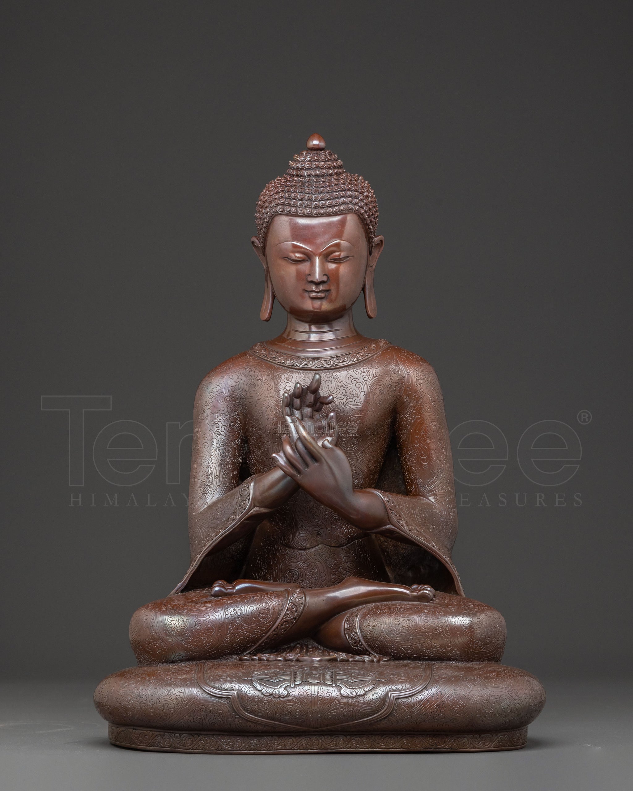 Arising from the heart of Nepal, this majestic Vairocana Tibetan statue presents a refined representation of the primordial Buddha. Handcrafted in oxidized copper, this sculpture radiates a profound sense of inner peace and enlightened presence. Standing at 40 cm tall with a 30 cm base and weighing 7.79 kg, it commands distinguished reverence, embodying both sublime artistry and deep spiritual meaning—an authentic piece of Buddhist art.