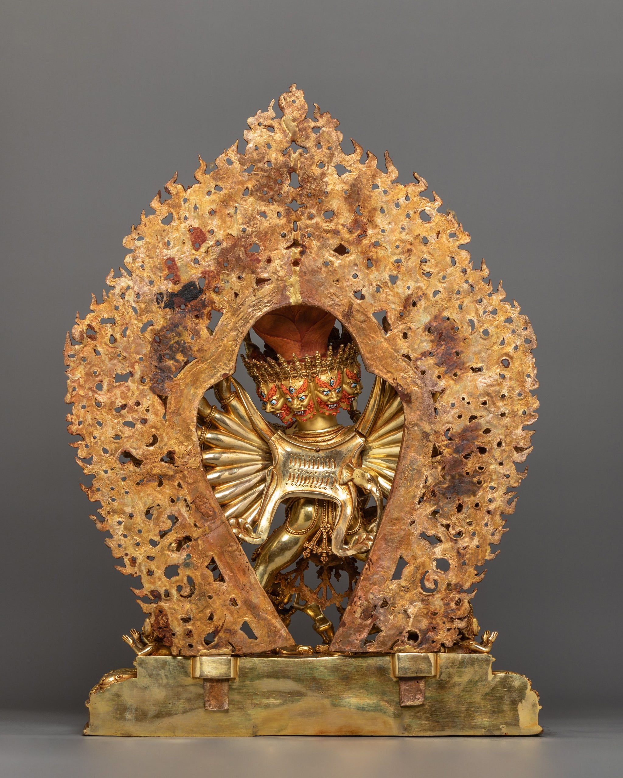 This Yamantaka or Vajrabhairava statue, measuring 23.6” (60 cm) in height with a 17.3” (44 cm) base, is a representation of the wrathful manifestation of Manjushri, the Buddha of Wisdom. Crafted from a copper body and adorned with 24K gold gilding, it exudes both power and radiance. Enhanced by gold and acrylic paintings, brings out the spiritual depth of Vajrabhairava. Designed by talented Nepalese artisans, this detailed sculpture is ideal for altars, meditation areas, or as a meaningful decor item for individuals seeking awareness in their daily life.