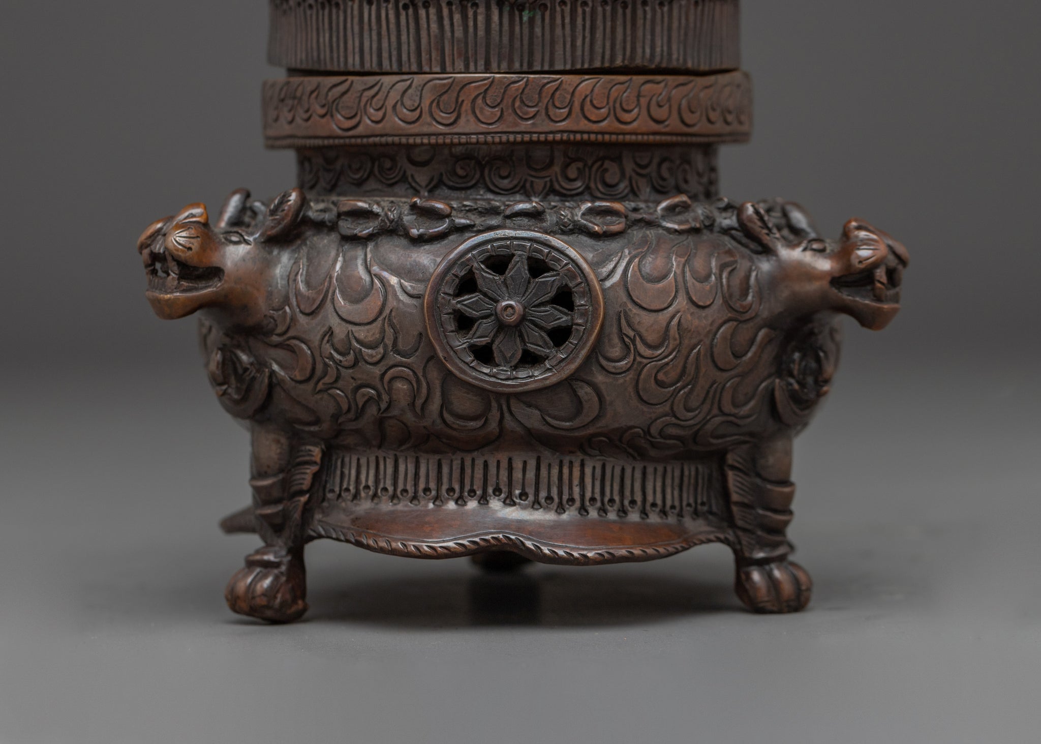 Traditional Himalayan workmanship is displayed in every detail, including the flame patterns, the coiled snakes, and the base adorned with a Dharma wheel. For Vajrayana practitioners who conduct fire pujas (homas) or for anybody looking for a striking spiritual focal point infused with transformational and protecting energy, this item is perfect.