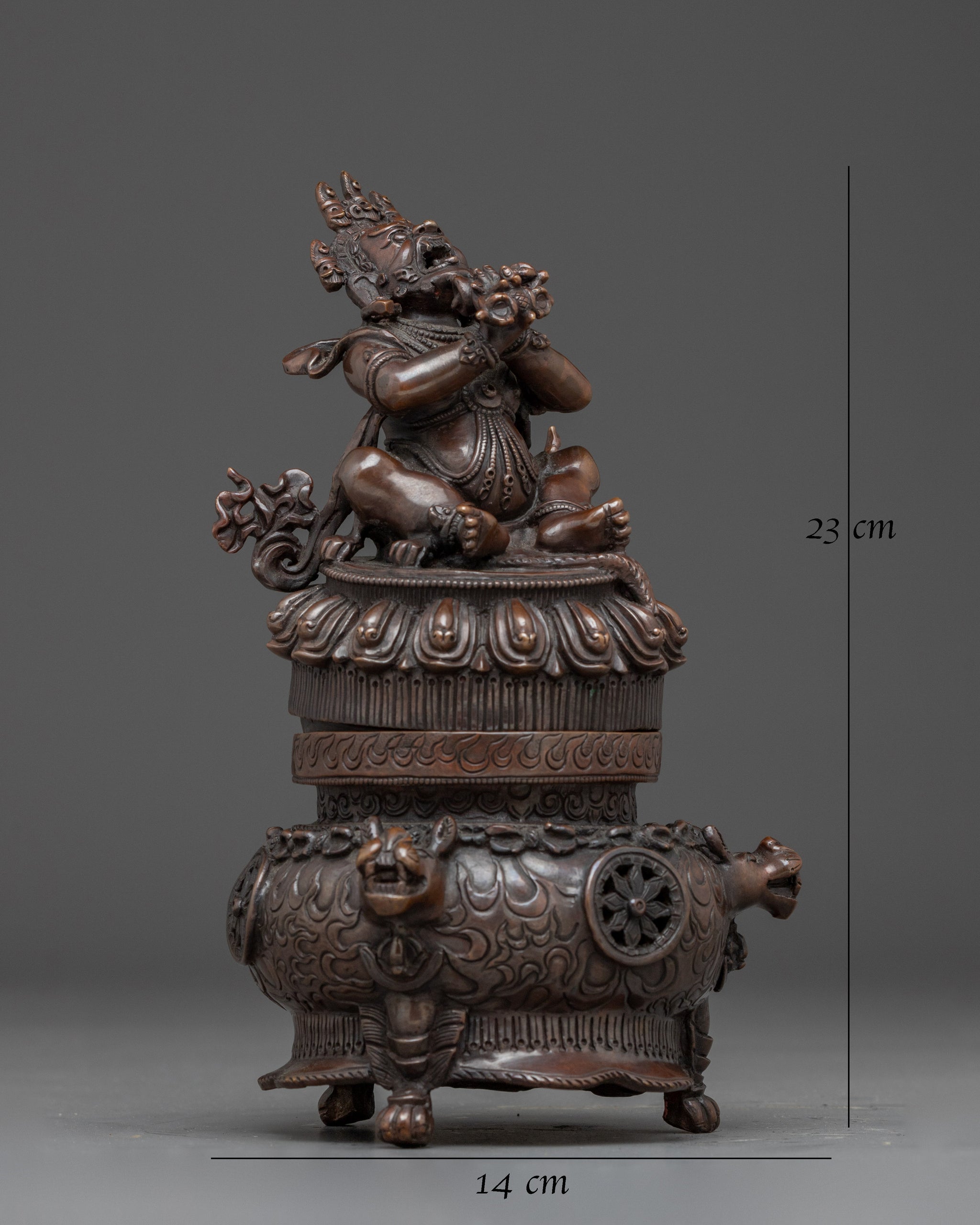 With this powerful statue of Vajradhaka made of oxidized copper, an admired representation of fierce compassion and wrathful insight, you can bring about change and destroy inner obstacles. This 9.1-inch oxidized copper figure, which is seated on a ceremonial cauldron base, represents the god in the middle of purification, blowing the fire of waking out of his lips to represent the purification of karmic impurities.