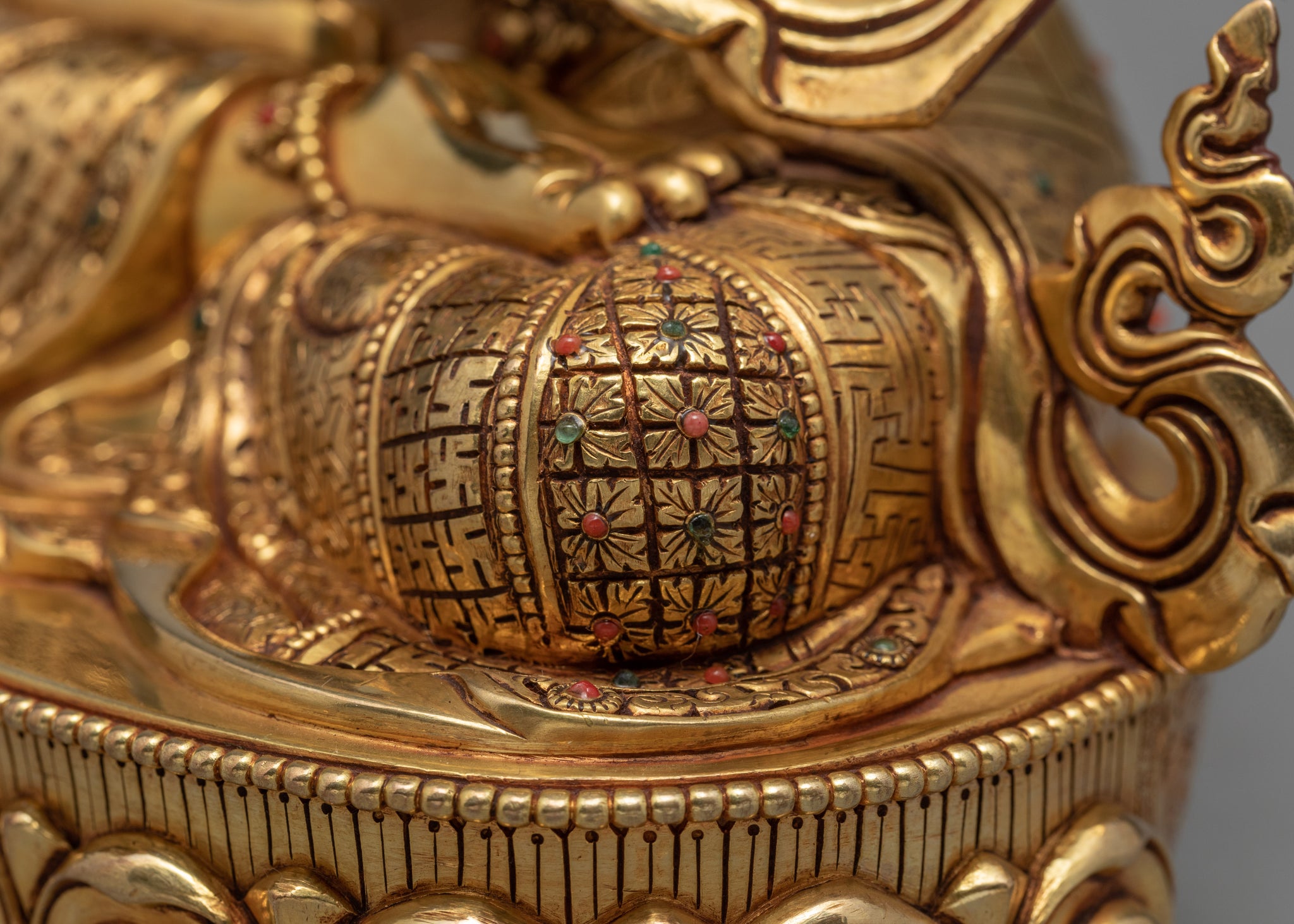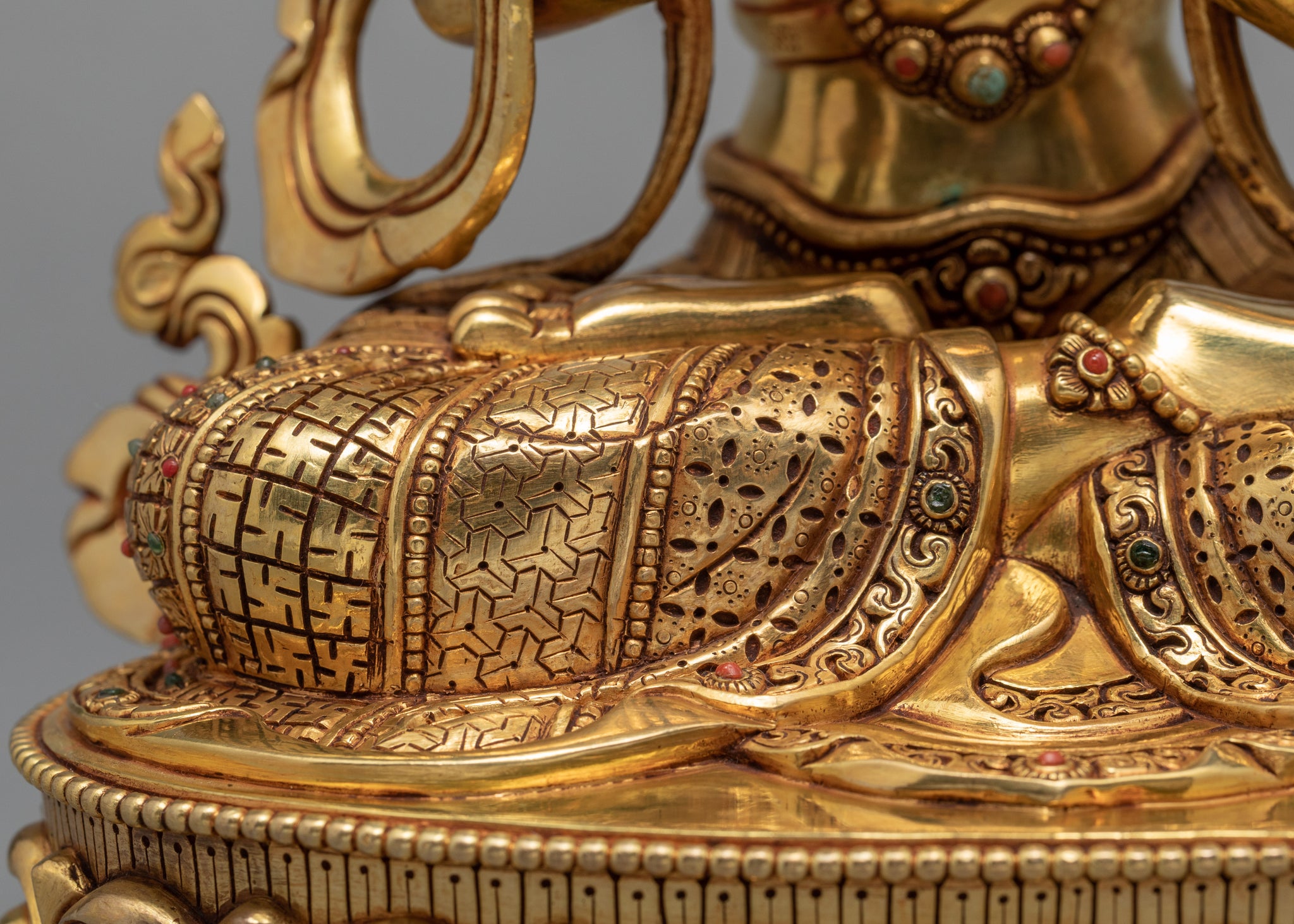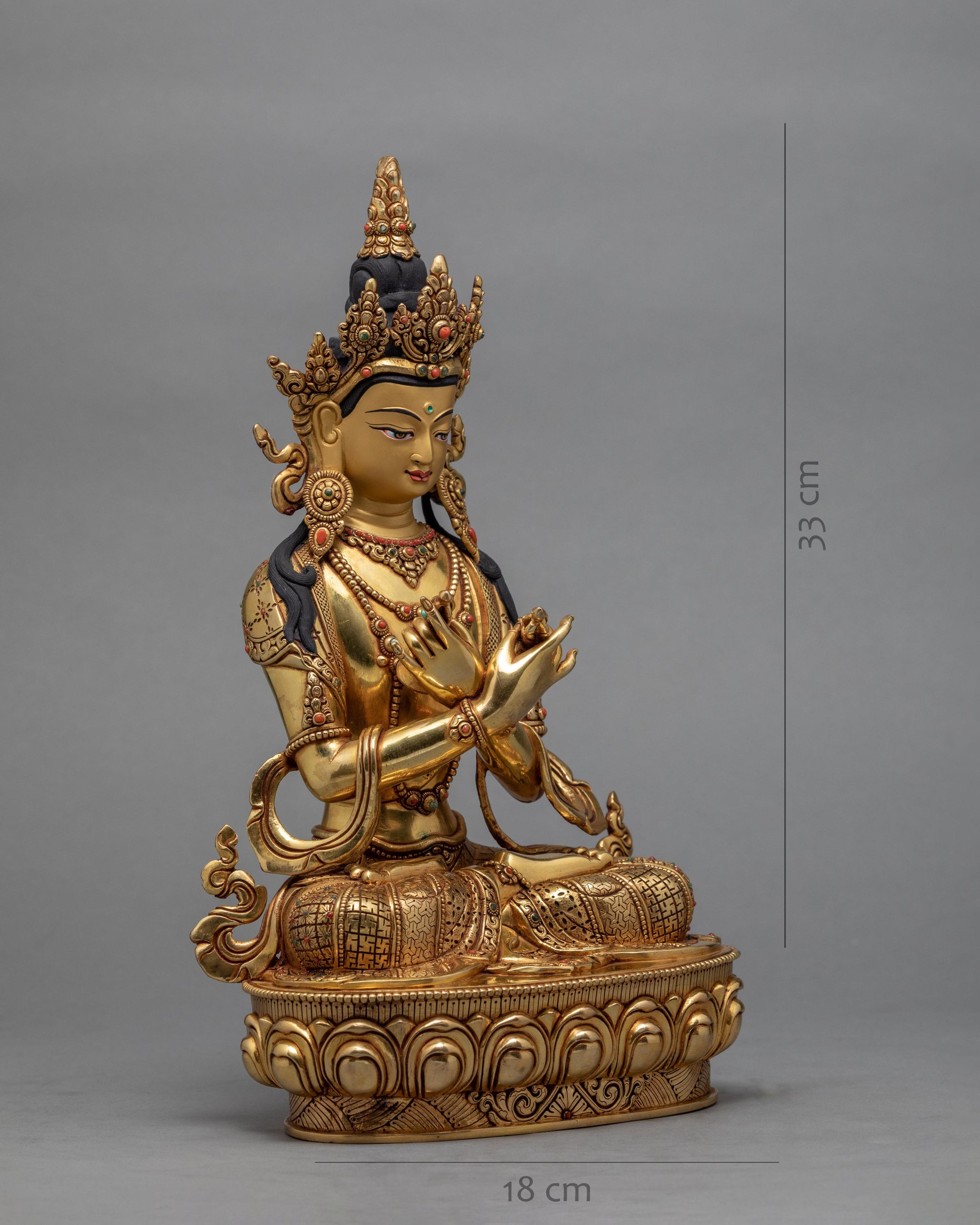 Vajradhara is the primordial buddha, the dharmakaya buddha. In the statue he is represented seated, with his legs locked and the soles of his feet apparent, and wearing the Bodhisattva crown. Vajradhara represents the essence of the historical Buddha 's realization of enlightenment .He is adorned with beautifully carved precious gemstones.