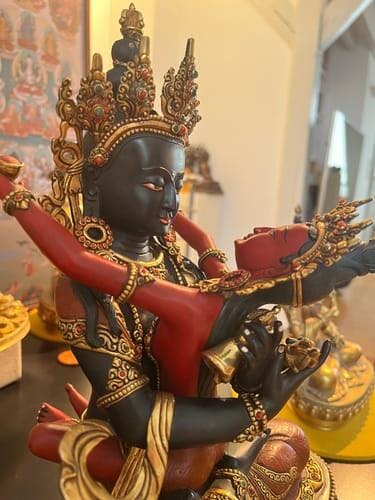 With our precisely constructed Vajradhara with Consort sculpture, you can discover the essence of spiritual harmony and supreme reality. This masterwork, which stands at 12.5" and weighs 4.17 kg, has very deeply engraved motifs and is embellished with 24k gold gilding and brilliant acrylic paints, with the blue color profoundly painted to manifest the genuine color of Vajrasattva. The combination of aesthetic brilliance and profound symbolism makes it an outstanding complement to your spiritual refuge or a spectacular focal point in your sacred art collection.