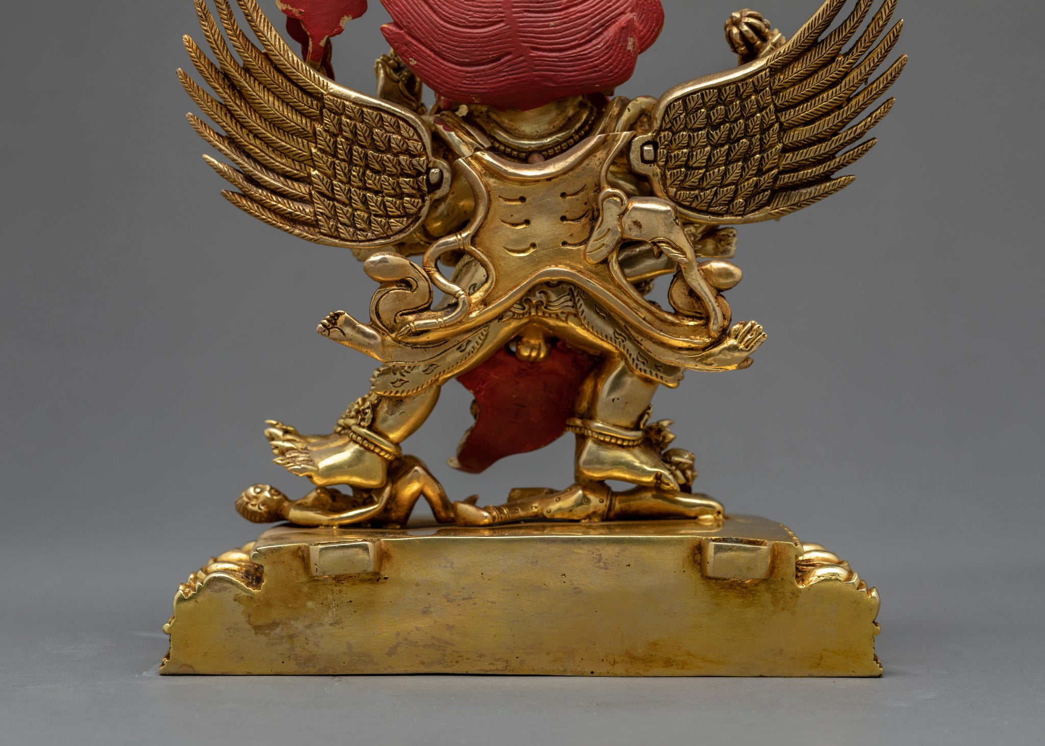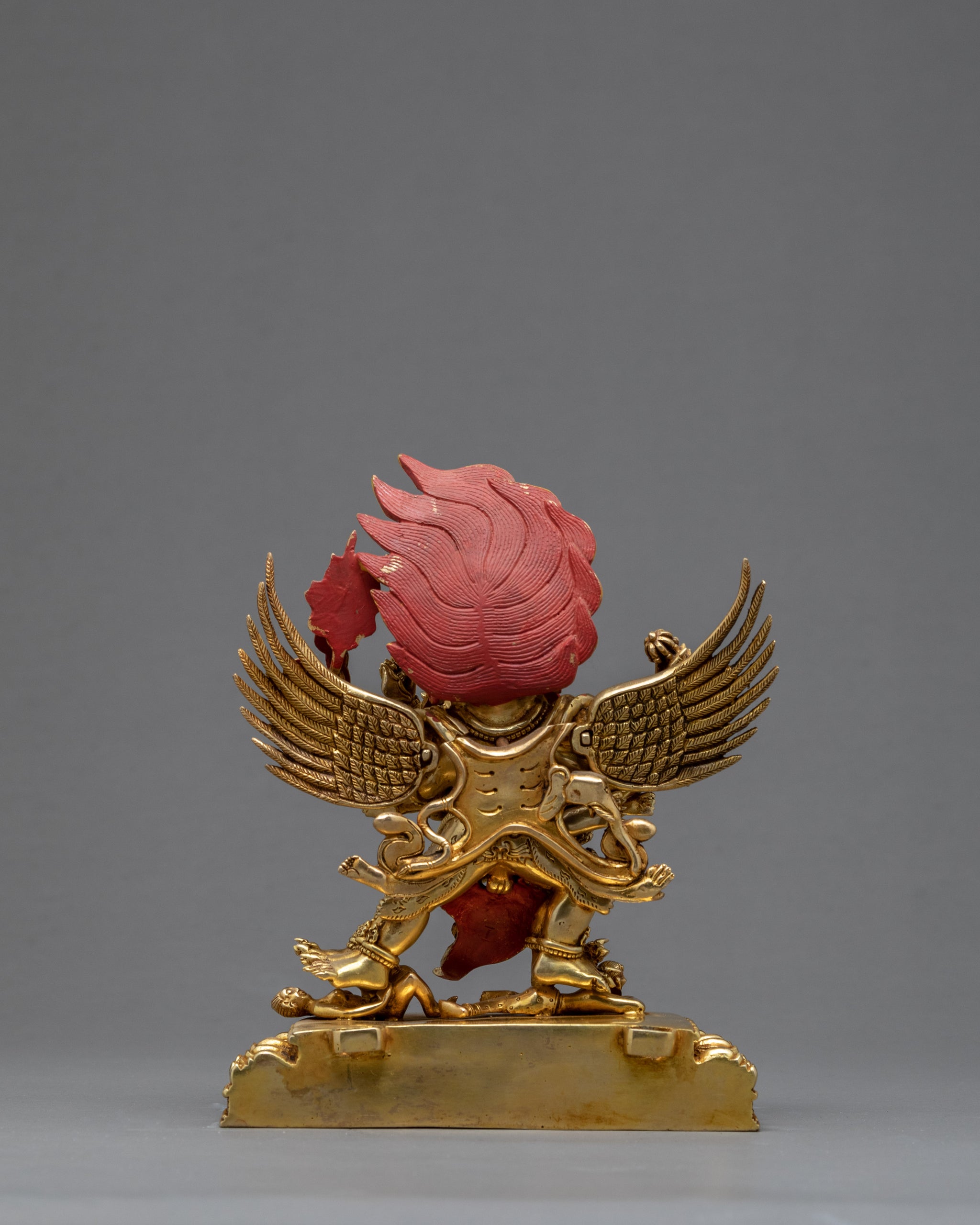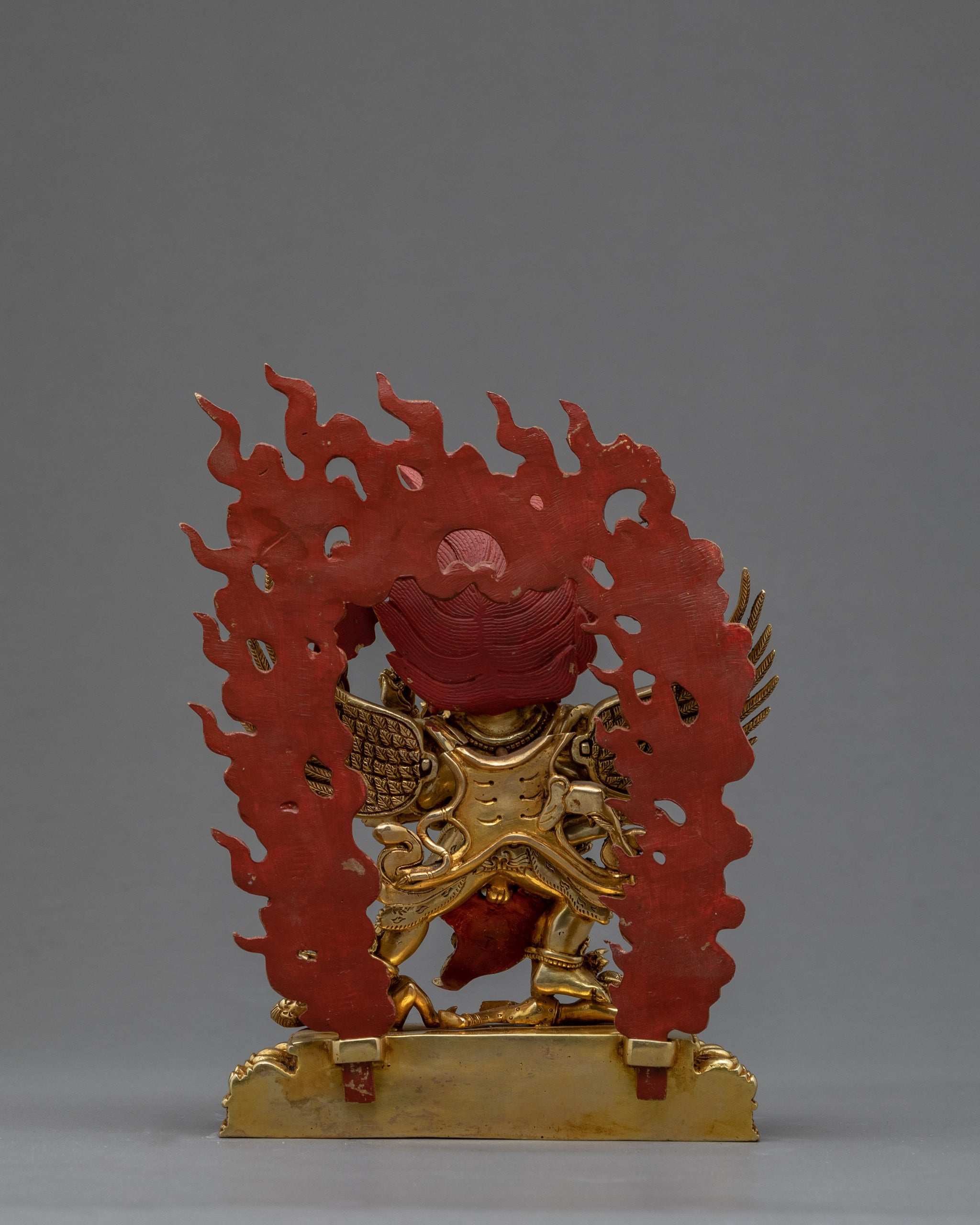 Vajrakilaya, also called Nyingma Yidam, has three heads, six arms, and two legs on the Vajrakilaya statue with his consort Khorlo Gyedunma. His two primary hands are wrapped around the consort's waist, which is the focal point of the figure. He wields the mystical phurba dagger, which has three blades and a magical moment, between his two hands. The phurba dagger's three blades remove one of the three fundamental impediments to spiritual awareness. Hatred, sensual desire and ignorance are the three obstacles. The three-pointed tip of the phurba blade also represents a point of public attention focused on the immense nothingness phenomena.Vajrakilaya (Dorje Phurpa), also known as Vajrakumara (Dorje Zhonu, Youthful Vajra), is the wrathful Heruka deity who embodies the enlightened activity of all the Buddhas. Vajrakilaya is one of the eight Heruka deities of the Nyingma tantras. Vajrakilaya is also the personal meditational deity of Guru Padmasambhava. He practiced meditation on Vajrakilaya when many obstacles manifested before his display of attaining enlightenment.