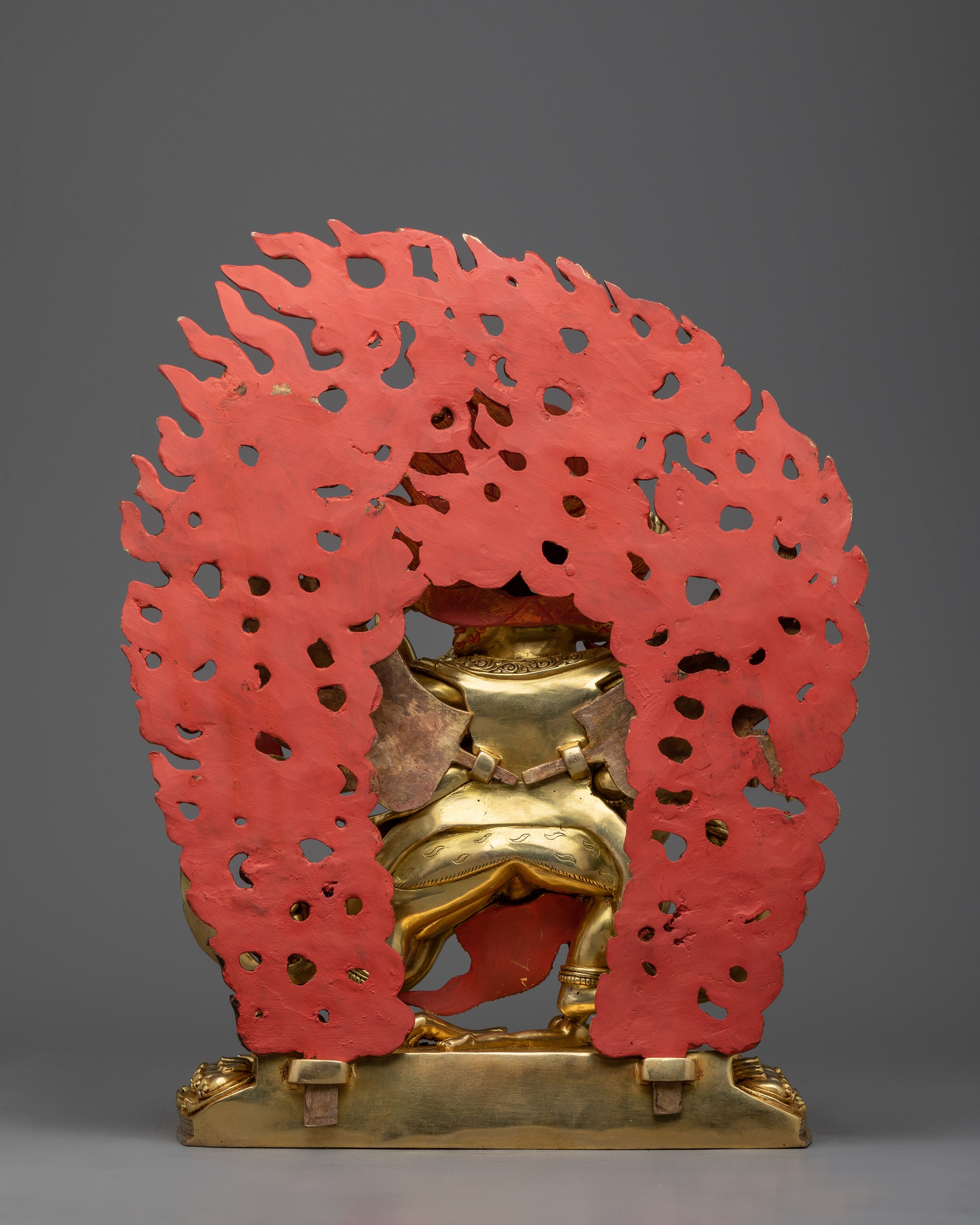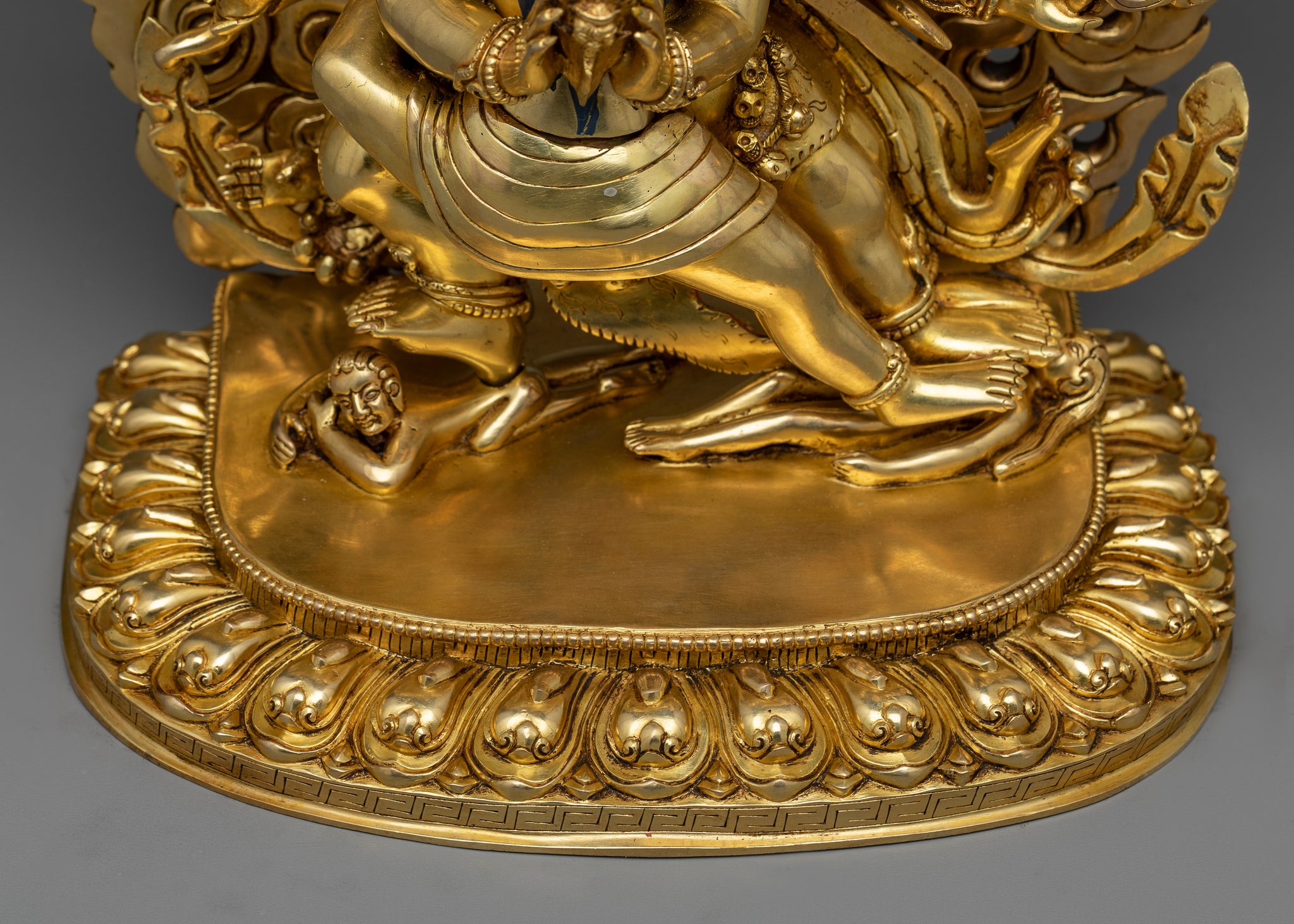This piece's meticulous craftsmanship portrays Vajrakilaya's wrathful yet loving personality. The deity's symbolic qualities are masterfully portrayed in this premium statue, including the kila to overcome ignorance, the skull cap to signify impermanence, and the serpentine garland to represent enlightened energy.