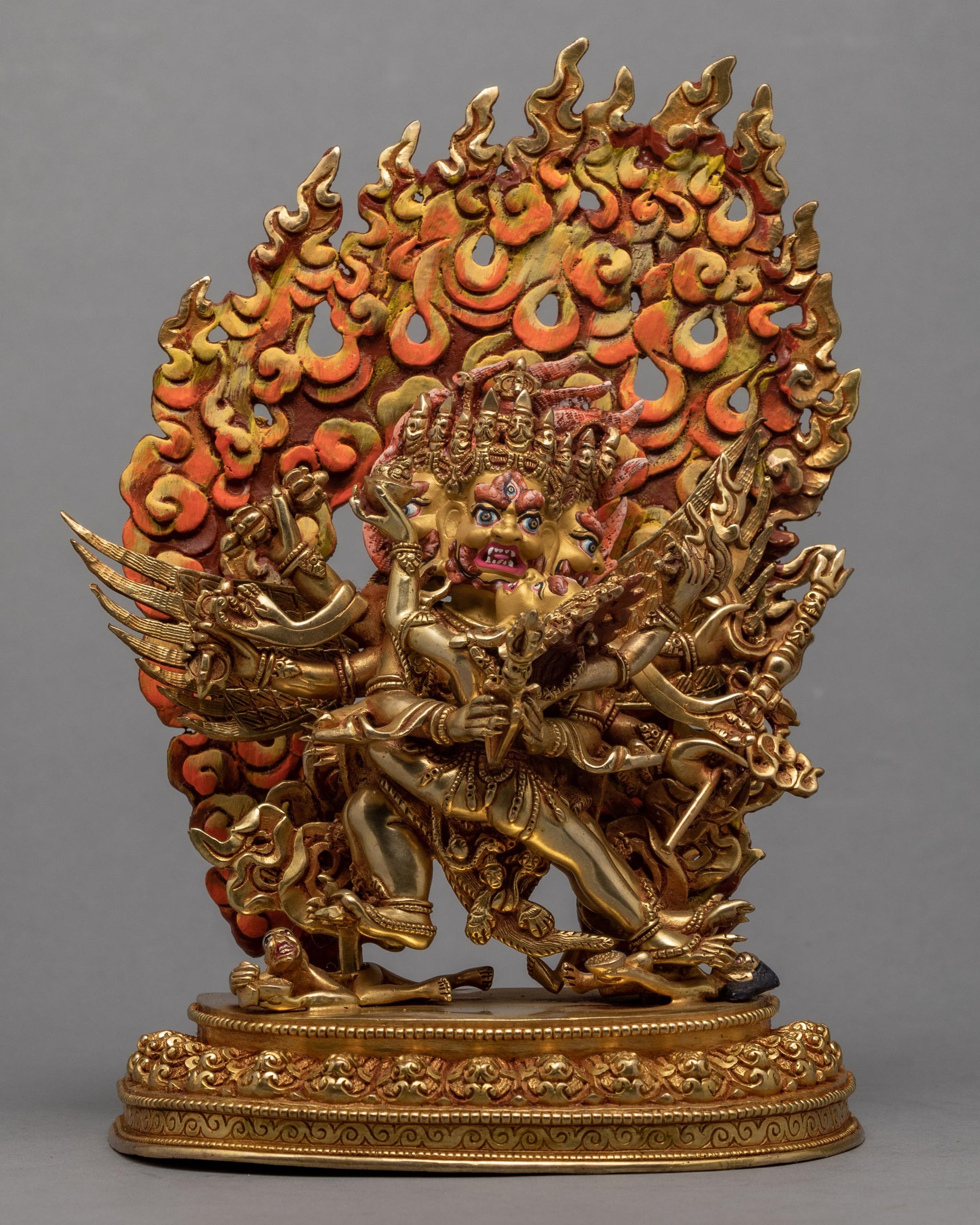 The statue of Vajrakilaya also called Phurba in Tibetan has three heads, six arms, and four legs on the Vajrakilaya statue with his consort Khorlo Gyedunma. His two primary hands are wrapped around the consort's waist, which is the focal point of the figure. He wields the mystical phurba dagger, which has three blades and a magical moment, between his two hands. The phurba dagger's three blades remove one of the three fundamental impediments to spiritual awareness. Hatred, sensual desire, and ignorance are the three obstacles. The three-pointed tip of the phurba blade also represents a point of public attention focused on the immense nothingness phenomena, The statue consists of triple-Layered Gold, 3D Embossed Carving with Deep Multi-Layered Engraving.