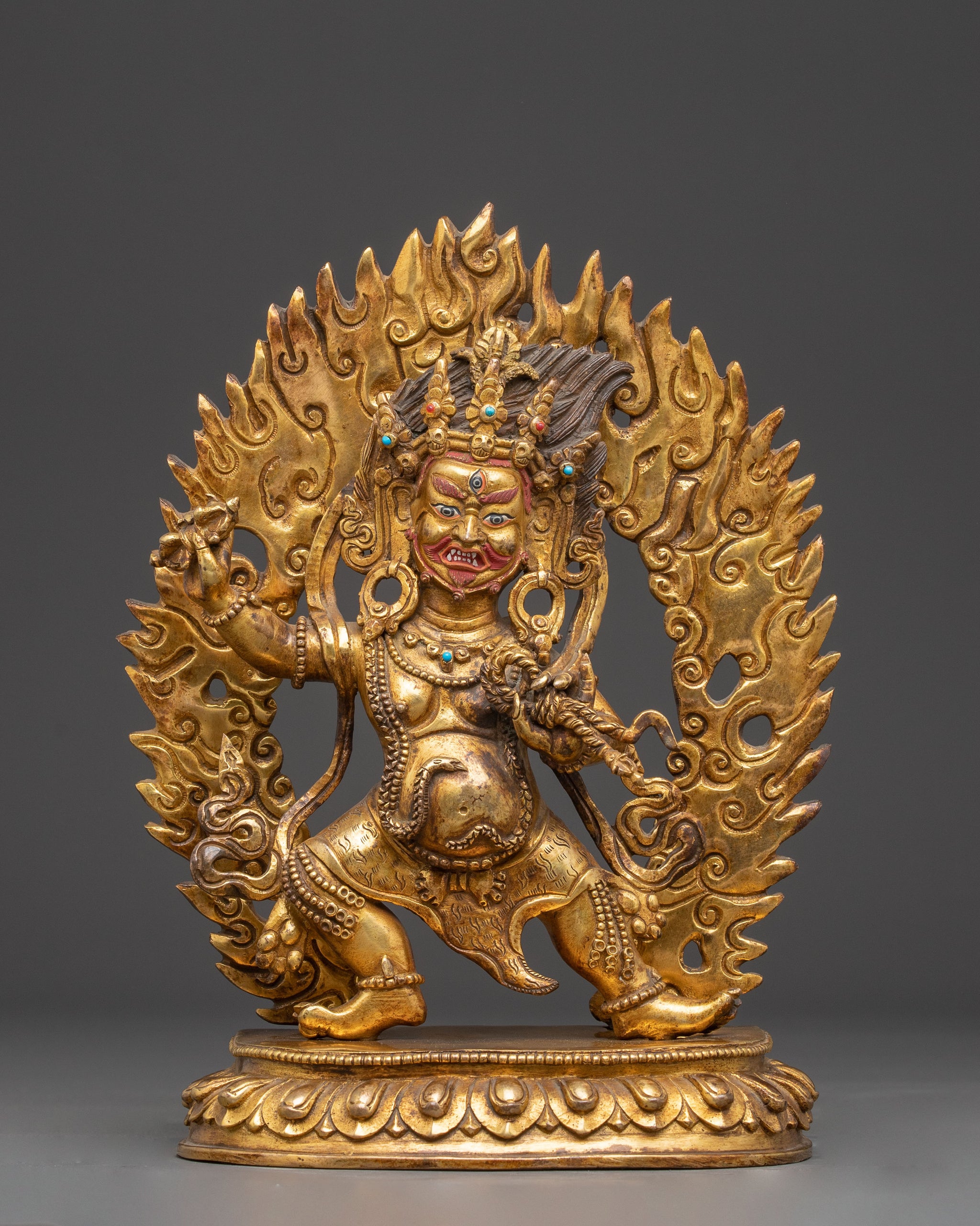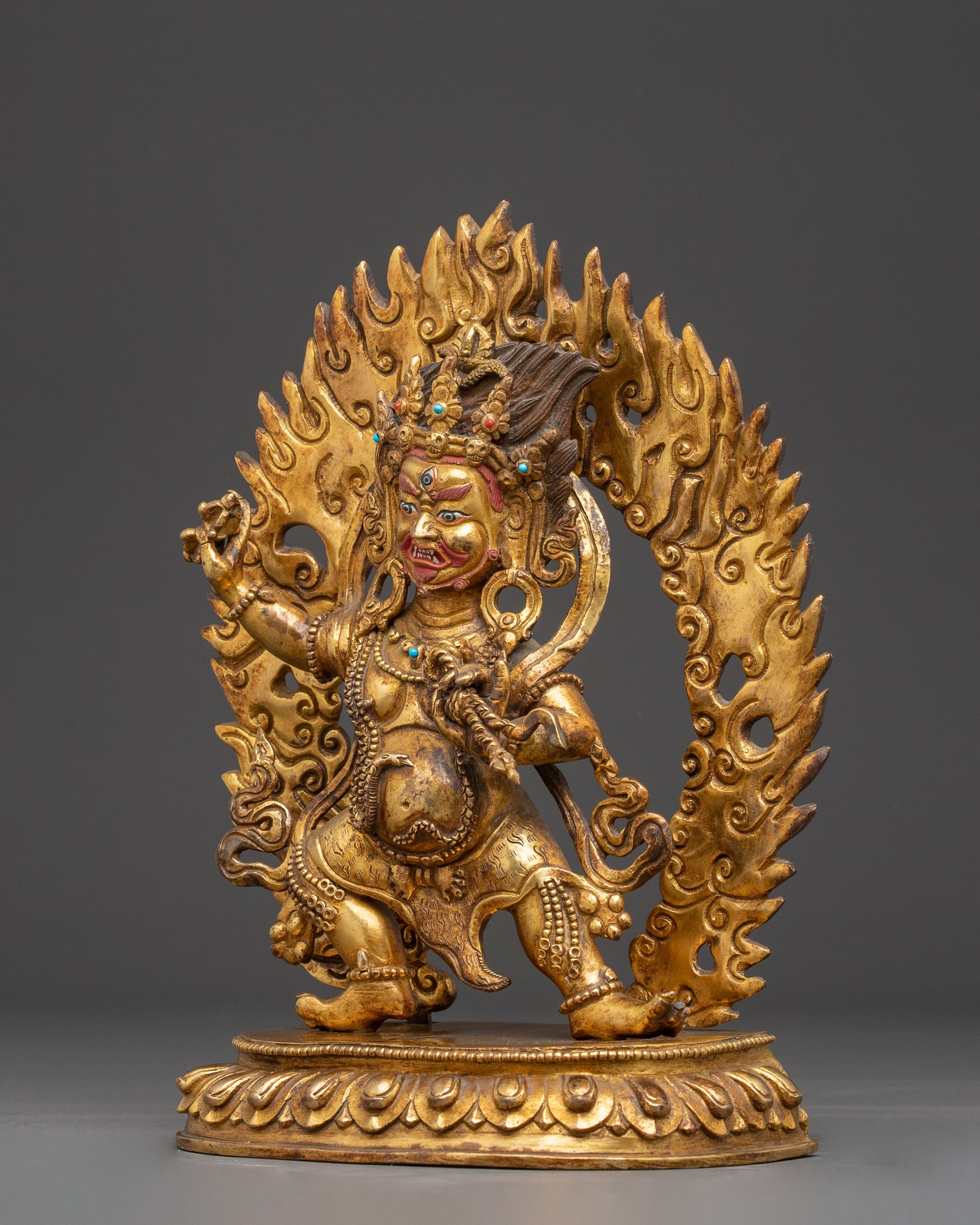 The wrathful face emphasizes his fierce protective nature, while the serene back face reveals his compassionate essence. Vajrapani holds a vajra (thunderbolt scepter) in his right hand, symbolizing indestructible strength and spiritual power. In his left hand, he holds a lasso, representing his ability to bind and remove harmful forces. A third eye of wisdom on his forehead signifies his ability to see through illusion and gain ultimate knowledge. Depicted in alidhasana (dynamic posture), he stands firmly on a subdued evil force, symbolizing his triumph over ignorance and negativity. His crown, adorned with five skulls, represents the transformation of the five poisons (ignorance, attachment, aversion, pride, jealousy) into wisdom. The halo behind him is adorned with conch shells, symbolizing the spread of the Dharma, and features three eyes, signifying his all-seeing awareness.