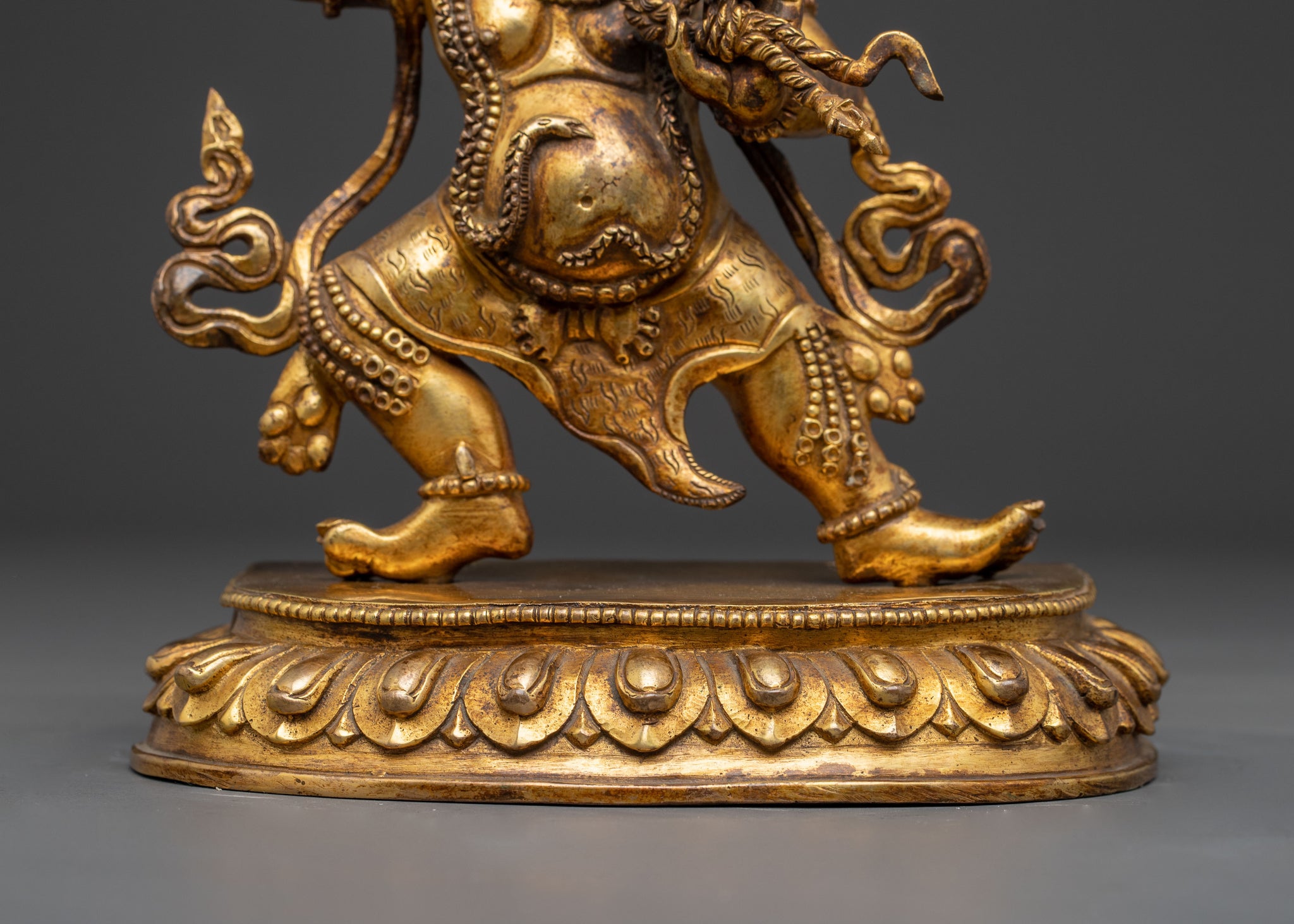 This Vajrapani Art, Divine Protector of the Buddha, represents the mighty Bodhisattva who embodies all Buddhas' power. This sculpture, which measures 10" (Height) x 7.7" (Base) and weighs 2.10 kg, is handcrafted from copper, covered with a 24K gold gilding. This sculpture, handcrafted by expert Nepalese artisans, elegantly symbolizes Himalayan Buddhism's sacred traditions, making it an appropriate addition to altars, meditation places, or sacred collections.