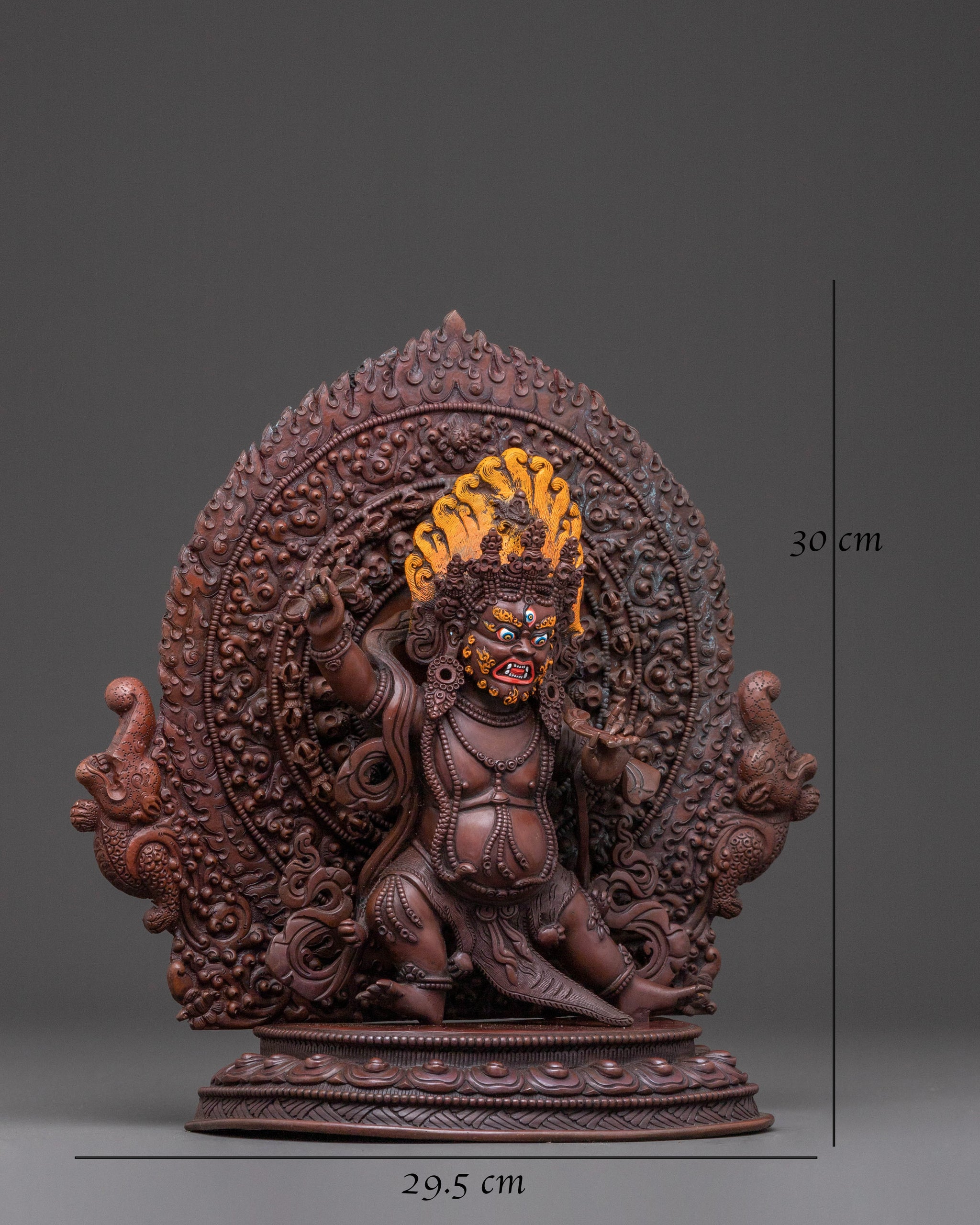 This Vajrapani Blessing statue stands at 11.8 inches (30cm) in height with a base measuring 11.6 inches (29.5cm) and weighs 2.74 kg. Crafted from an oxidized copper body and enhanced with acrylic paintings, this piece reflects authentic Himalayan craftsmanship. Handcrafted in Nepal by skilled artisans, it is ideal for personal altars, meditation spaces, or as a focal point of sacred décor.